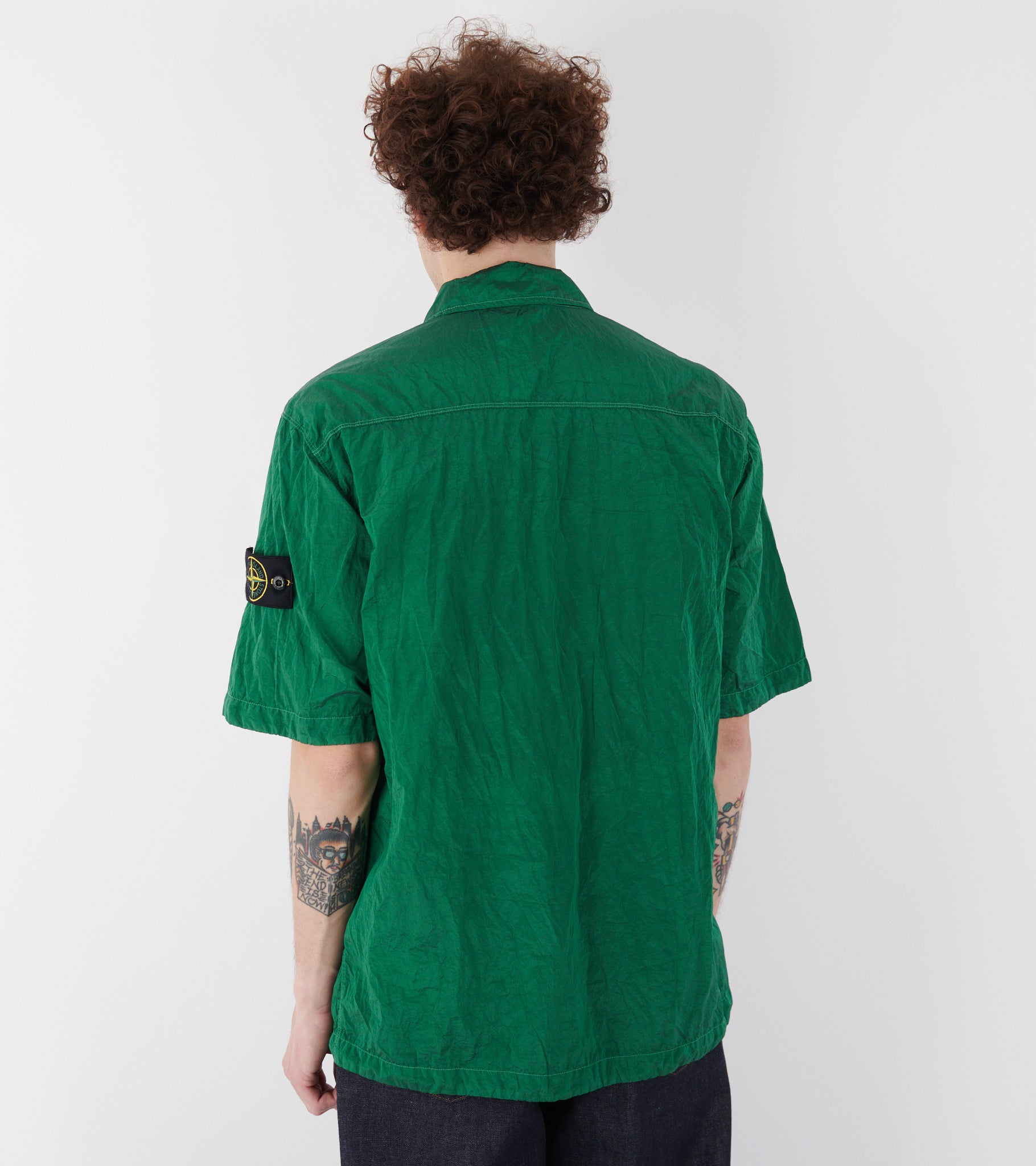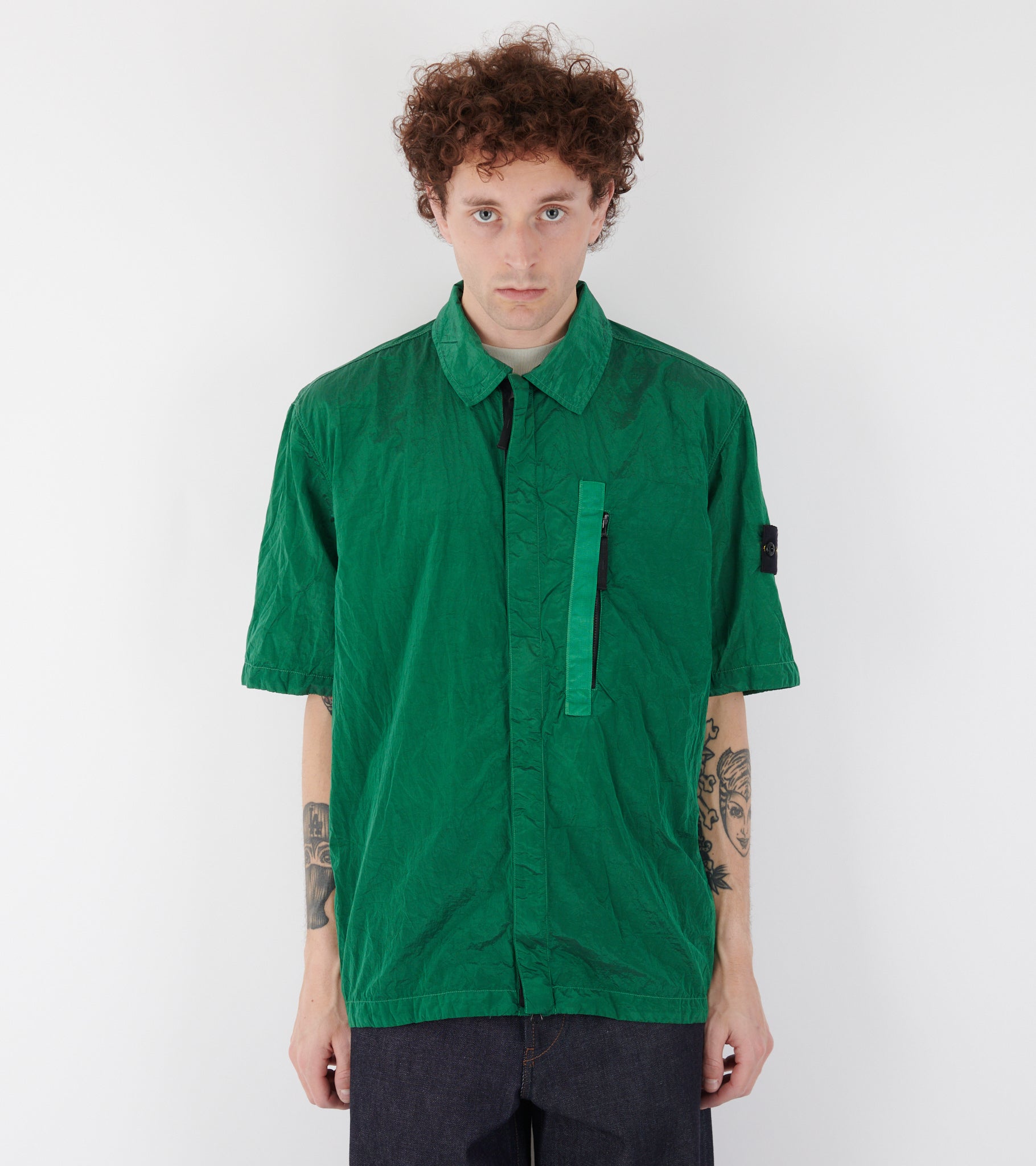 Short-sleeved green shirt from Stone Island. This shirt is made in a slightly shiny 'crinkle' Econyl nylon quality and has a classic collar, a hidden two-way zip closure and a zip pocket at the left chest. On the left sleeve is the iconic Stone Patch.
