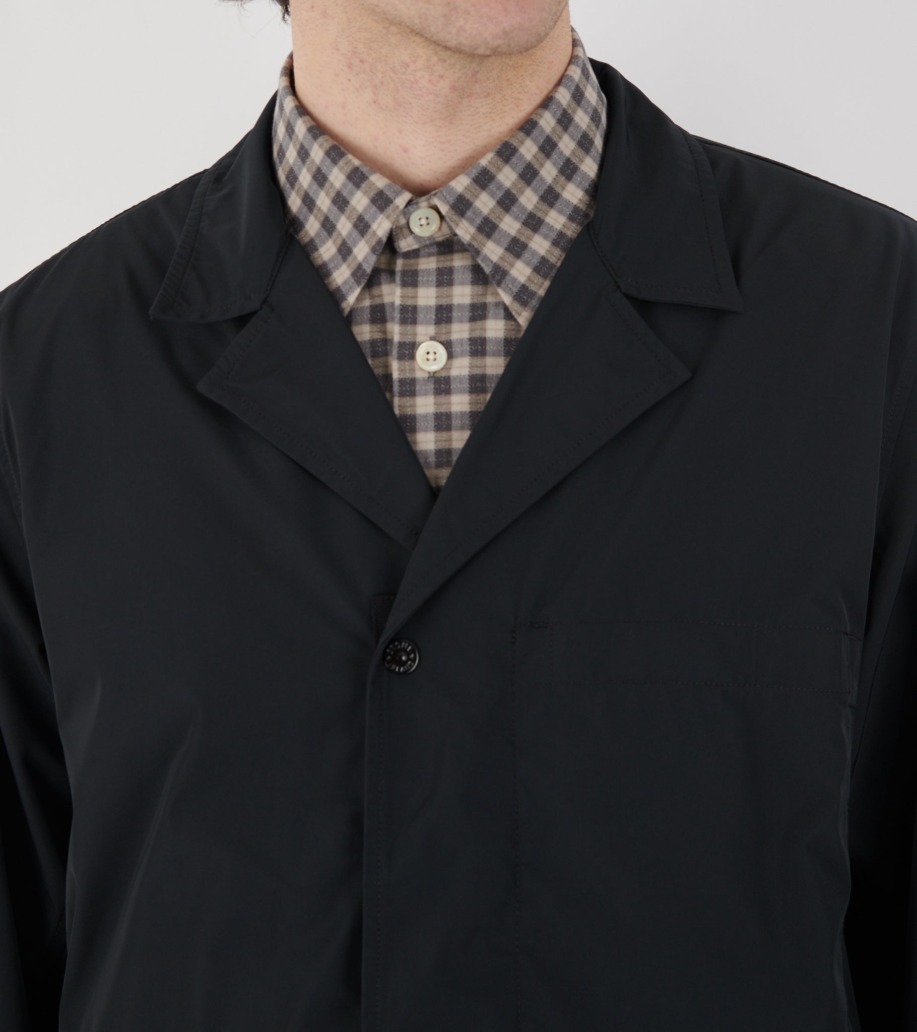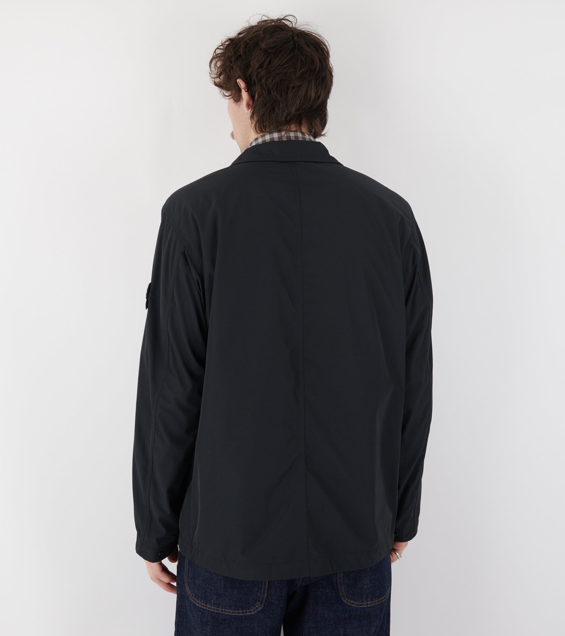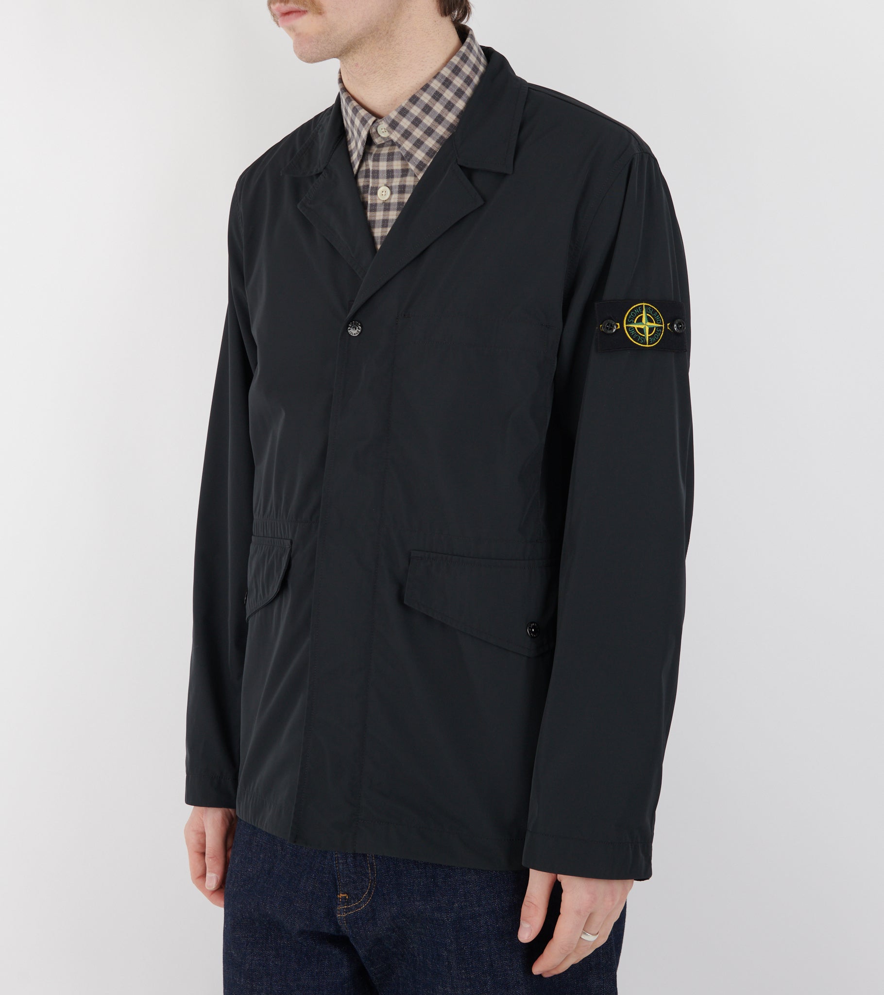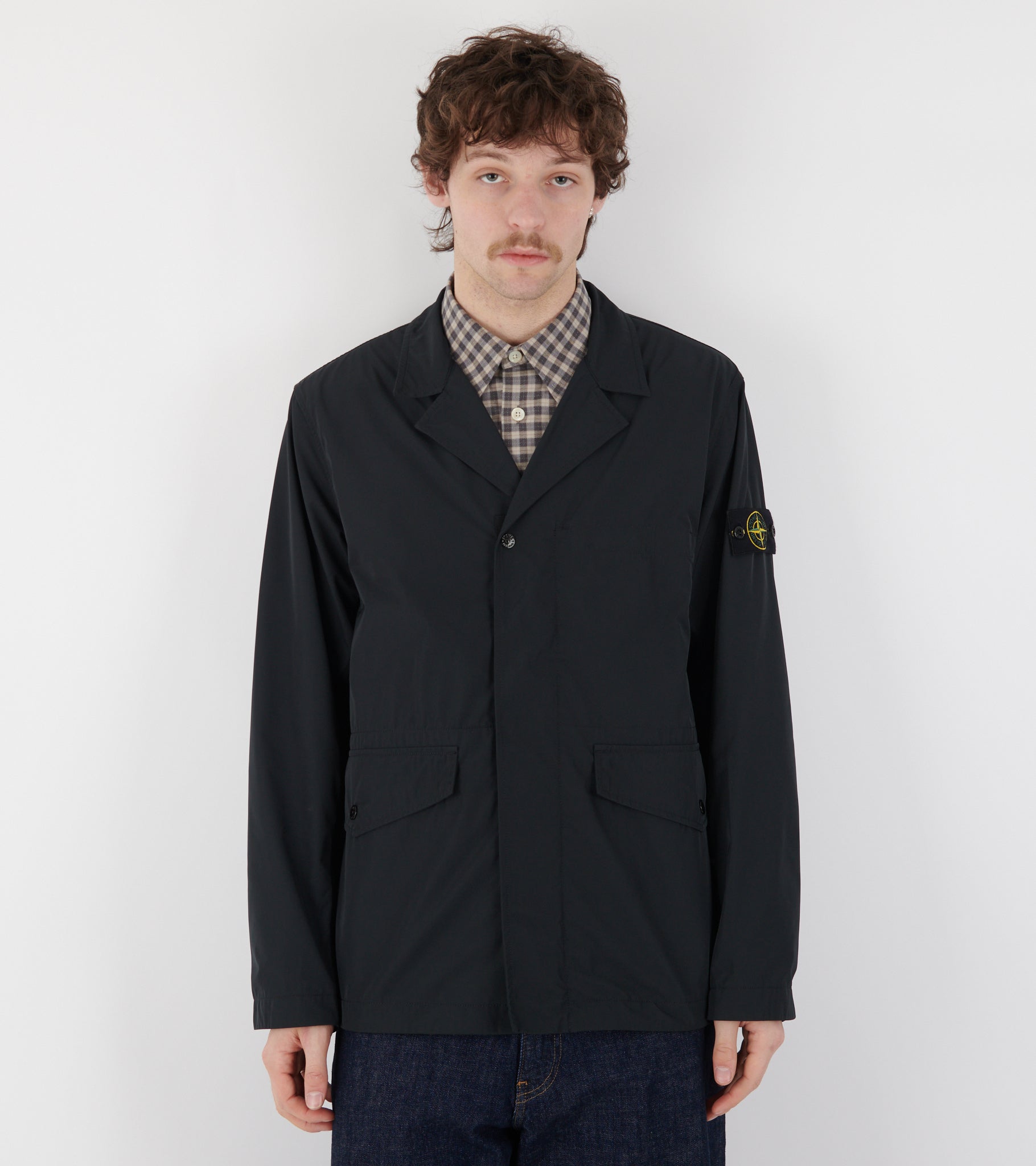 Black jacket in a micro twill polyester quality from Stone Island. The jacket has an open collar, two pockets on the front, a hidden two-way zip closure and a hidden snap closure with black logo buttons. On the left sleeve is the iconic Stone Patch.