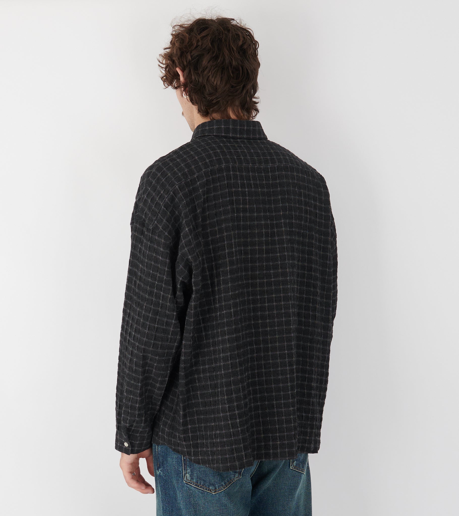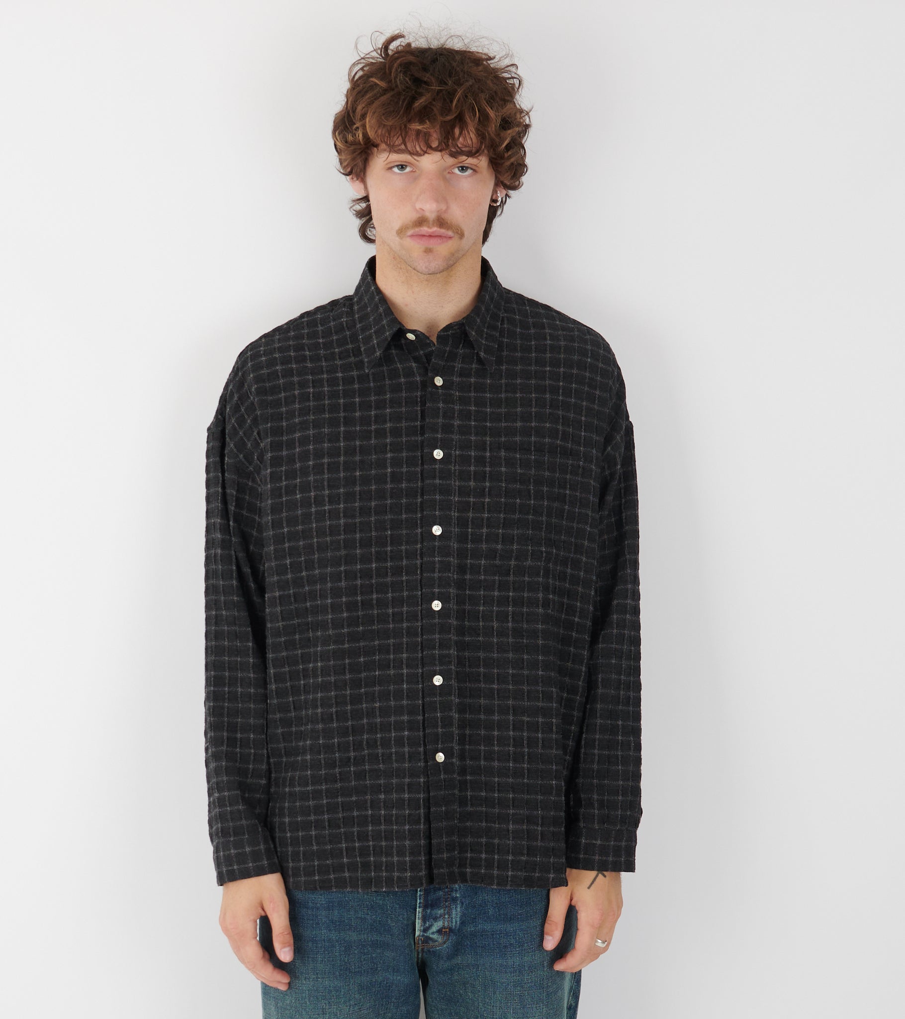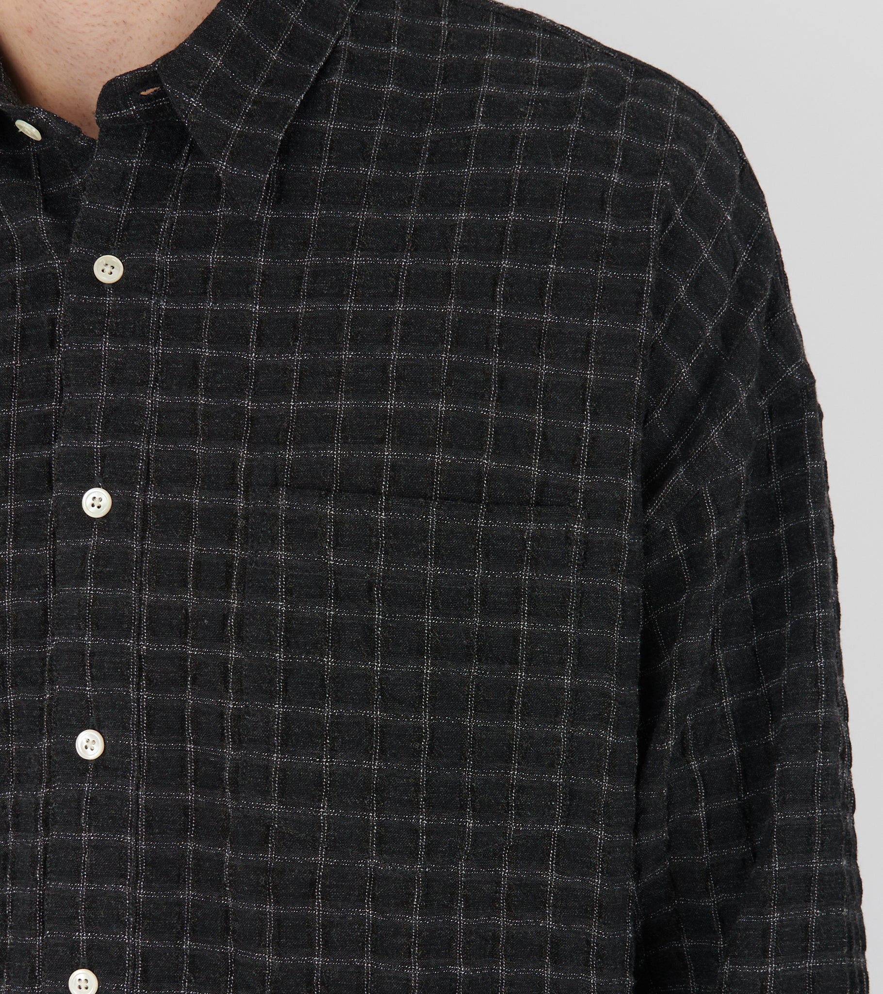 Black checkered shirt from Sunflower. The shirt has a slighty pointed collar, a chest pocket and a button closure with mother-of-pearl buttons.
