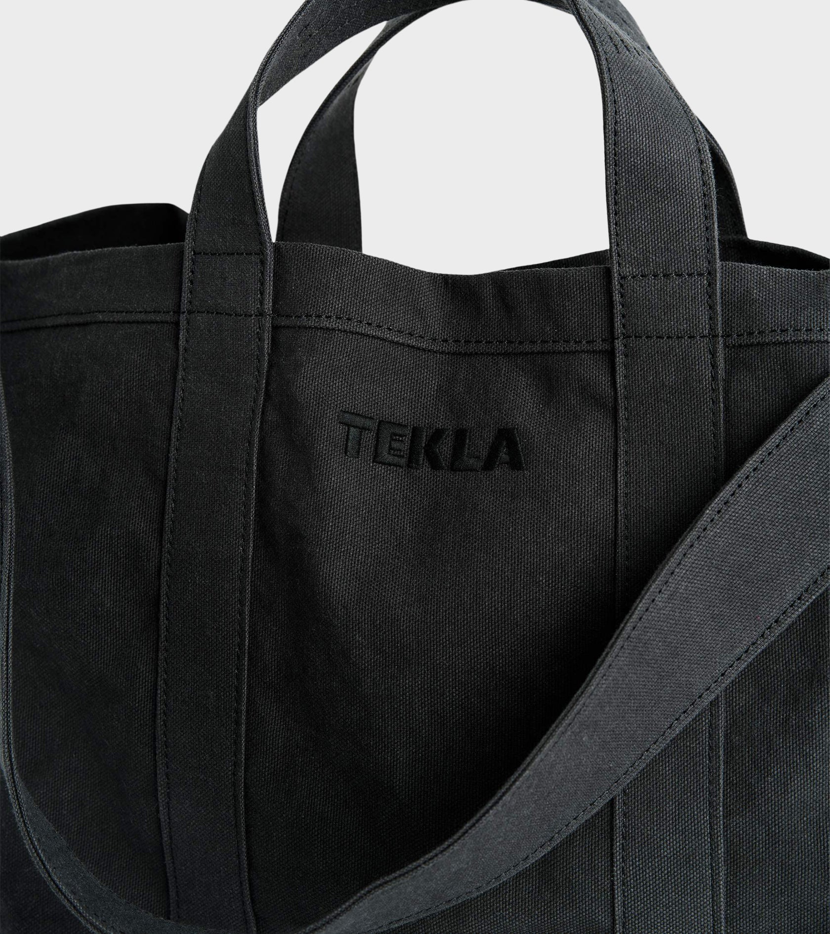 Beach bag from Tekla in the color 'Black Sand'. The bag is made of organic cotton canvas and has a long shoulder strap and two slightly shorter straps. The bag has one large central compartment, an interior zipper pocket and an embroidered logo on the front.