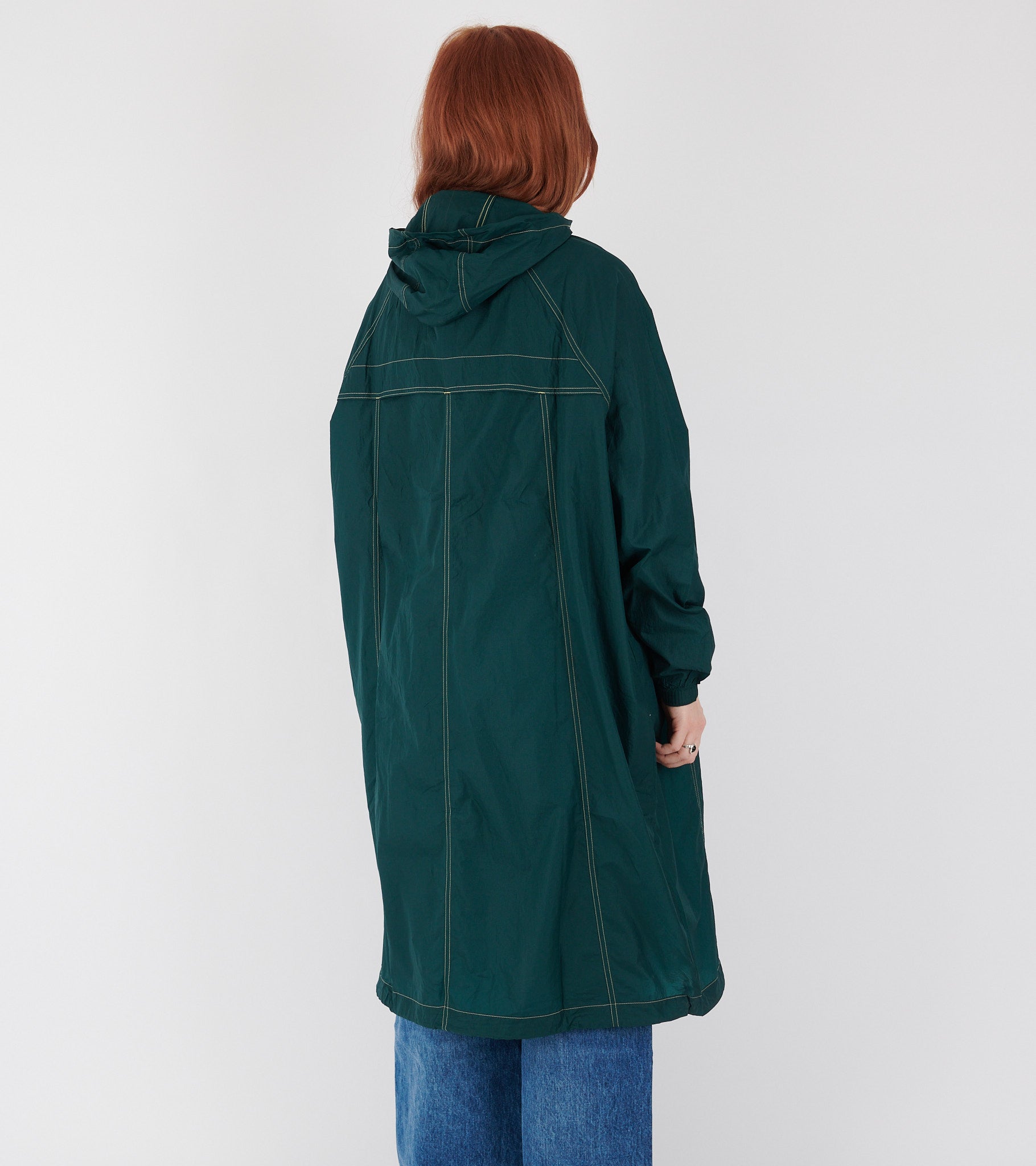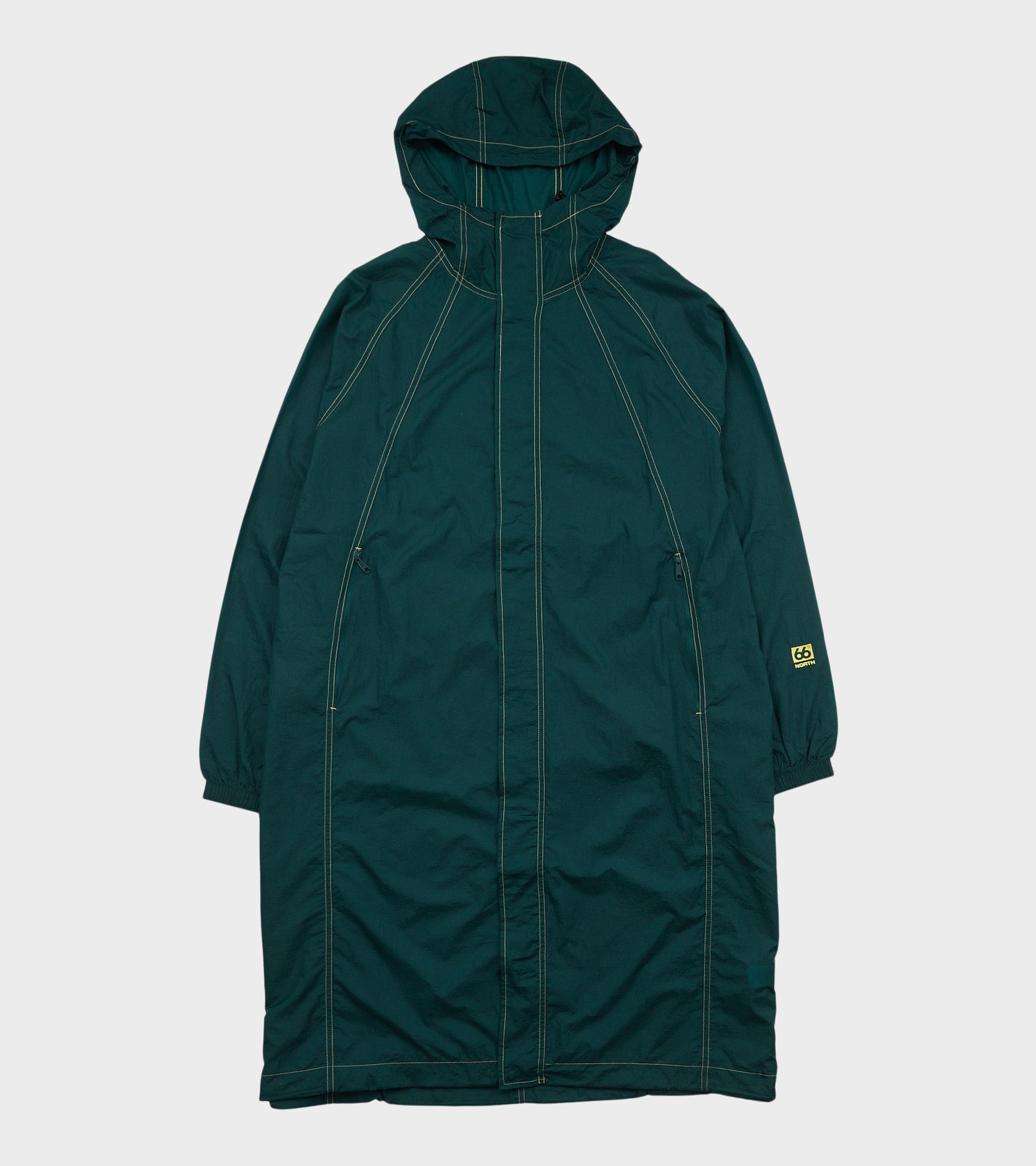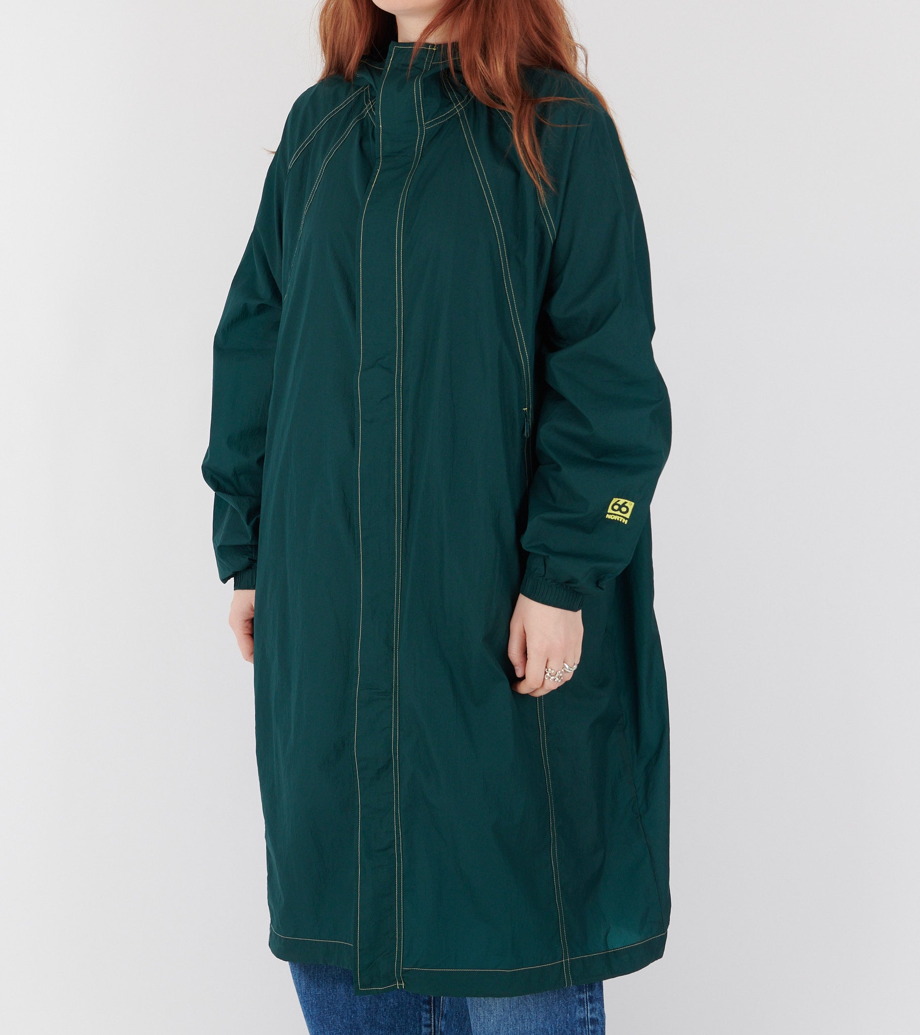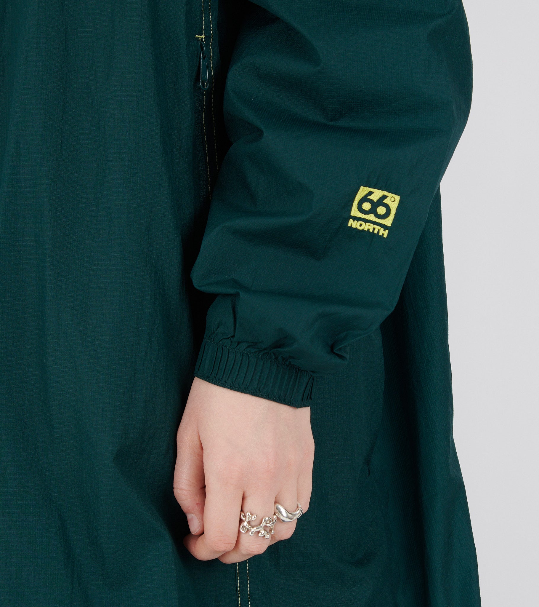 Dark green oversized coat in recycled nylon from 66 North. Raudasandur Coat has visible yellow stitchings, a classic hood and a slanted pocket on each side. The coat has a hidden zipper and snap closure. The coat has a yellow logo embroidered on the left sleeve.