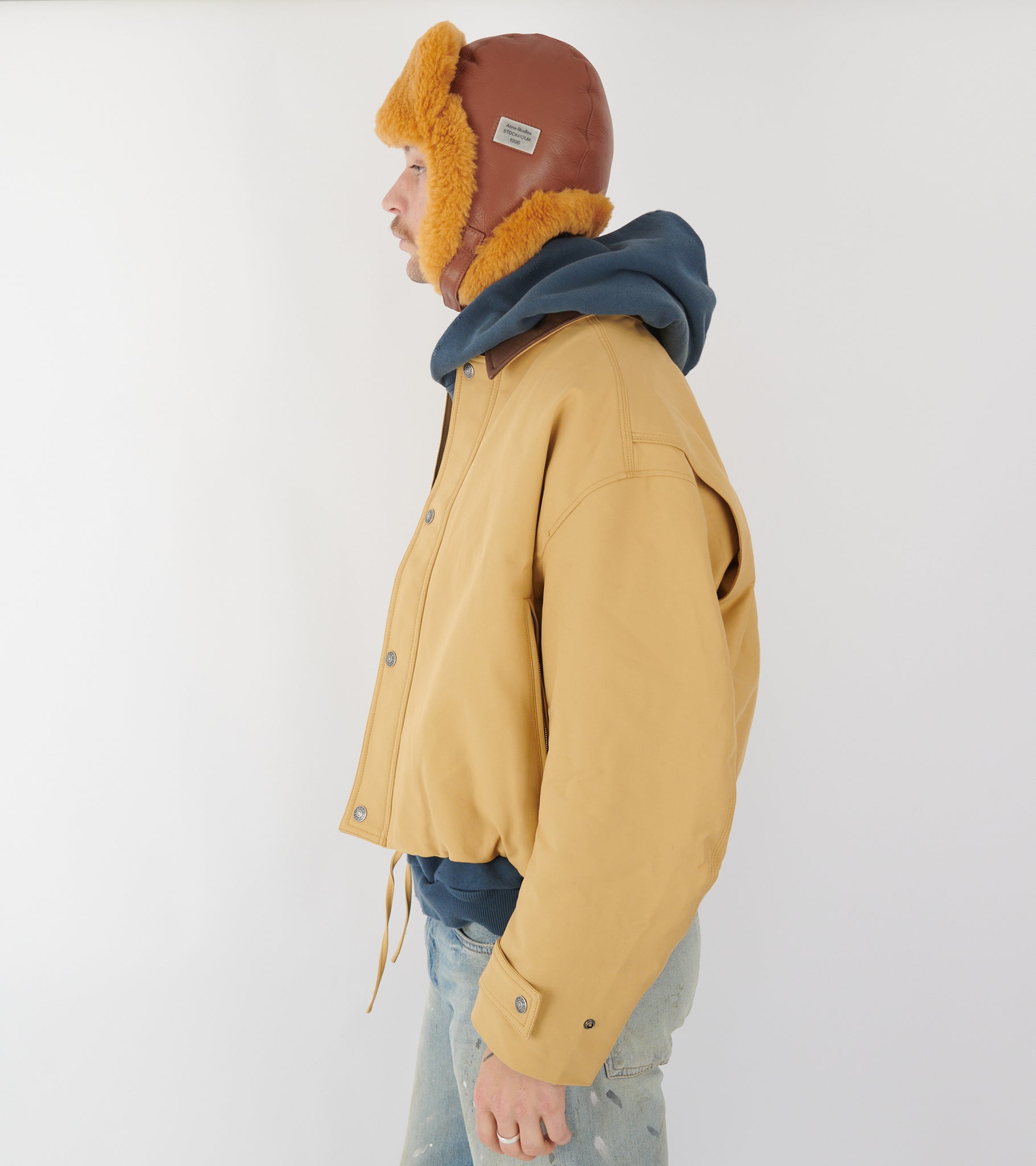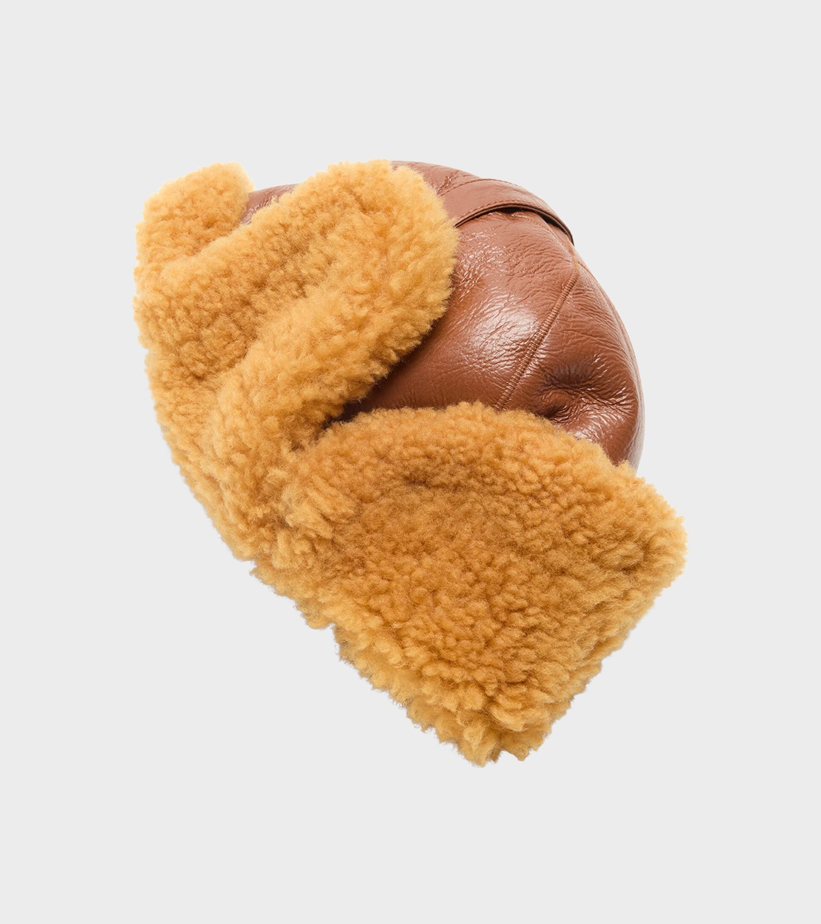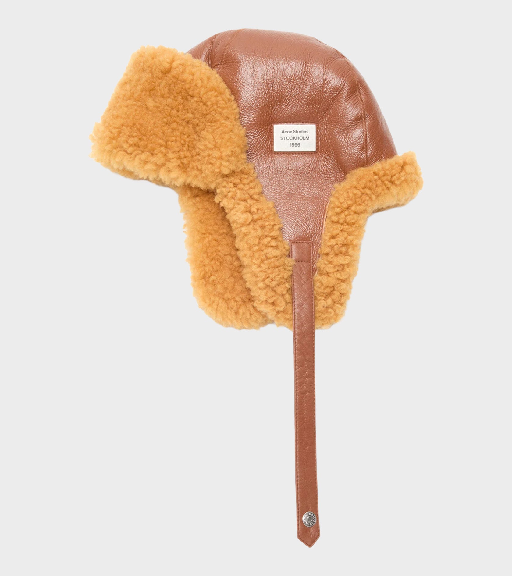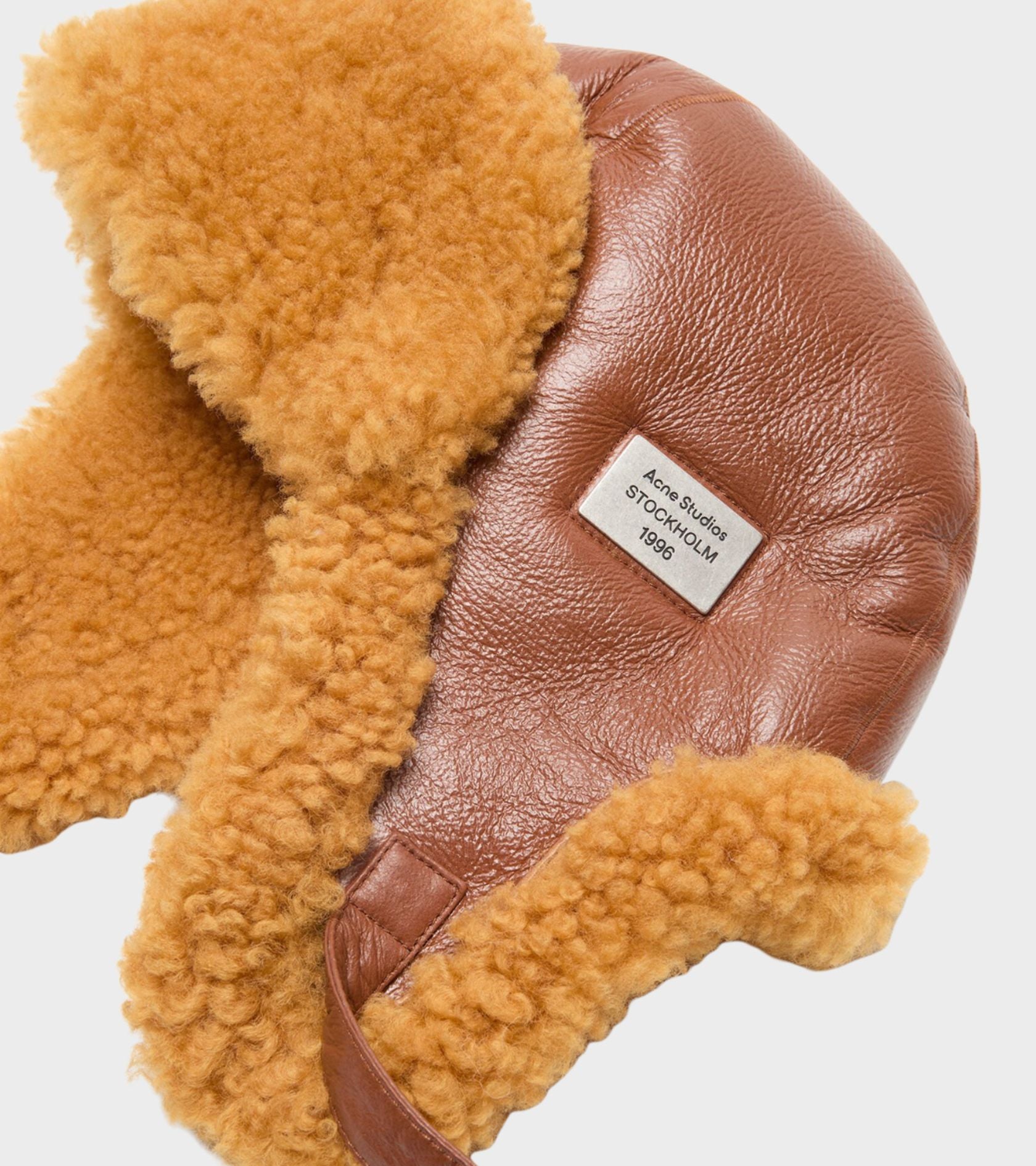 Aviator-inspired lambskin hat from Acne Studios. The hat is made of soft lambskin and is lined with lamb shearling. On the side is a metal logotag.