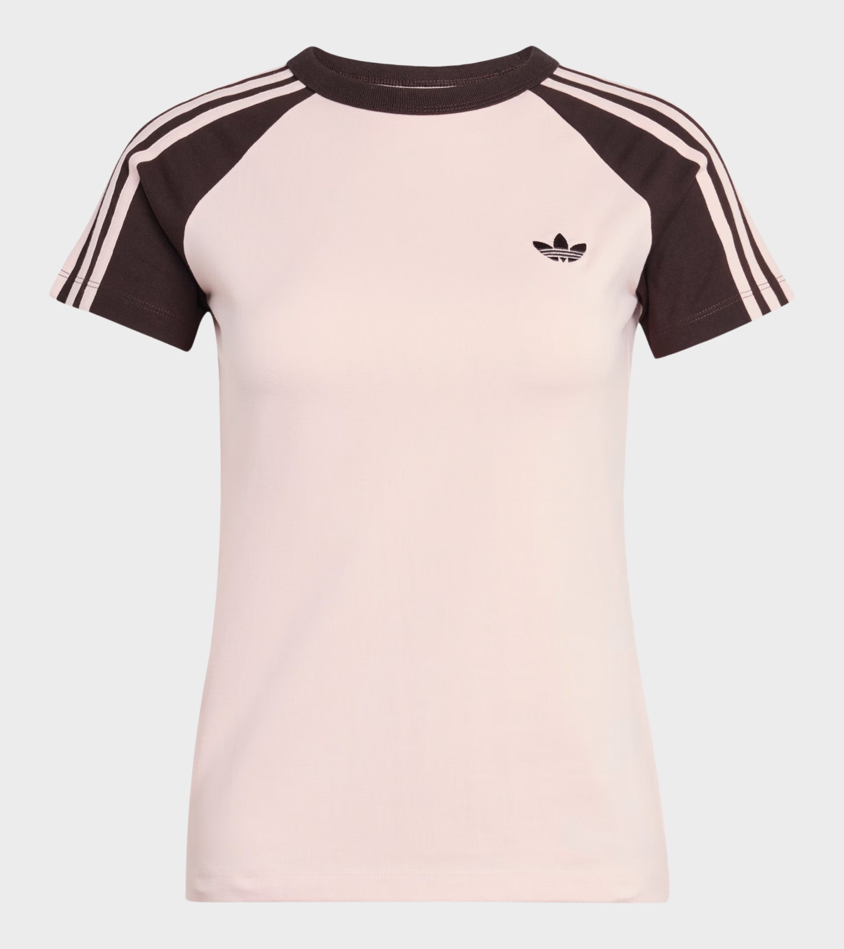 Light pink t-shirt with brown sleeves from Adidas. This t-shirt has the iconic stripes on the sleeves and an embroidered logo by the left chest.