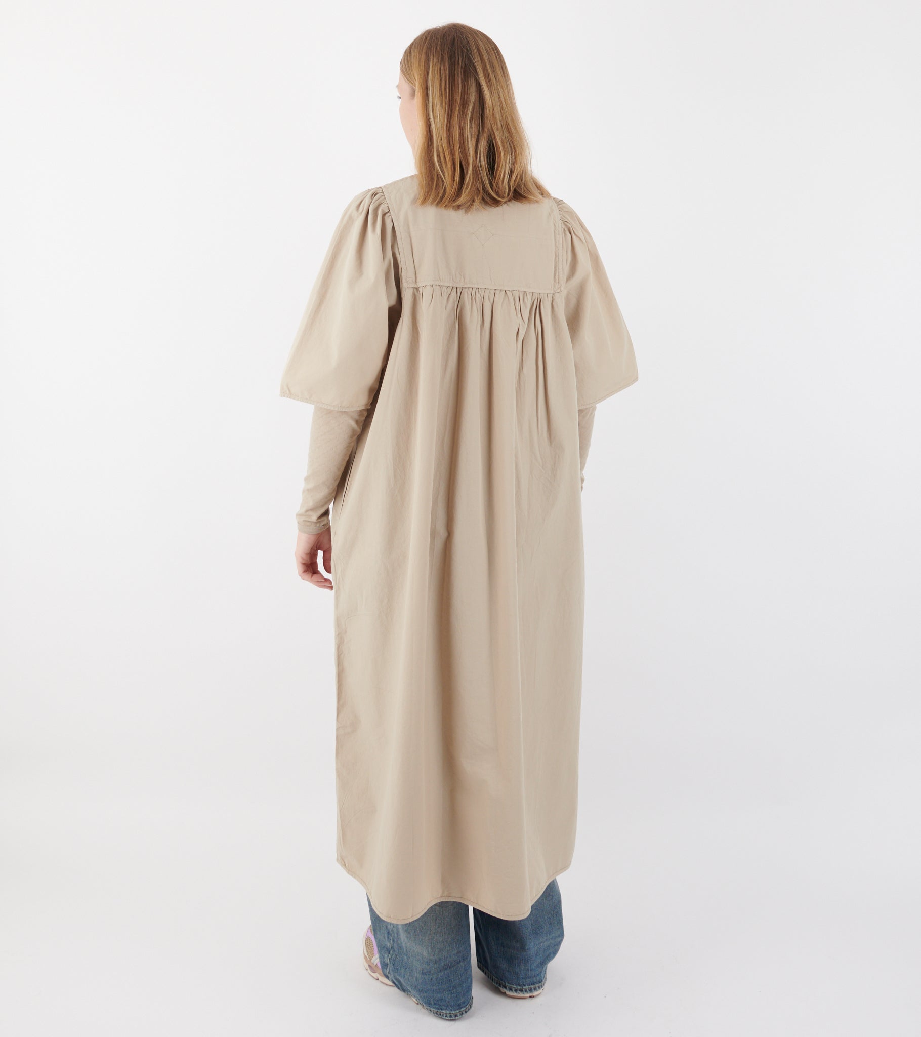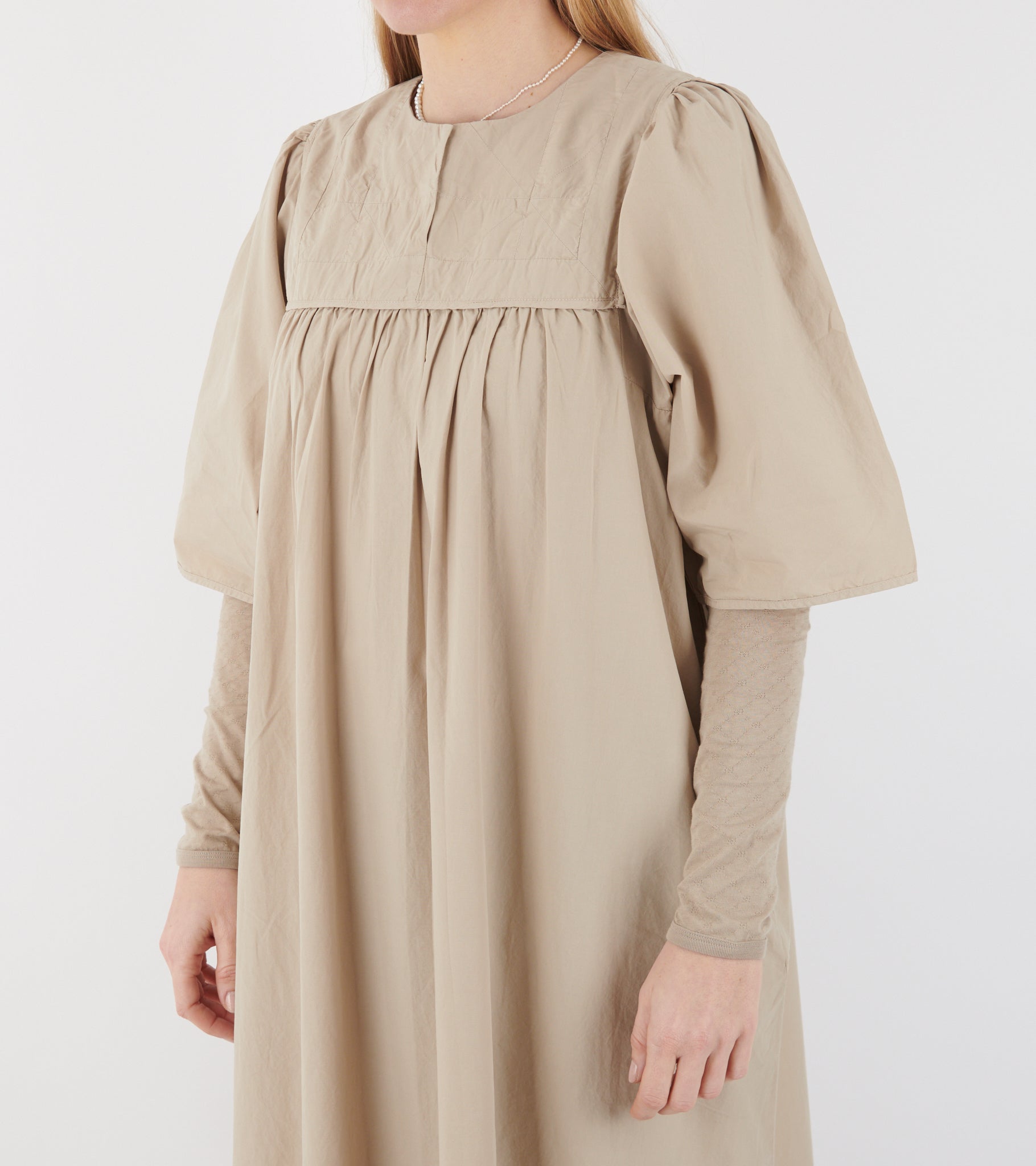 Long dress in organic cotton from Aiayu. Enola Dress has patchwork on the front as well as wide cropped sleeves.