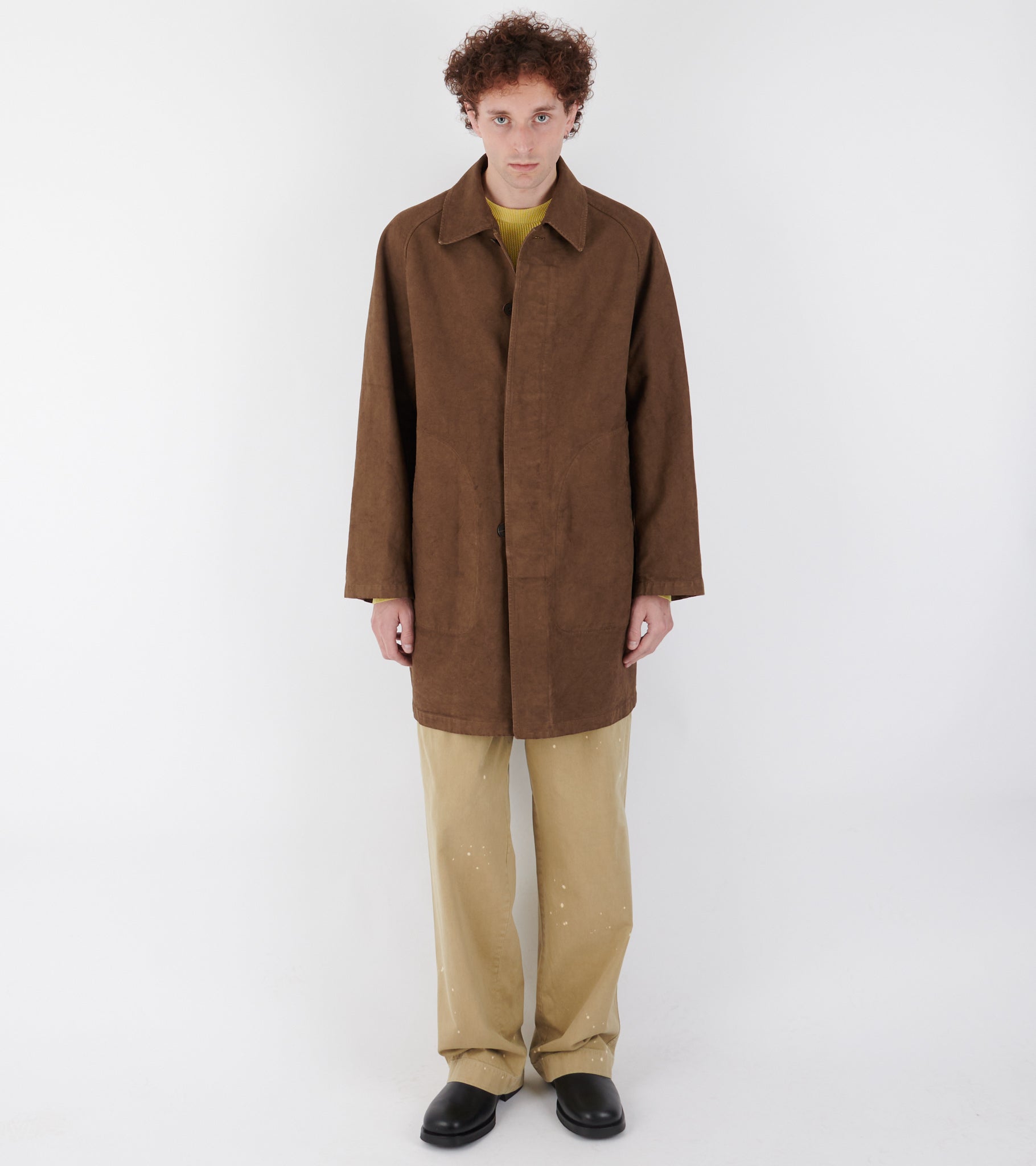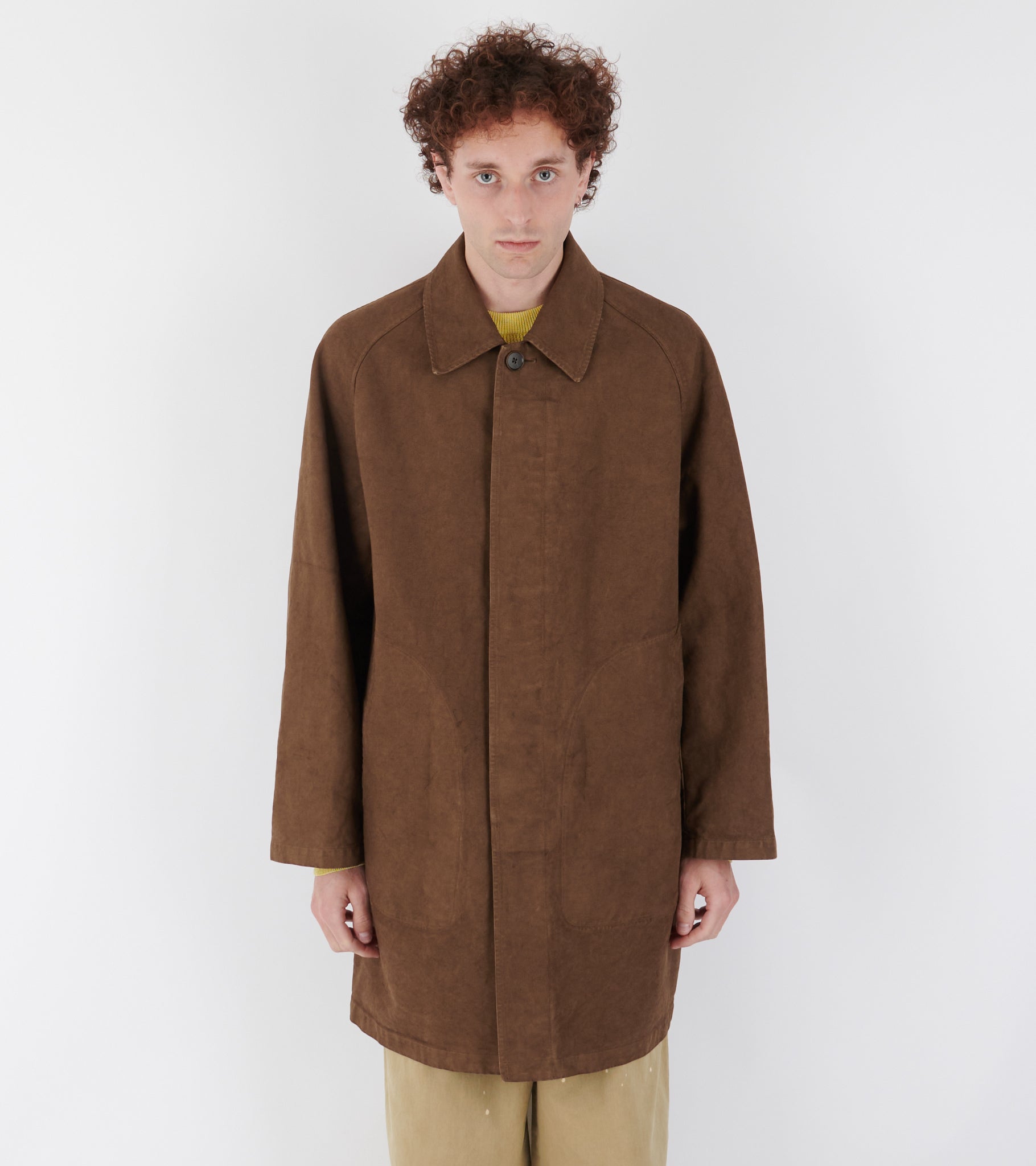 Brown garment dyed coat in organic cotton twill from Auralee. The coat has a classic collar, a hidden button closure and a slanted pocket on each side.