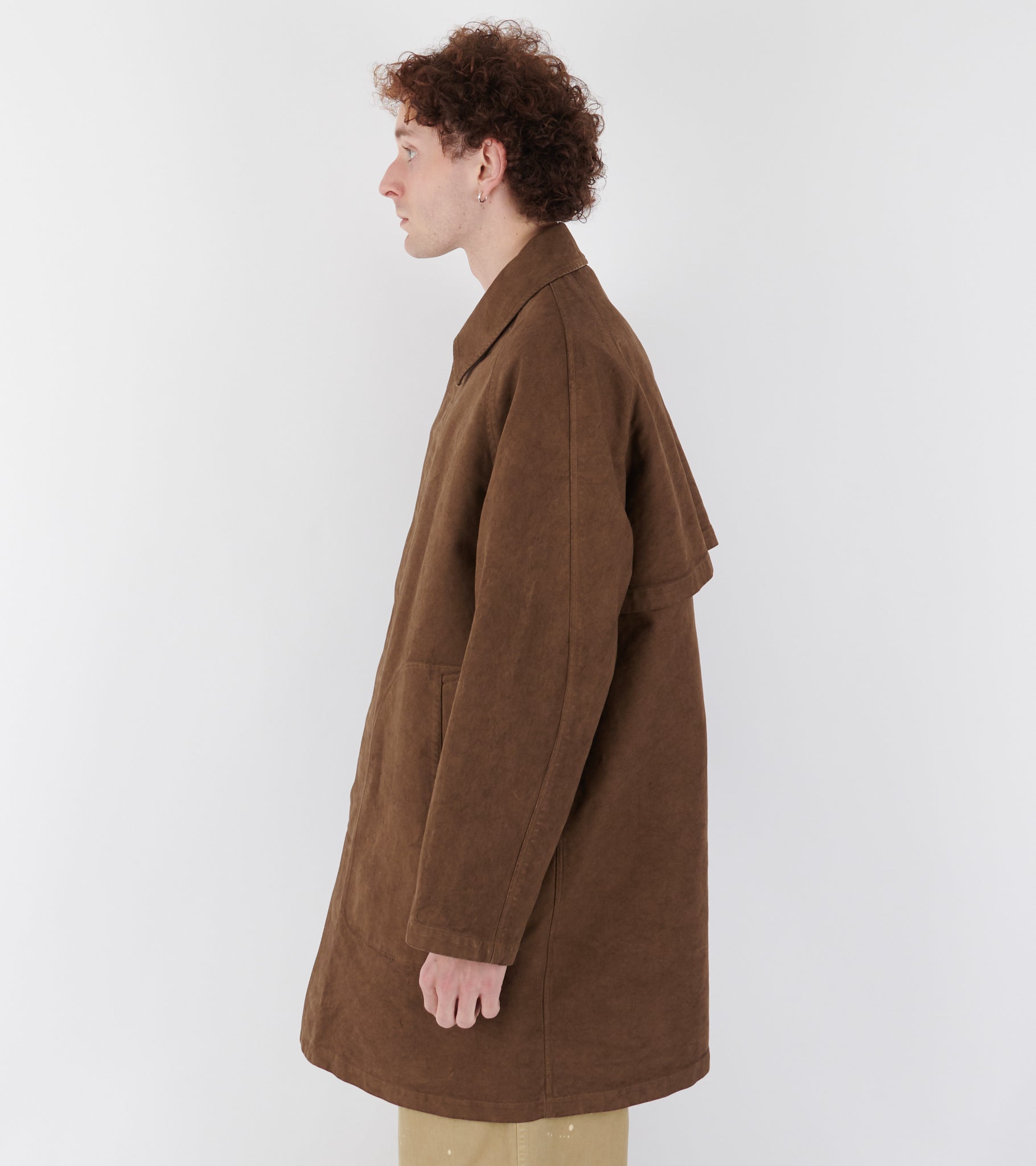 Brown garment dyed coat in organic cotton twill from Auralee.