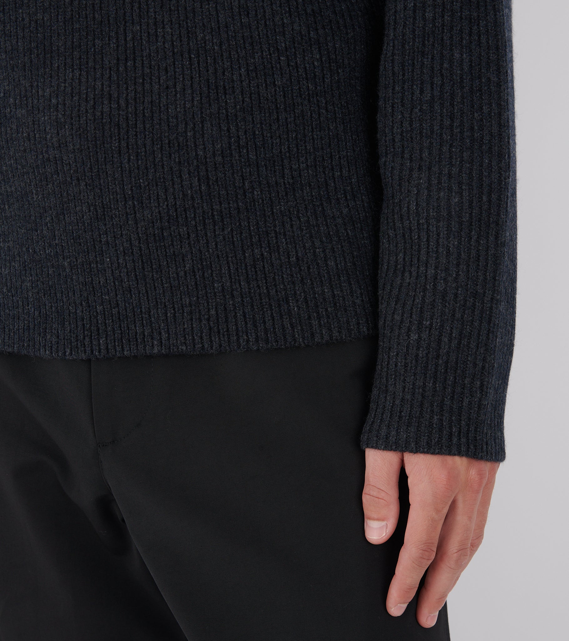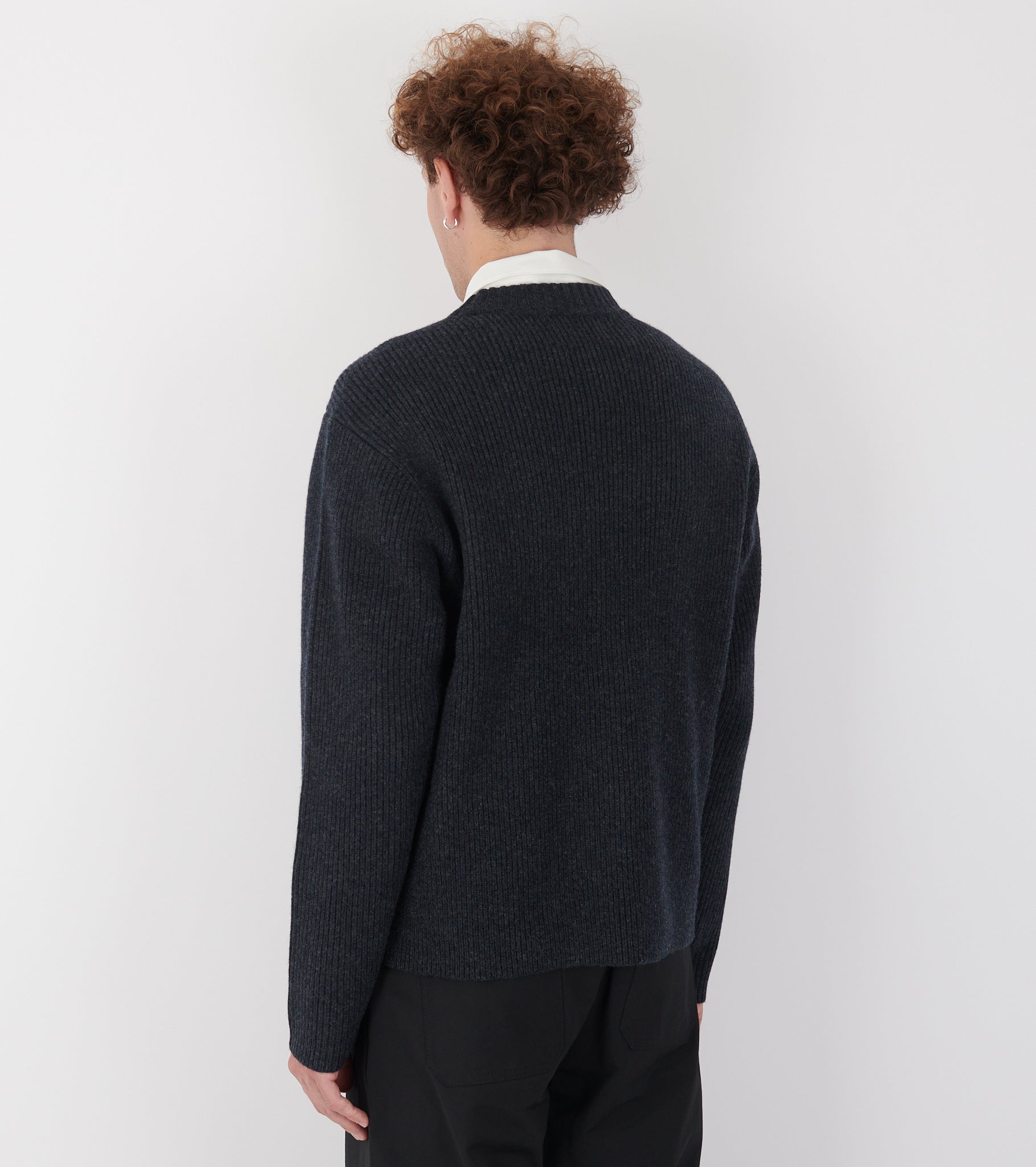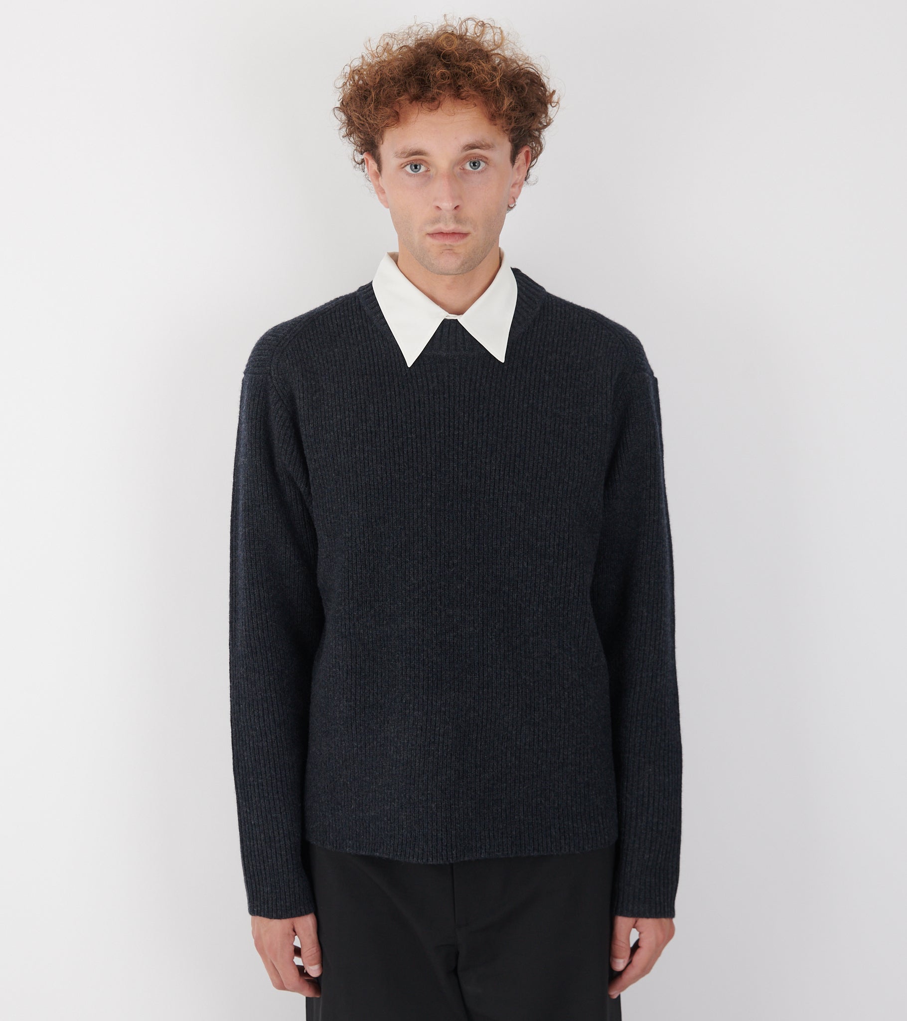 Dark grey wool knit from Berner Kühl. The Naval Crew is knitted in a 1x1 rib, which leaves it extra dense and chunky. It has a round rib knitted neck.