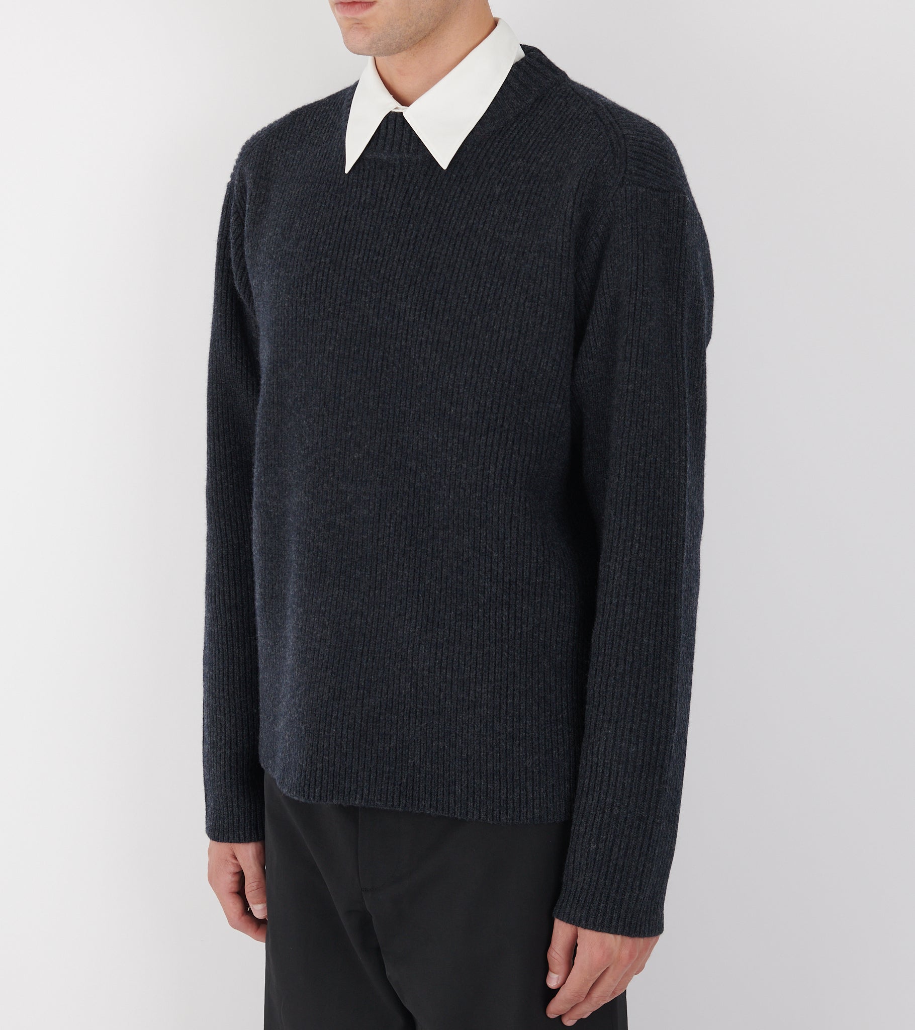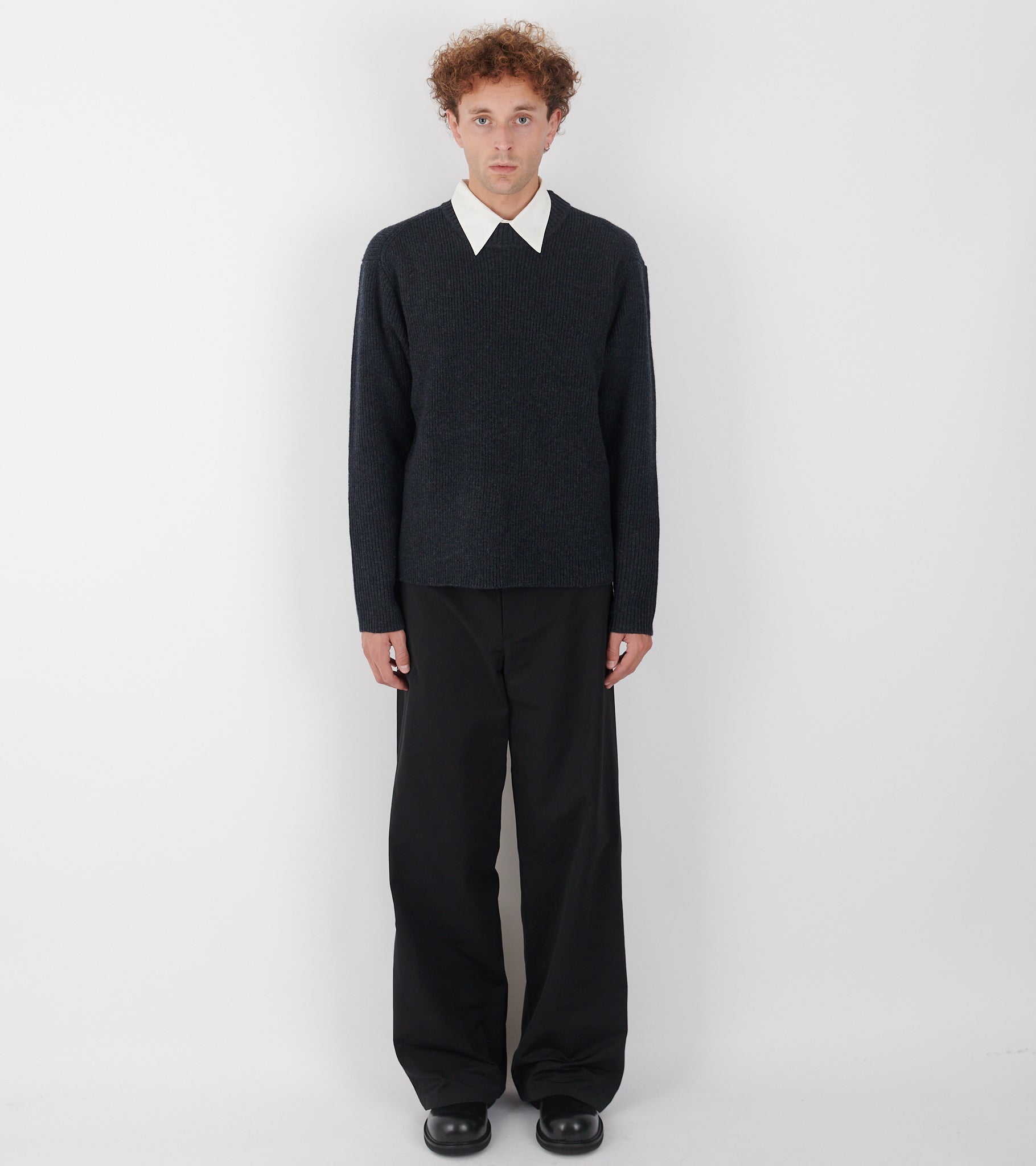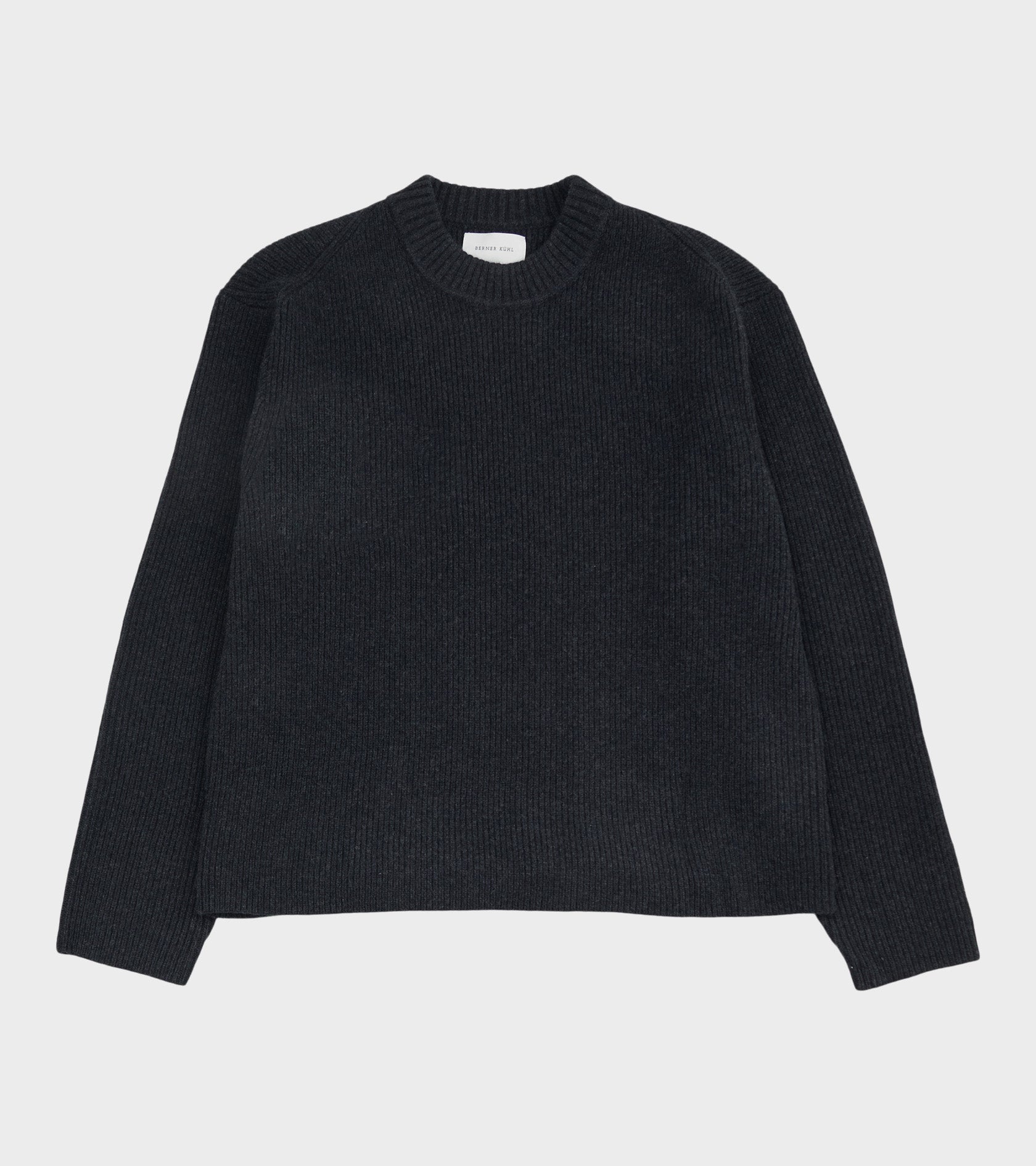 Dark grey wool knit from Berner Kühl. The Naval Crew is knitted in a 1x1 rib, which leaves it extra dense and chunky. It has a round rib knitted neck.