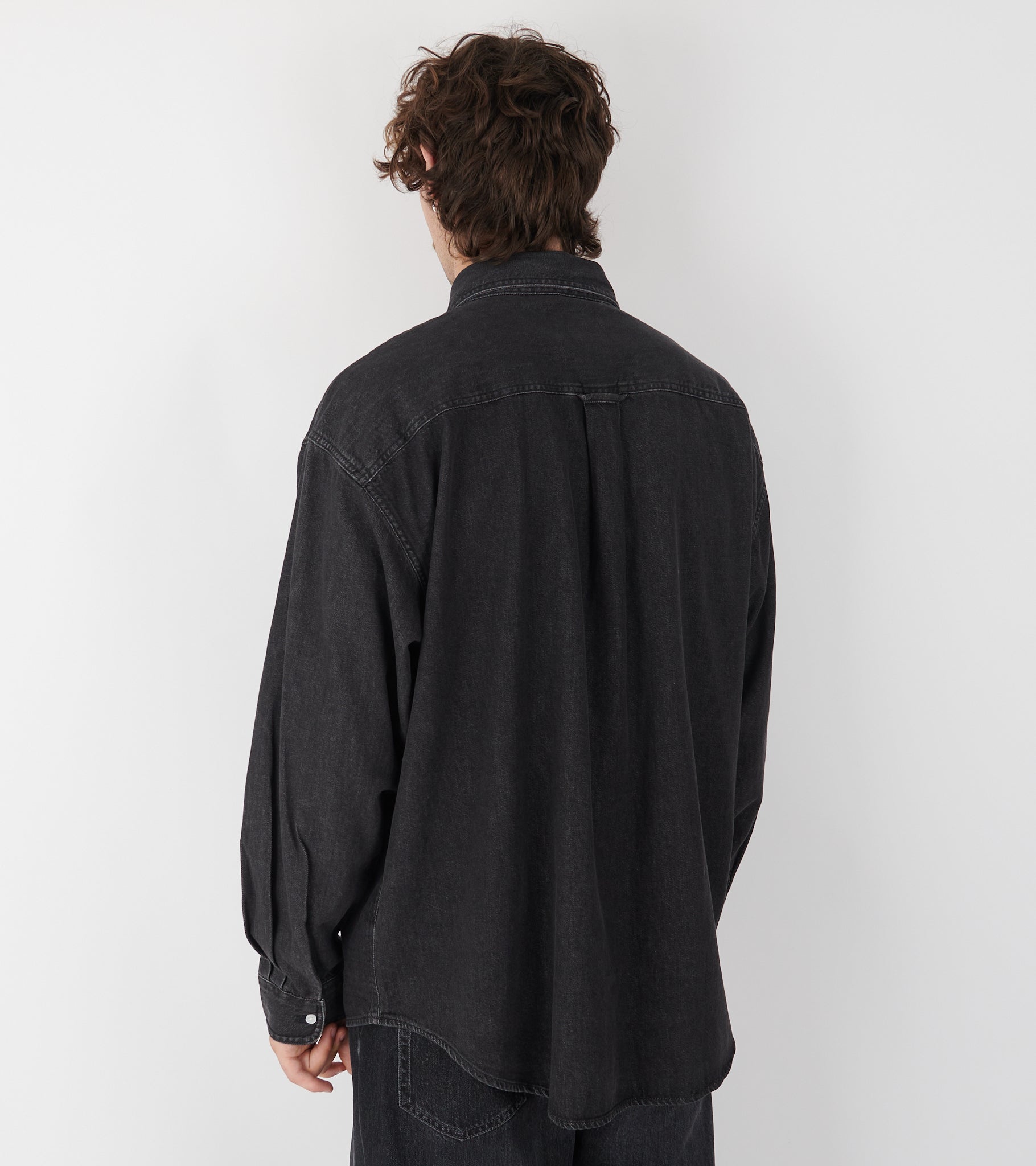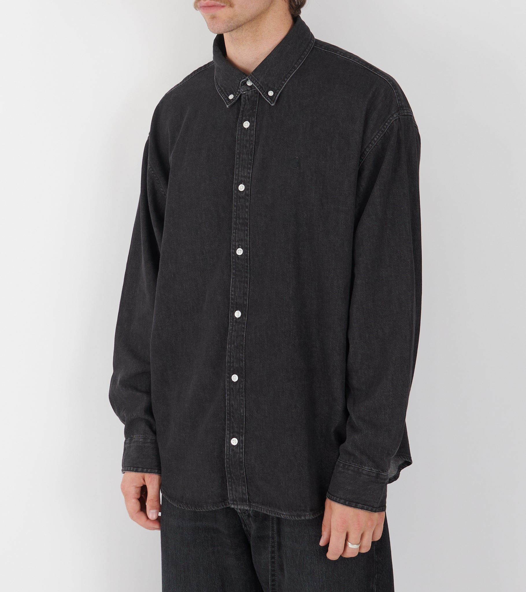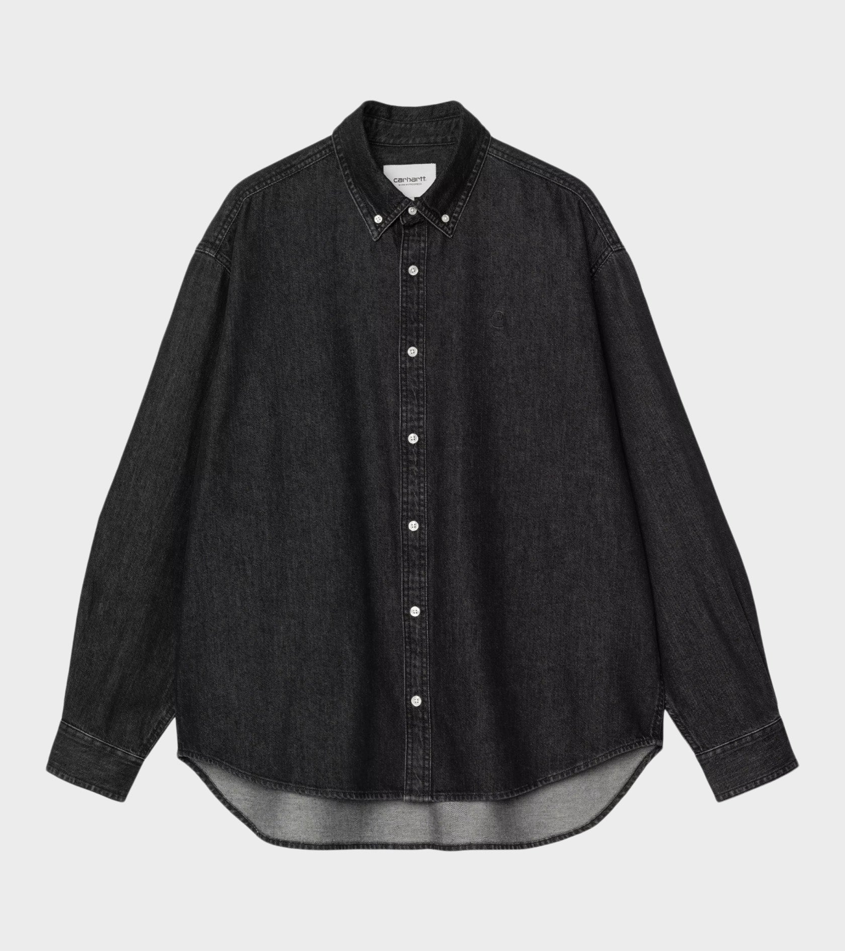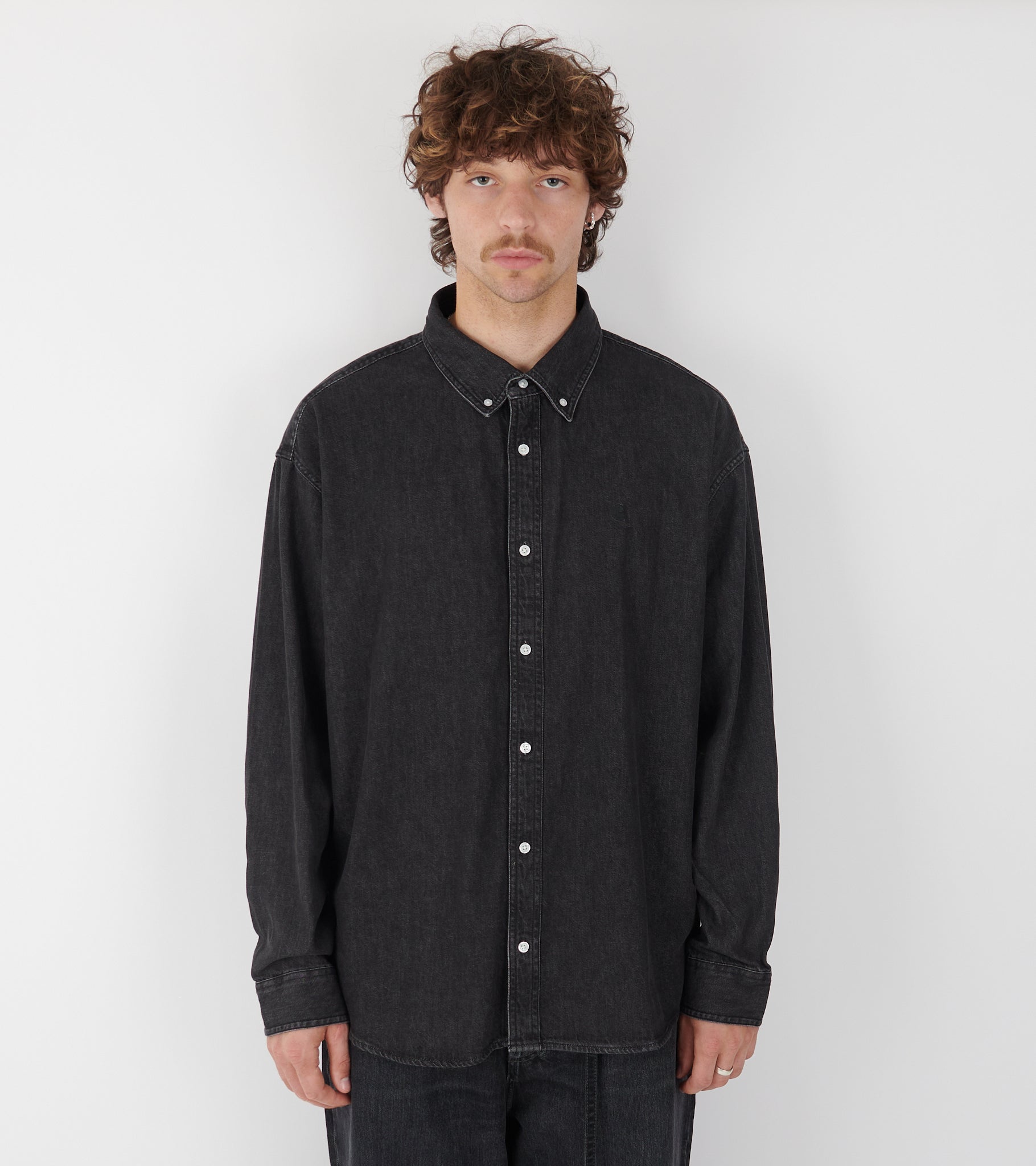 Black stone washed shirt in cotton denim from Carhartt WIP. Lucas L/S Shirt has a classic collar, a button closure and pleats on the back. On the left chest is a small embroidered logo in black.