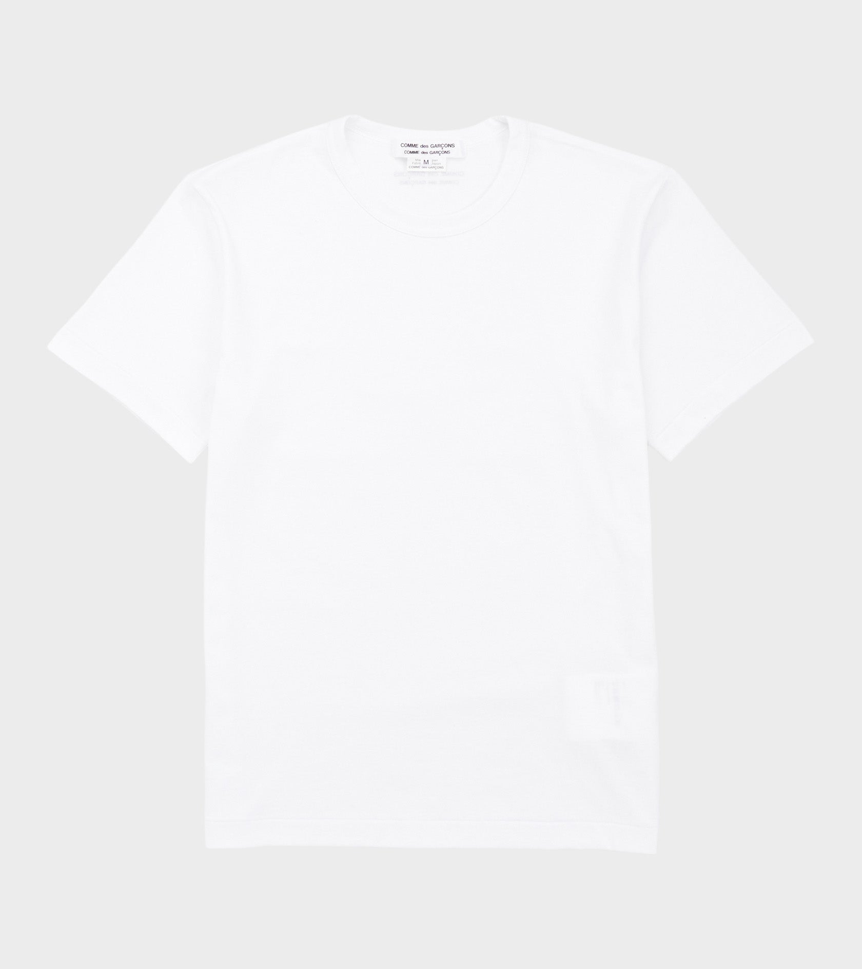 White t-shirt from Comme des Garcons. This t-shirt is made of cotton and has a printed logo at the top back.