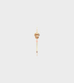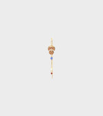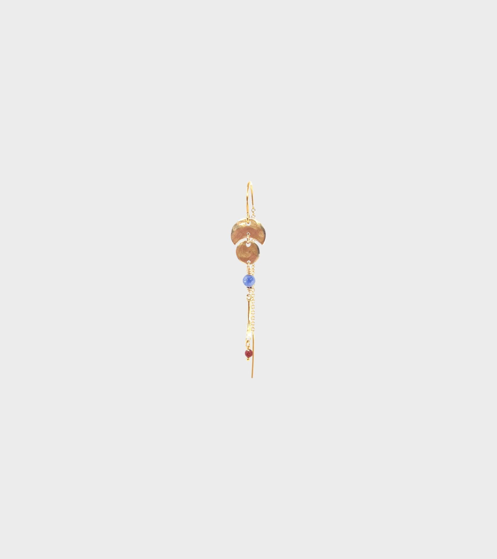 Gold-plated earring with two hammered pendants and a small blue and red stone from Leleah.