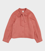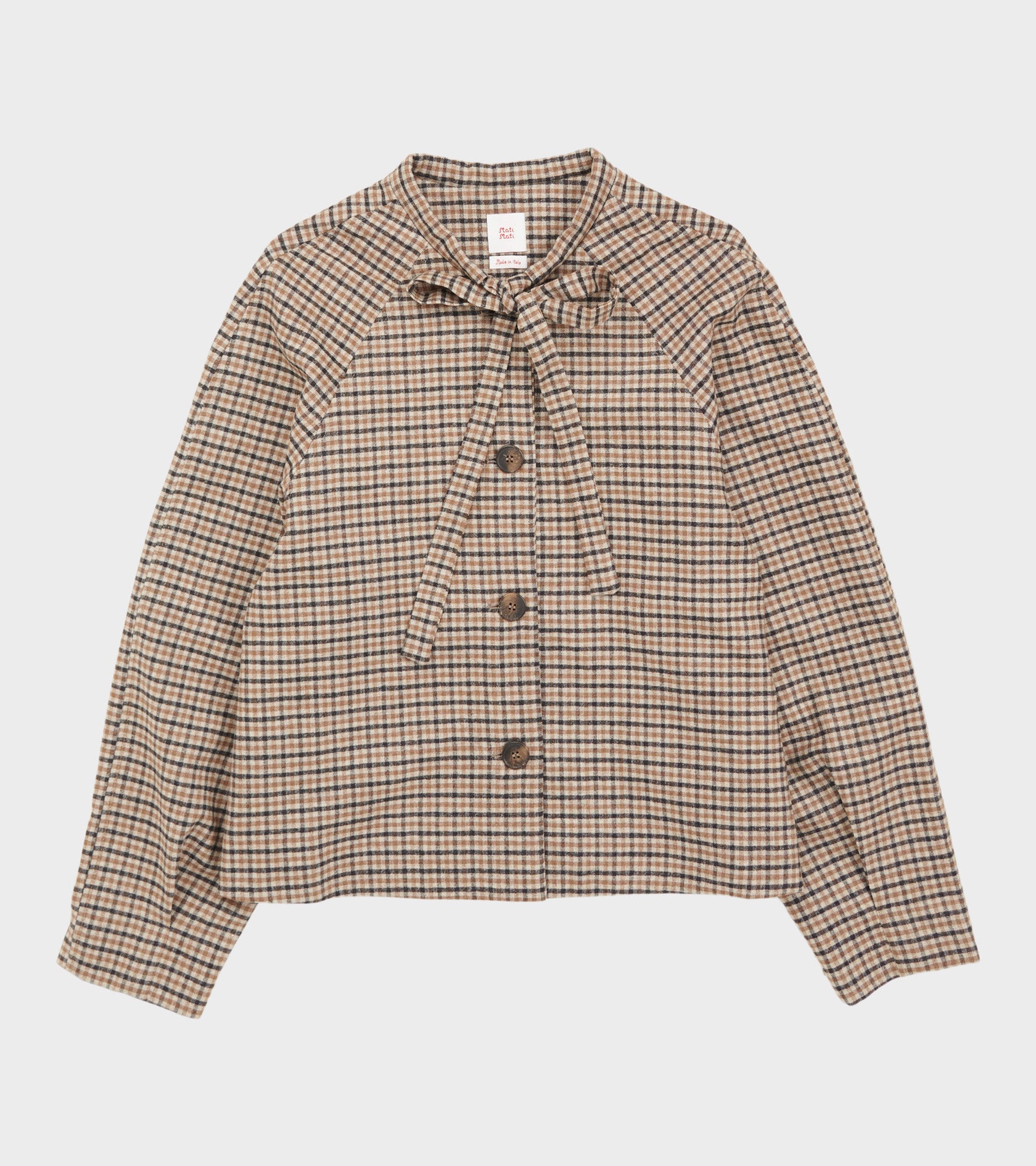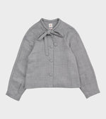 Marie Jacket in checkered wool from Mati Mati. The jacket has a round neck with a tie detail, a slanted pocket on each side, pleats at the bottom of the sleeves and a button closure on the front.