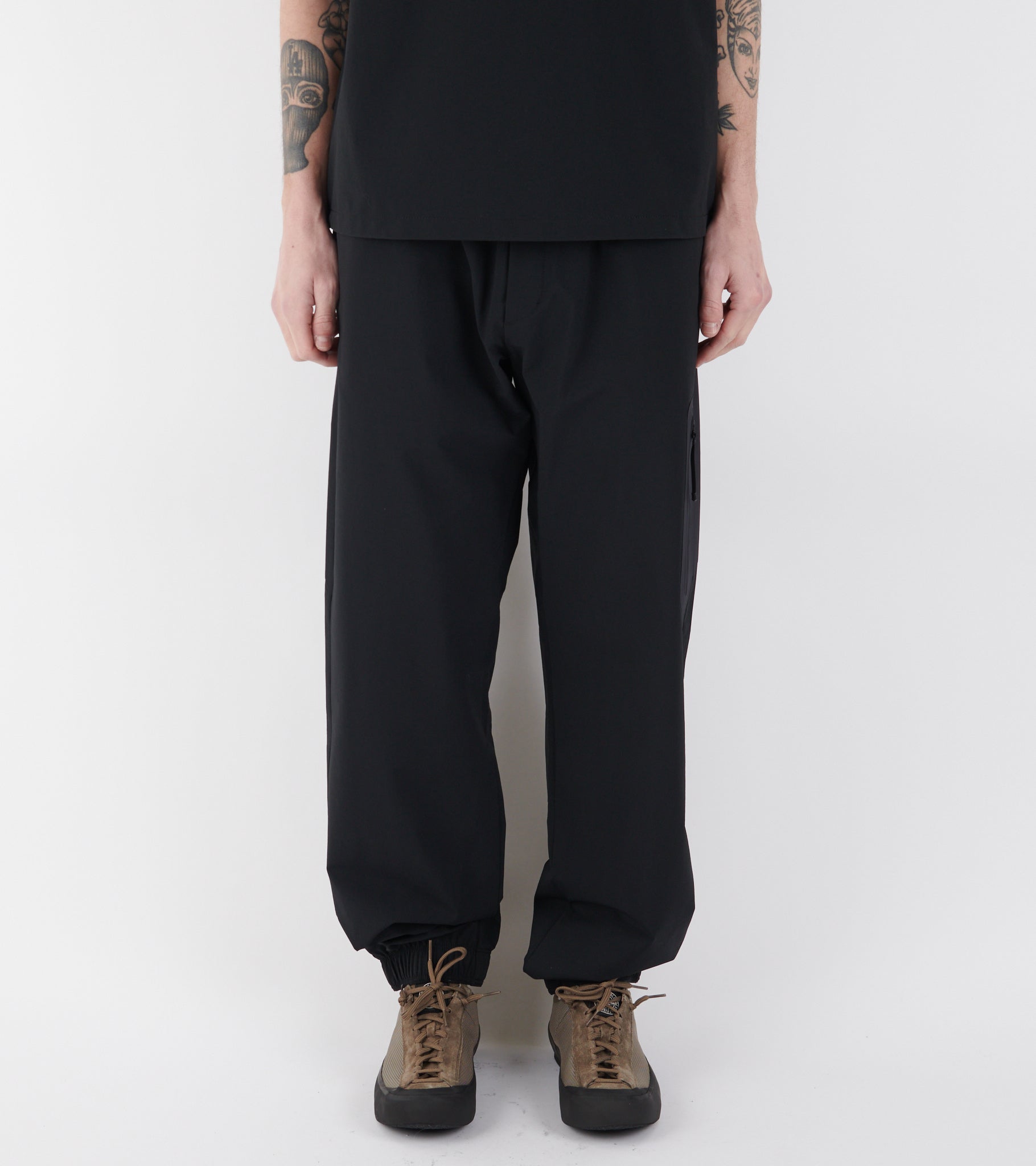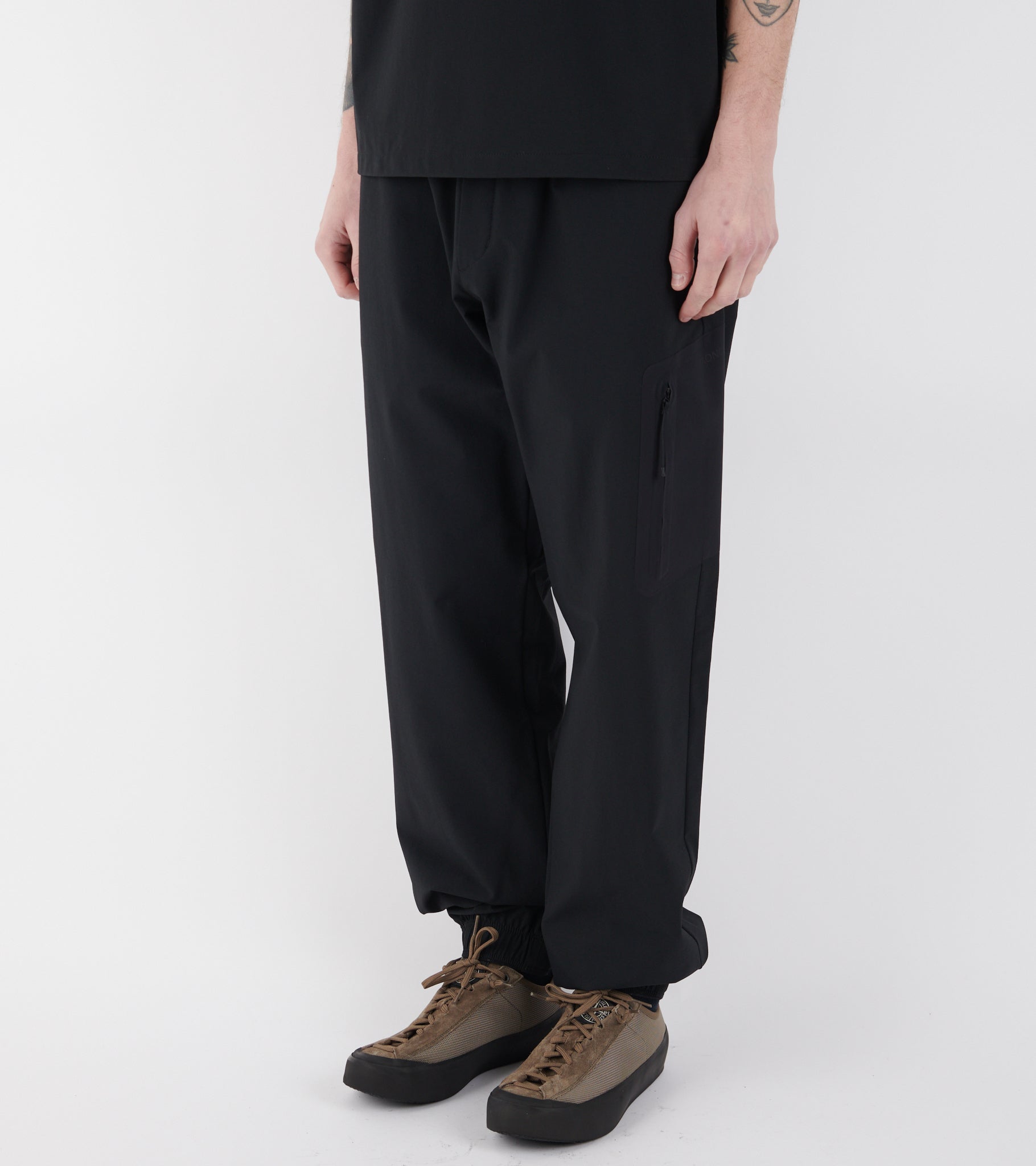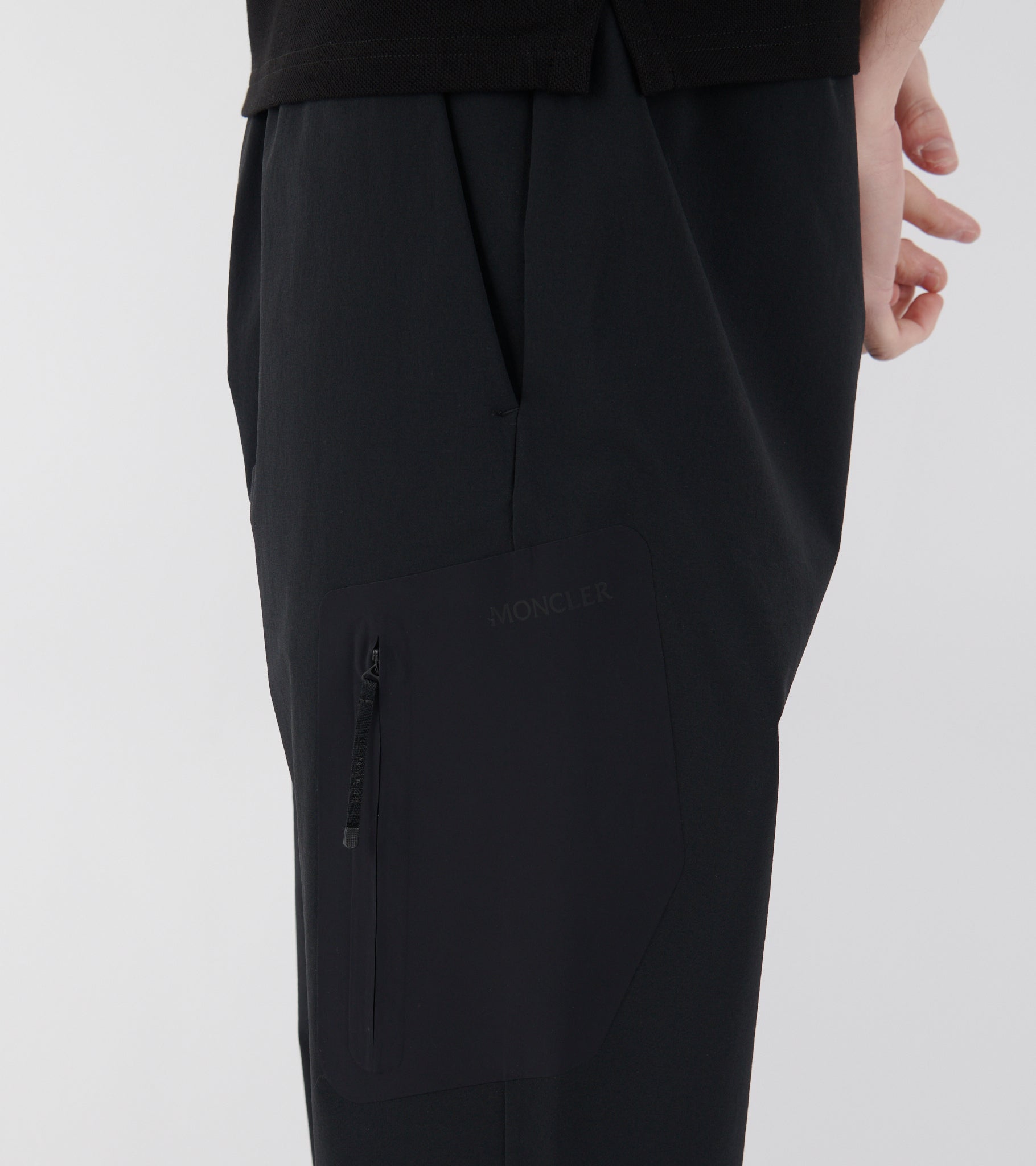 Black track pants in a technical nylon-stretch quality from Moncler. The pants have elastic and an inner tie at the waist, a slanted pocket on each side and one slit pocket at the back. Above the back pocket is the iconic logo in black silicone. On the left leg is a black patch detail with a zipper pocket and discreet black logo writing.