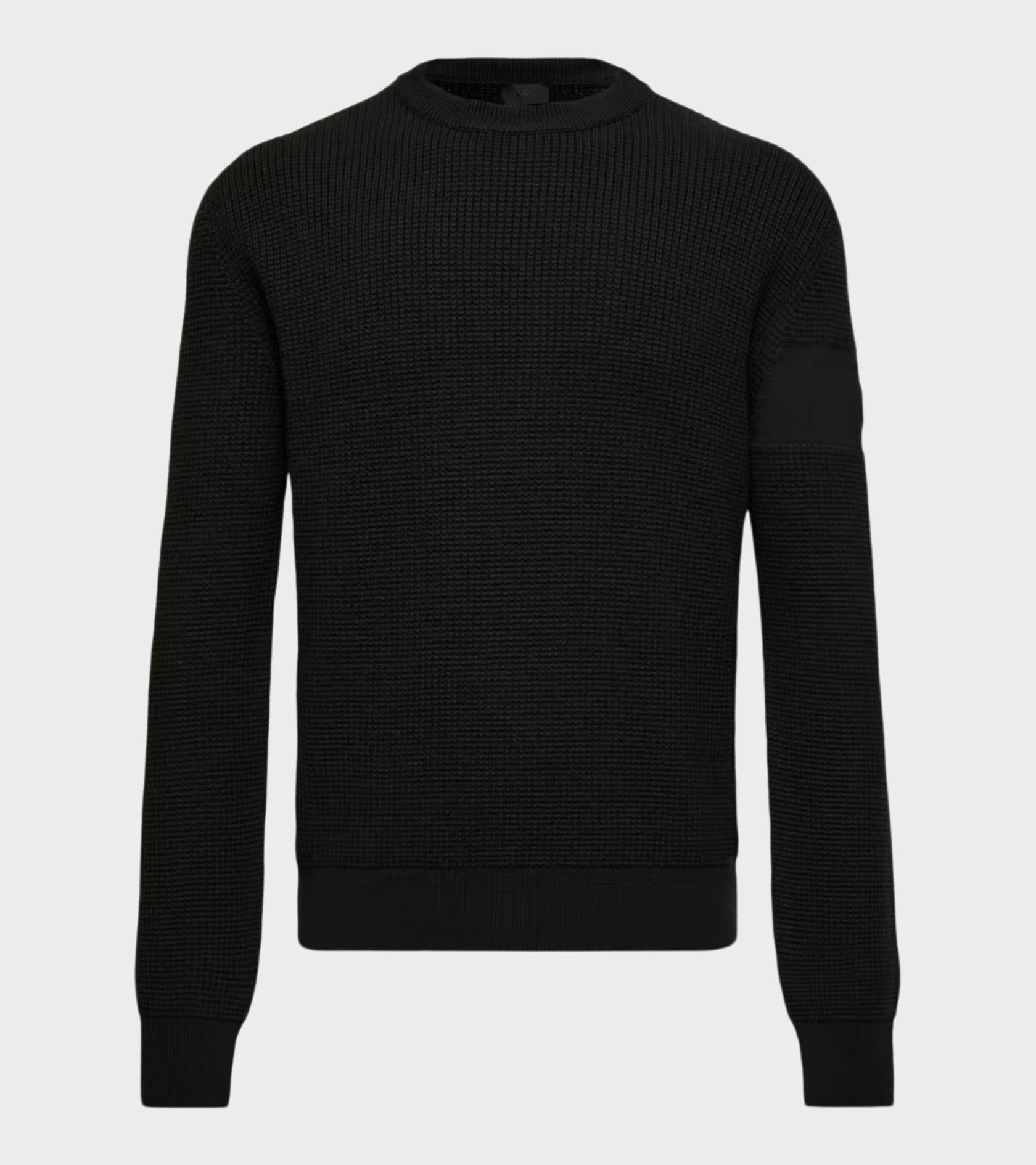 Black waffle knit in wool from Moncler. On the left sleeve is the iconic logo in black silicone.