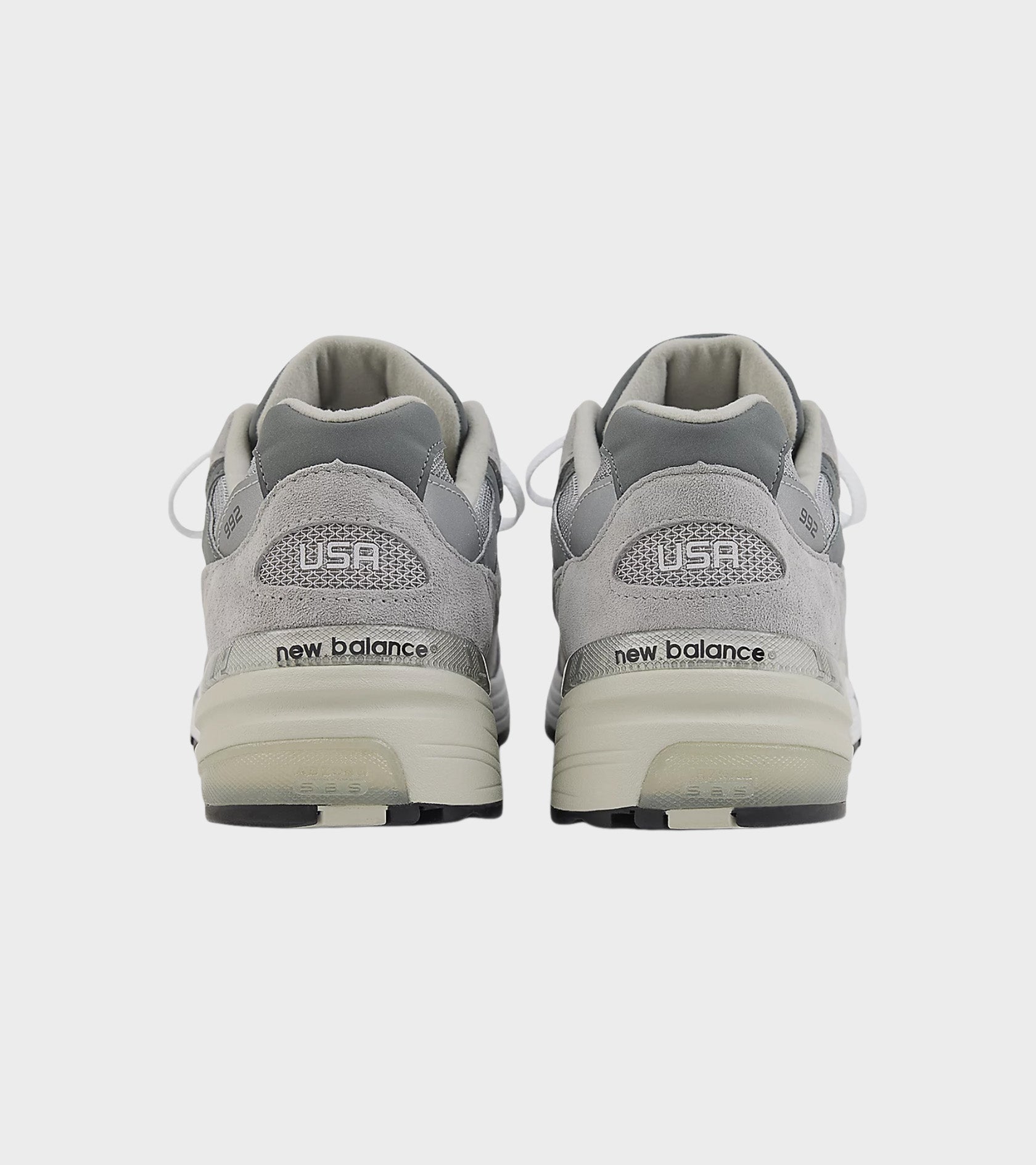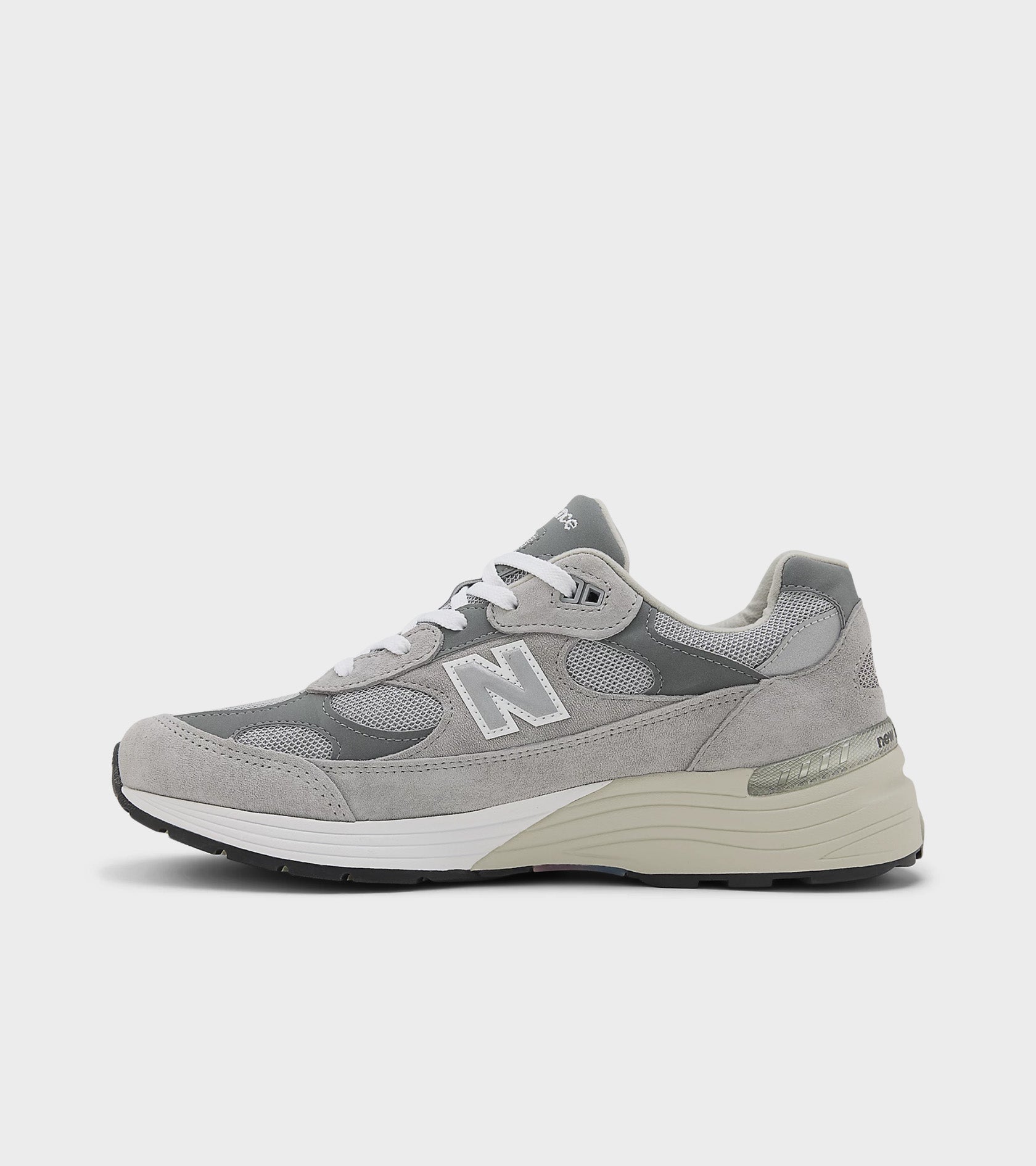 The iconic 992 in light grey from New Balance. The shoe has a suede and mesh upper and an embroidered logo on the heel and tongue. On the side is the iconic 'N' in silver.