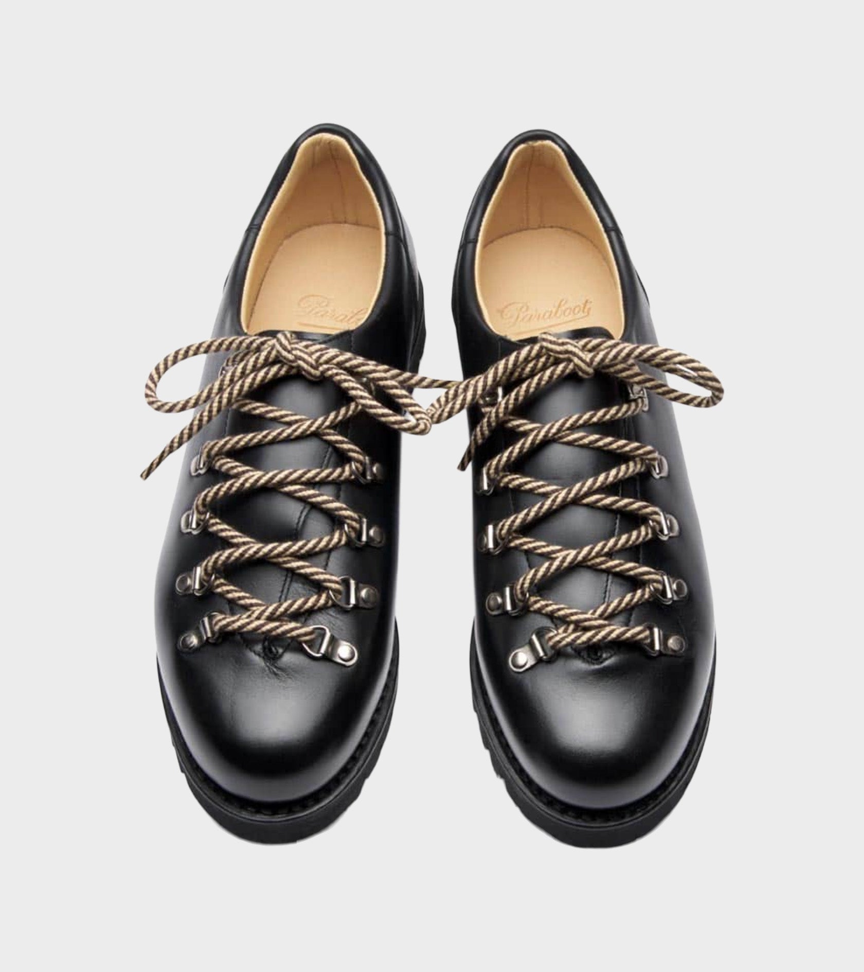 Clusaz Black Silk from Paraboot. These shoes are made of leather and have a lace-up closure with thick striped laces. The shoe is made in France and comes with a dustbag.