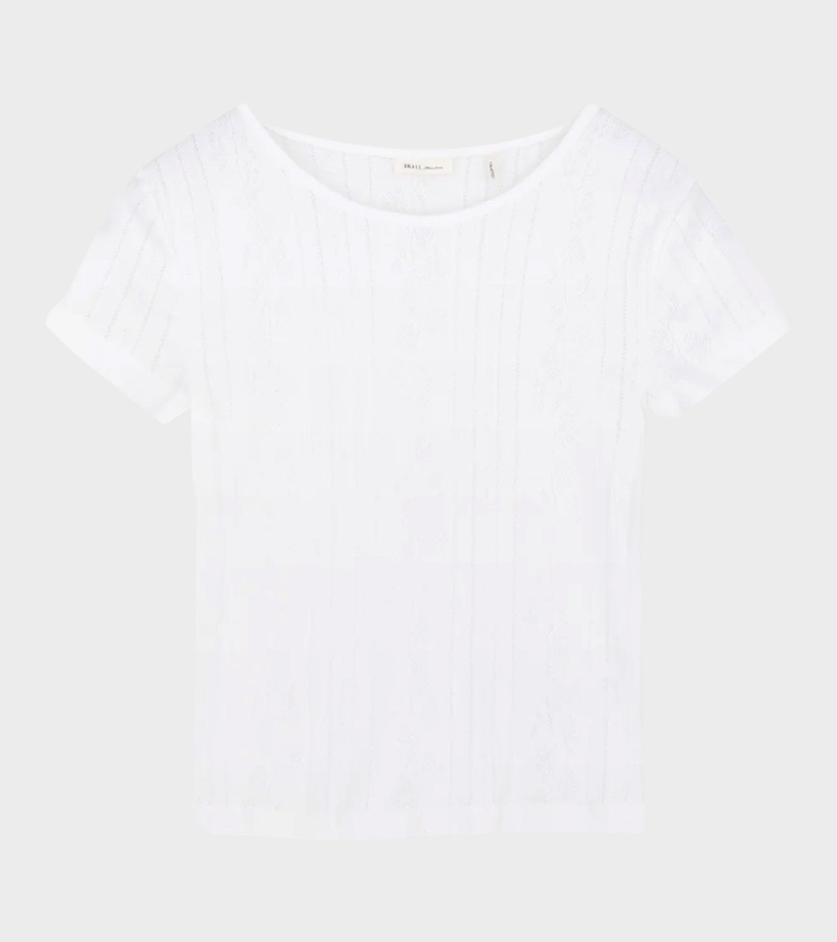 White t-shirt in organic cotton jersey from Skall Studio. Anna Cap Sleeve Tee has a floral hole pattern and short sleeves.