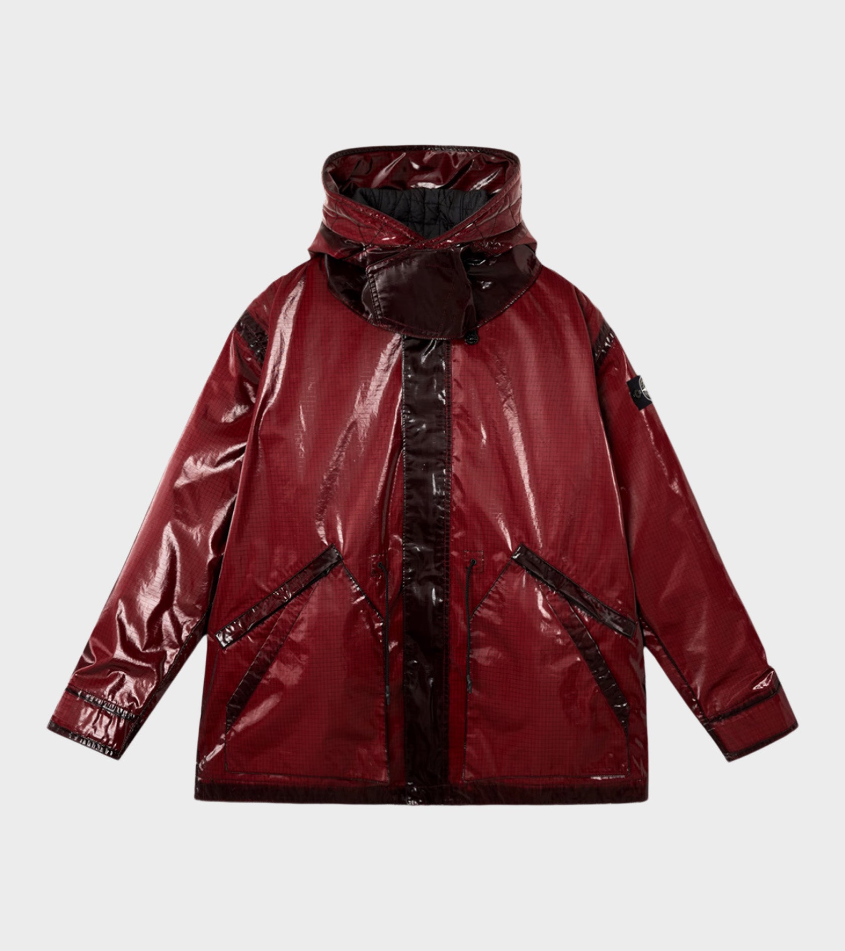 Dark red jacket in coated ripstop from Stone Island. The jacket has a hidden snap button closure and a two-way zip closure, four pockets on the front, a hood and a storm flap. On the left sleeve is the iconic Stone Patch. The jacket has an inner jacket in black quilted polyester.