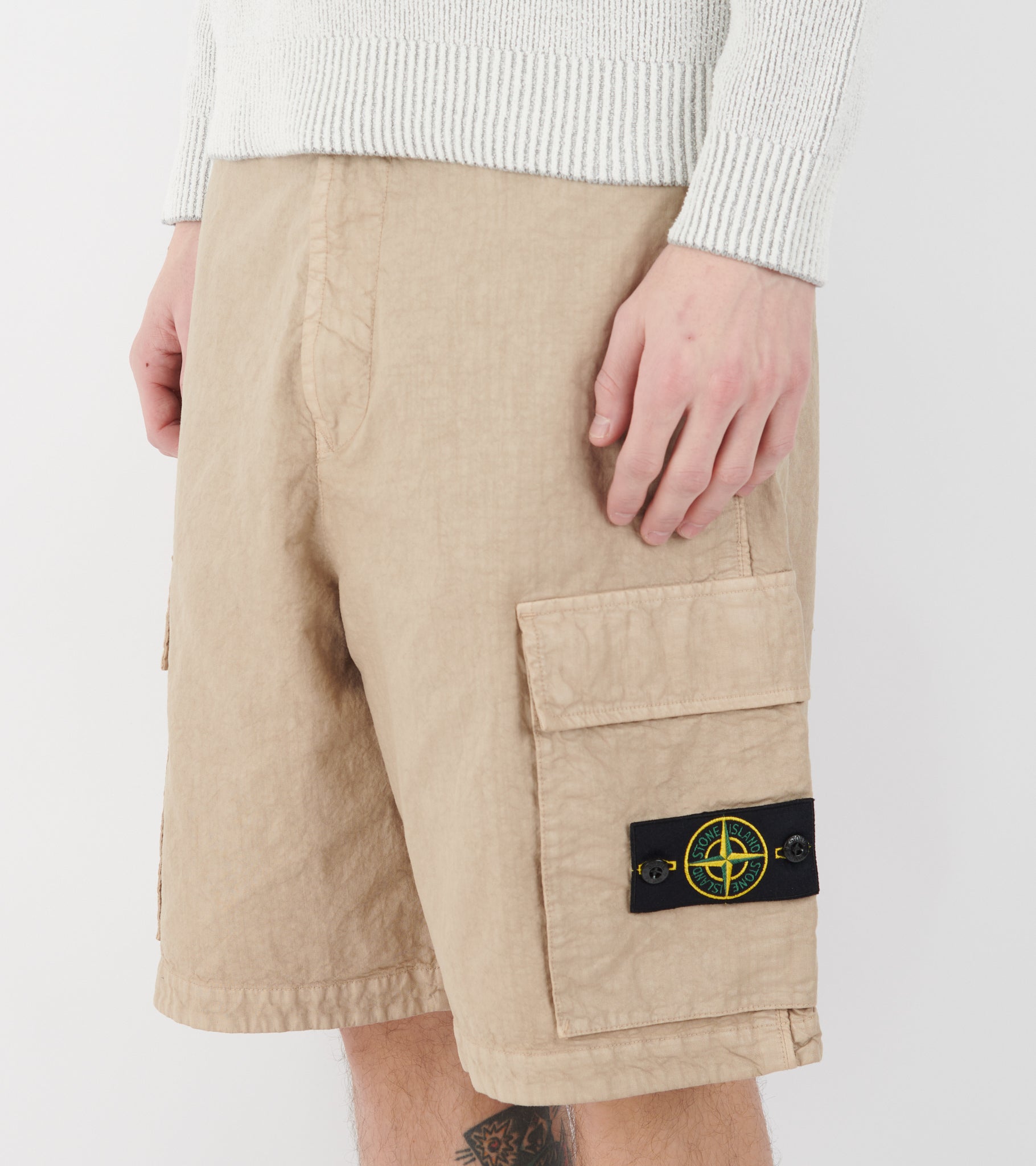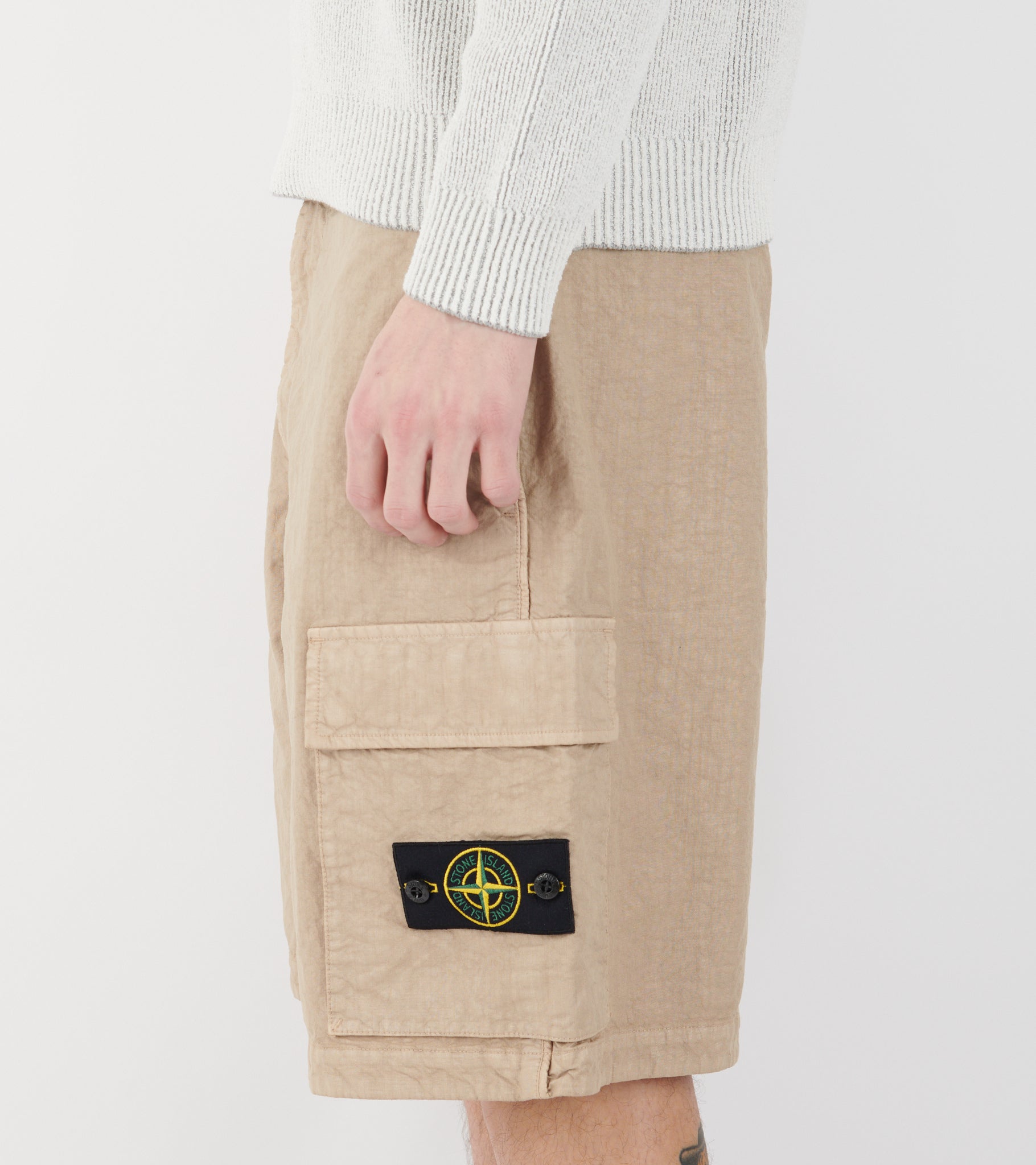 Beige shorts from Stone Island. These shorts are made in a heavy nylon quality and have belt loops, a slanted pocket on each side, one back pocket and two cargo pockets. On one cargo pocket is the iconic Stone Patch. The shorts have wide legs.