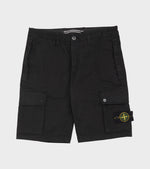 Black shorts in organic cotton from Stone Island. These shorts have belt loops, a slanted pocket on each side, one back pocket and two cargo pockets. One cargo pocket has the iconic Stone Patch.