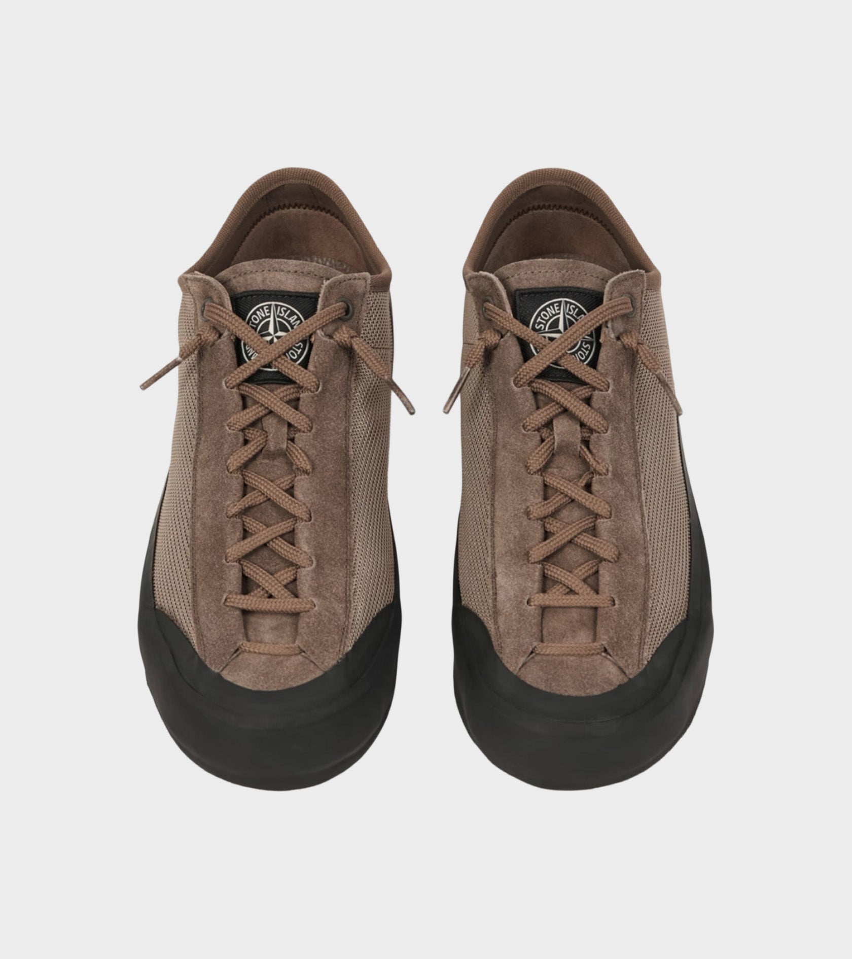 Brown low-top sneakers from Stone Island. These sneakers have a polyester mesh upper with suede overlays. The shoe has a black rubber overlay sole and an embroidered black logo on the tongue.