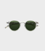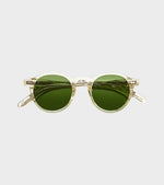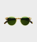 The classic Miltzen Sun model from Moscot - this version has frames in shades of brown and a yellow transparent shade. The lens is in the color 'Calibar Green'. The sunglasses have a unisex fit, with a rounded lens frame and a soft rounded edge that sits well on the bridge of the nose. Perfect against the sun's rays all year round. The sunglasses are handmade from Italian acetate and have an embossed logo on the inside of the frame.