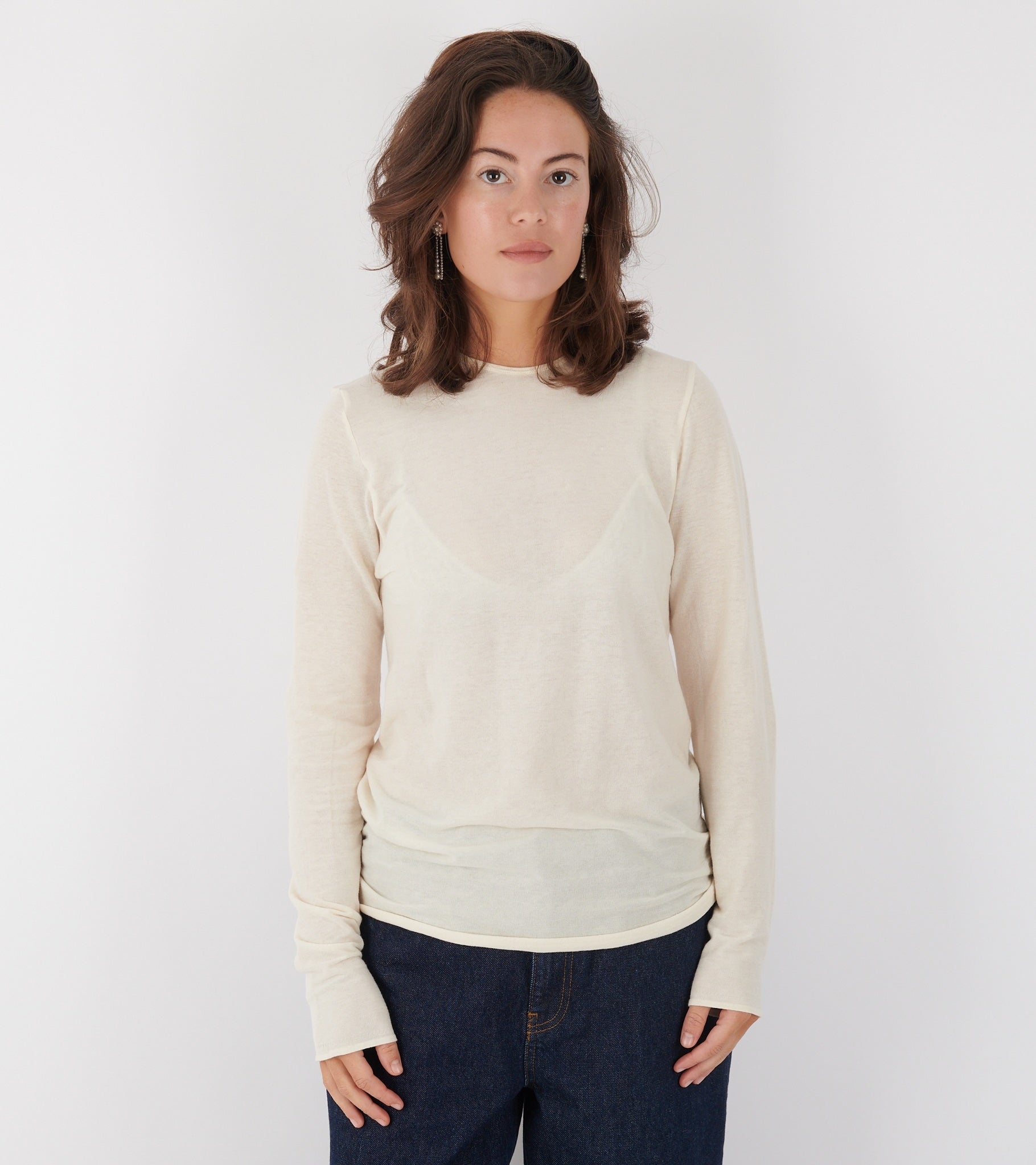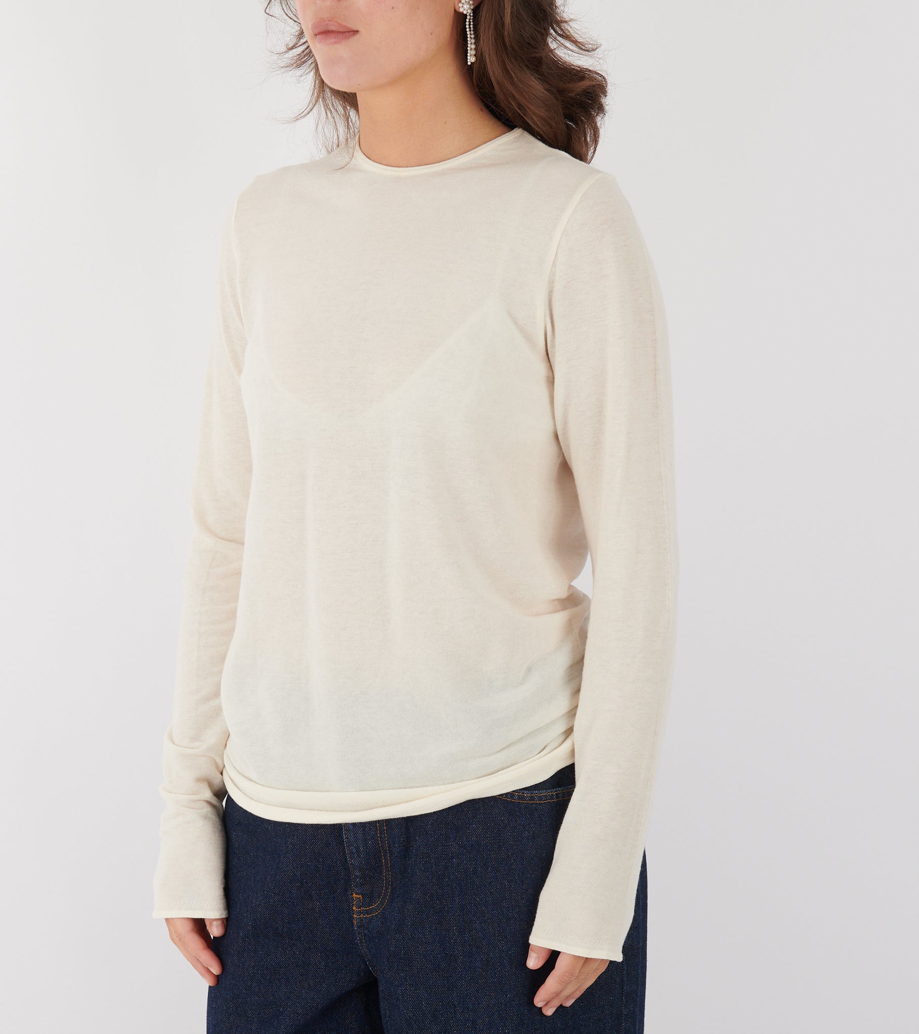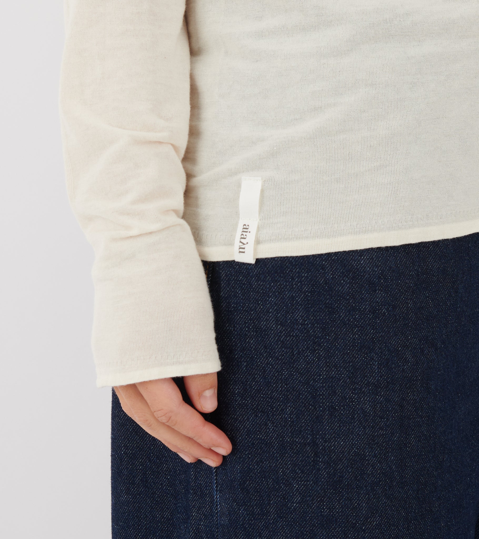 Off-white long-sleeved blouse from Aiayu. Gentle Long Sleeve is made from a blend of organic cotton and cashmere - a soft and breathable blend that is ideal as an insulating underlayer all year round. It has a round neck, discreet seams, a small logo tag on the side and a slightly tight fit. It is woven in Portugal in a certified factory.