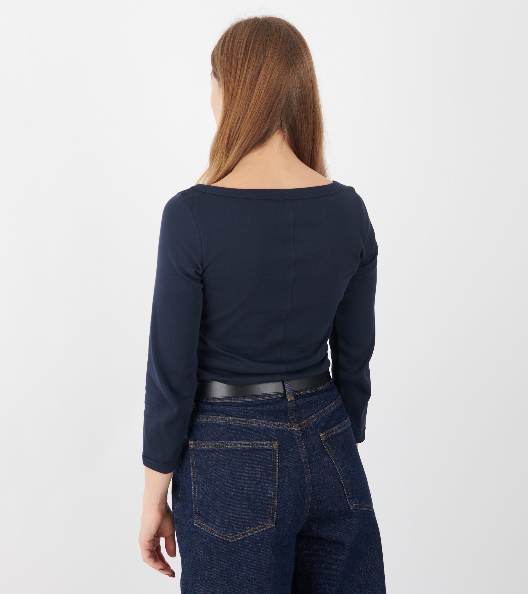 Navy blouse from Flore Flore. Steffi Tee is made of a ' medium weight' organic cotton quality and has a boat neckline and 3/4 length sleeves. It is produced in Portugal and has a slightly tight fit.