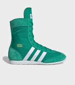 Japan H from Adidas in a green version. These sneakers have a high shaft, a nylon upper and suede overlays. The shoe has a classic lace-up closure and a white rubber sole. On the side are the iconic stripes in white textile and a printed logo in gold.
