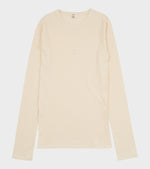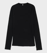 Black long-sleeved ribbed t-shirt from Baserange. This t-shirt has a round neck and a heart-shaped cut-out on the front. The t-shirt is produced in Portugal and is made of a stretchy organic cotton blend. The fit is tight.