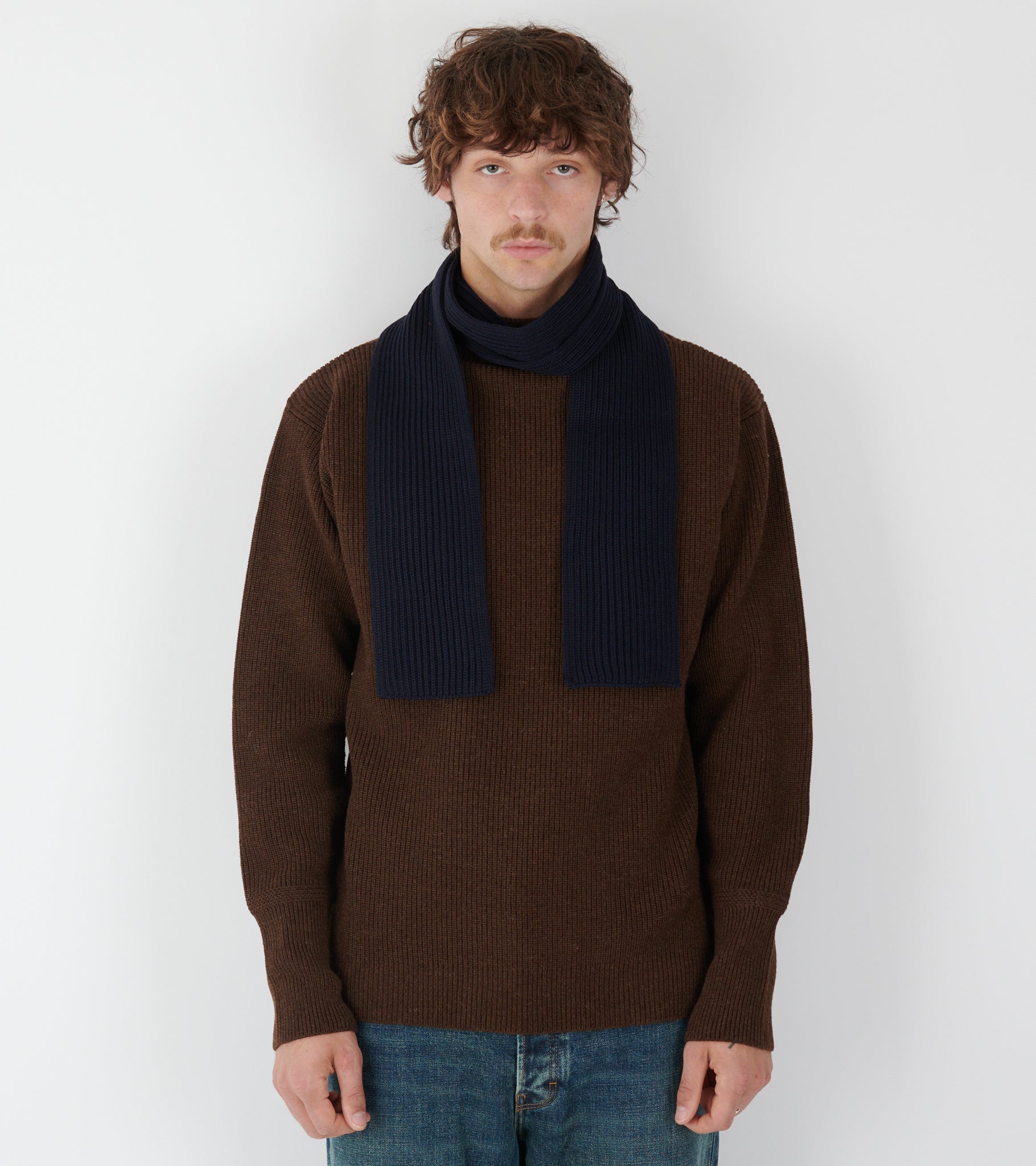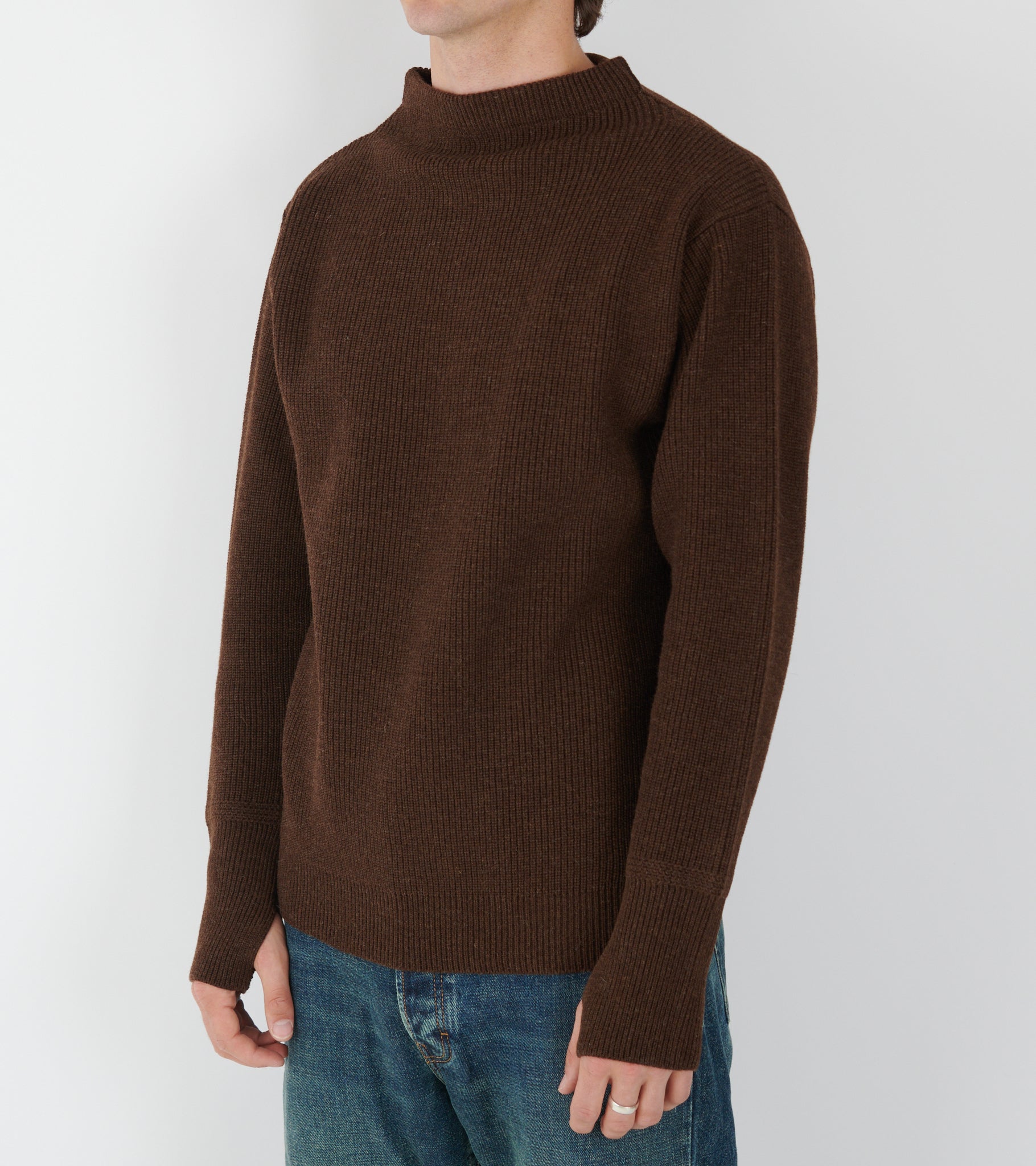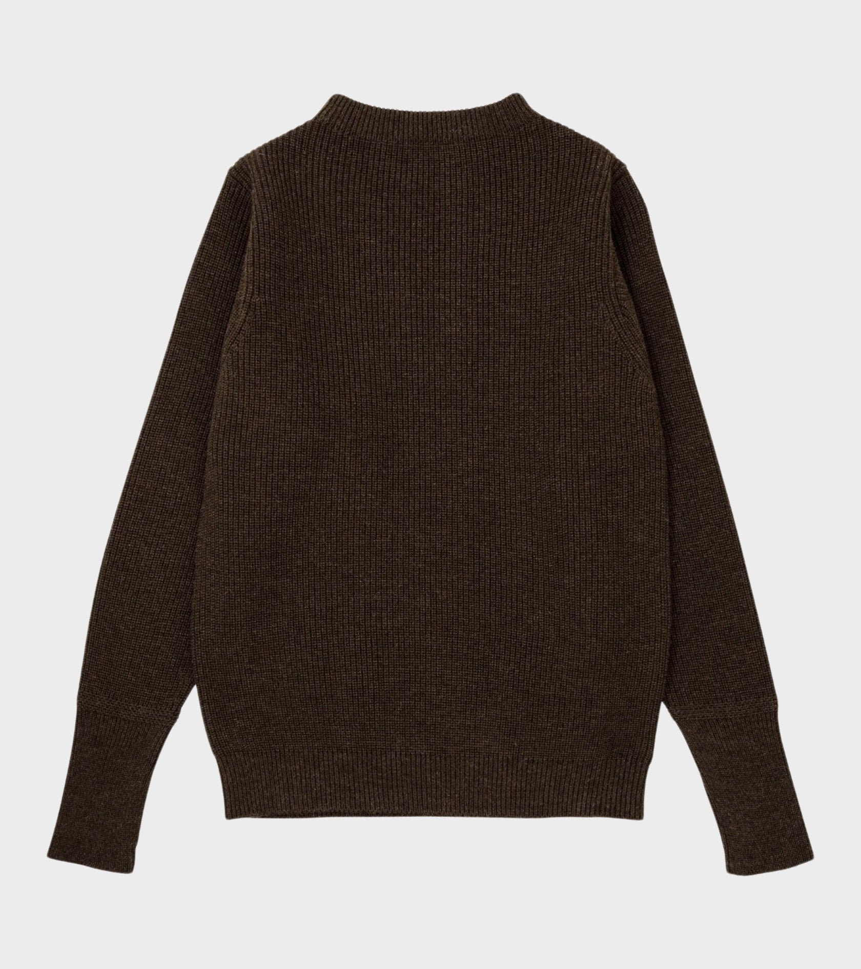 Brown knit from Andersen-Andersen. Sailor Crewneck is made from a heavy rib virgin wool and has a round neck, a thumb hole and extended sleeve rib at the ends.