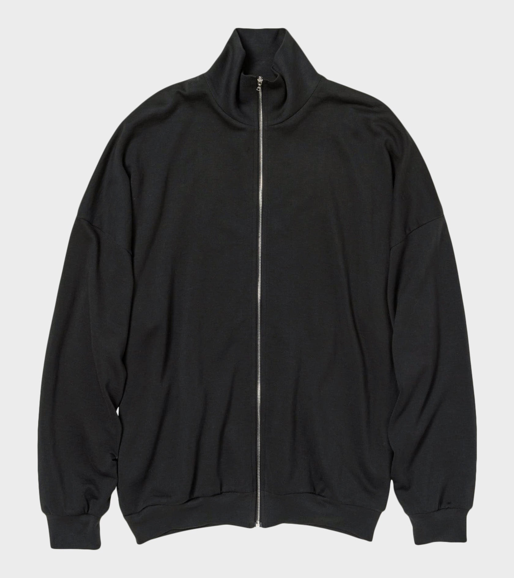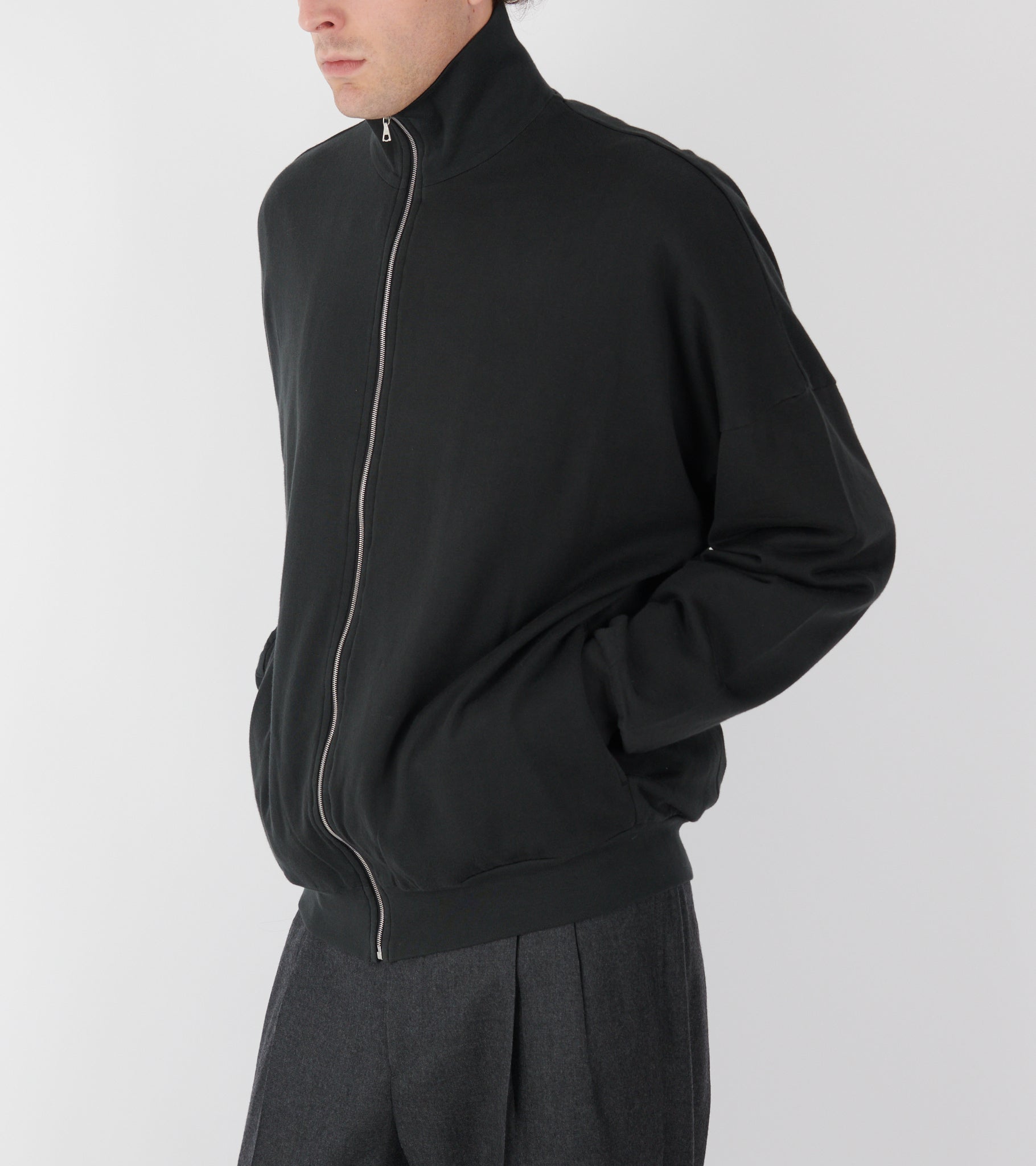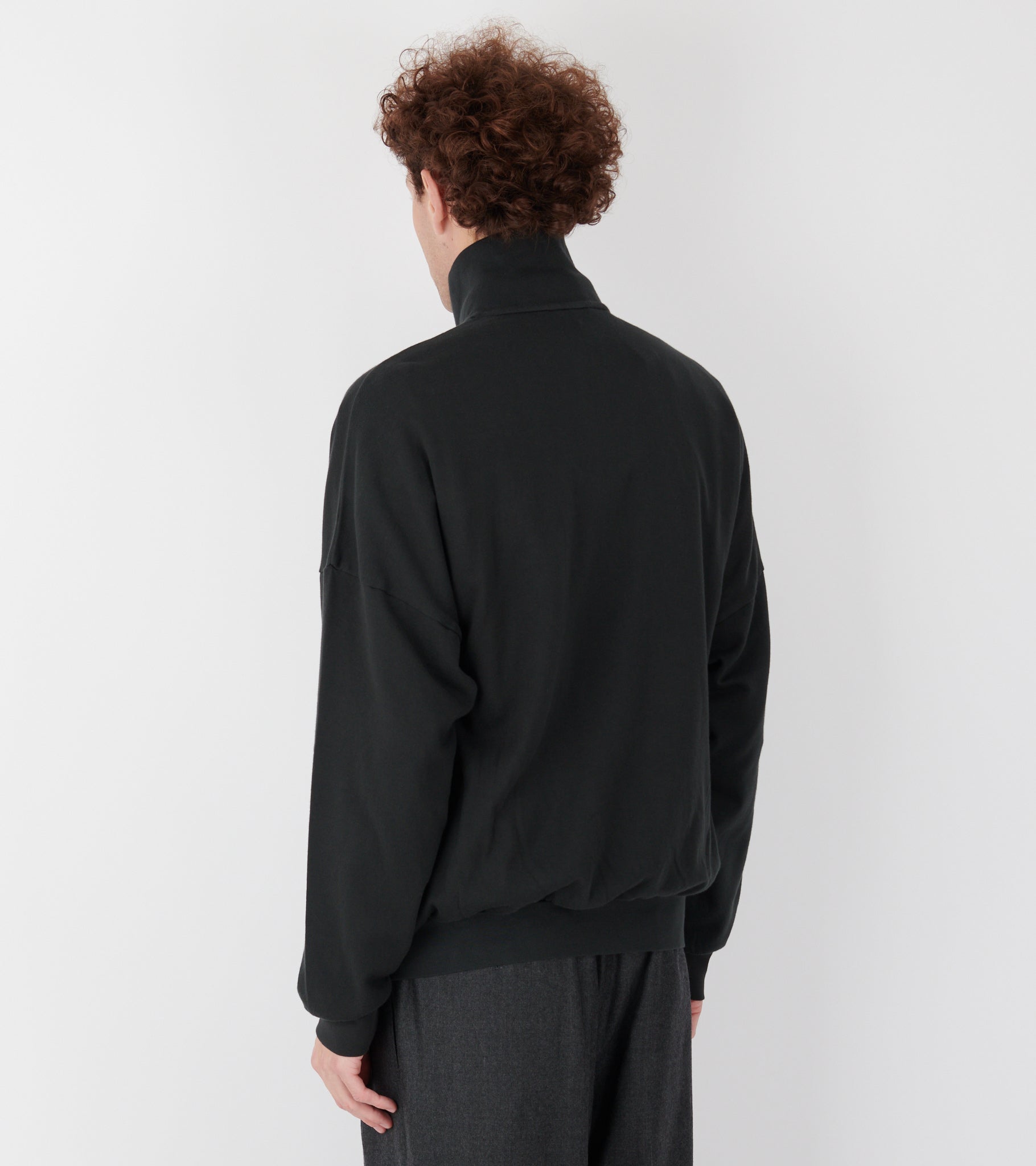Sweatshirt in a black shade from Auralee. This sweatshirt is made in a soft Pima cotton quality. It has a high neck, a zip closure and a discreet slanted pocket on each side.