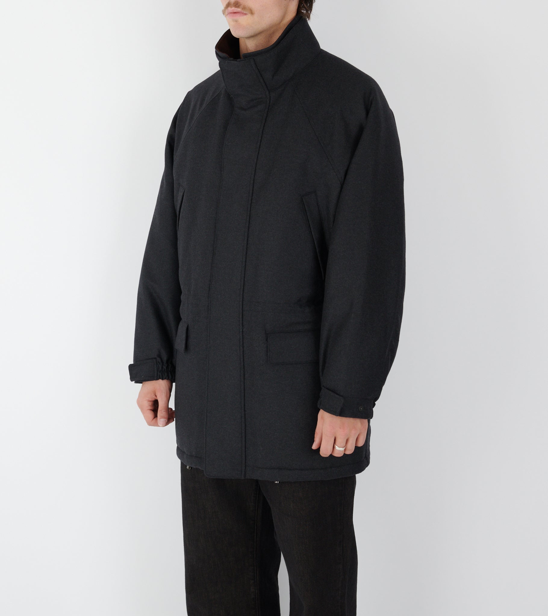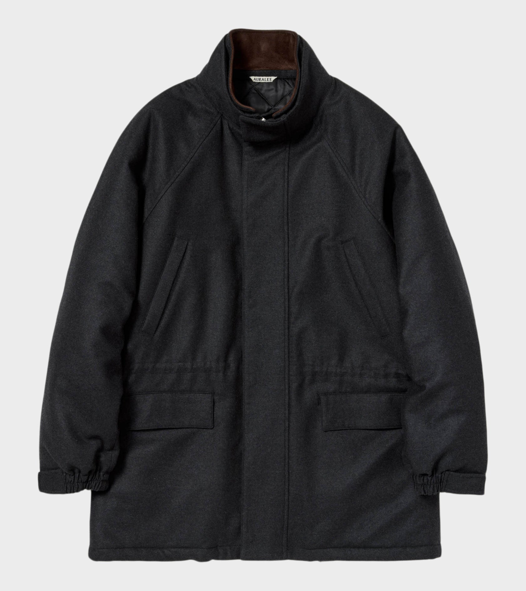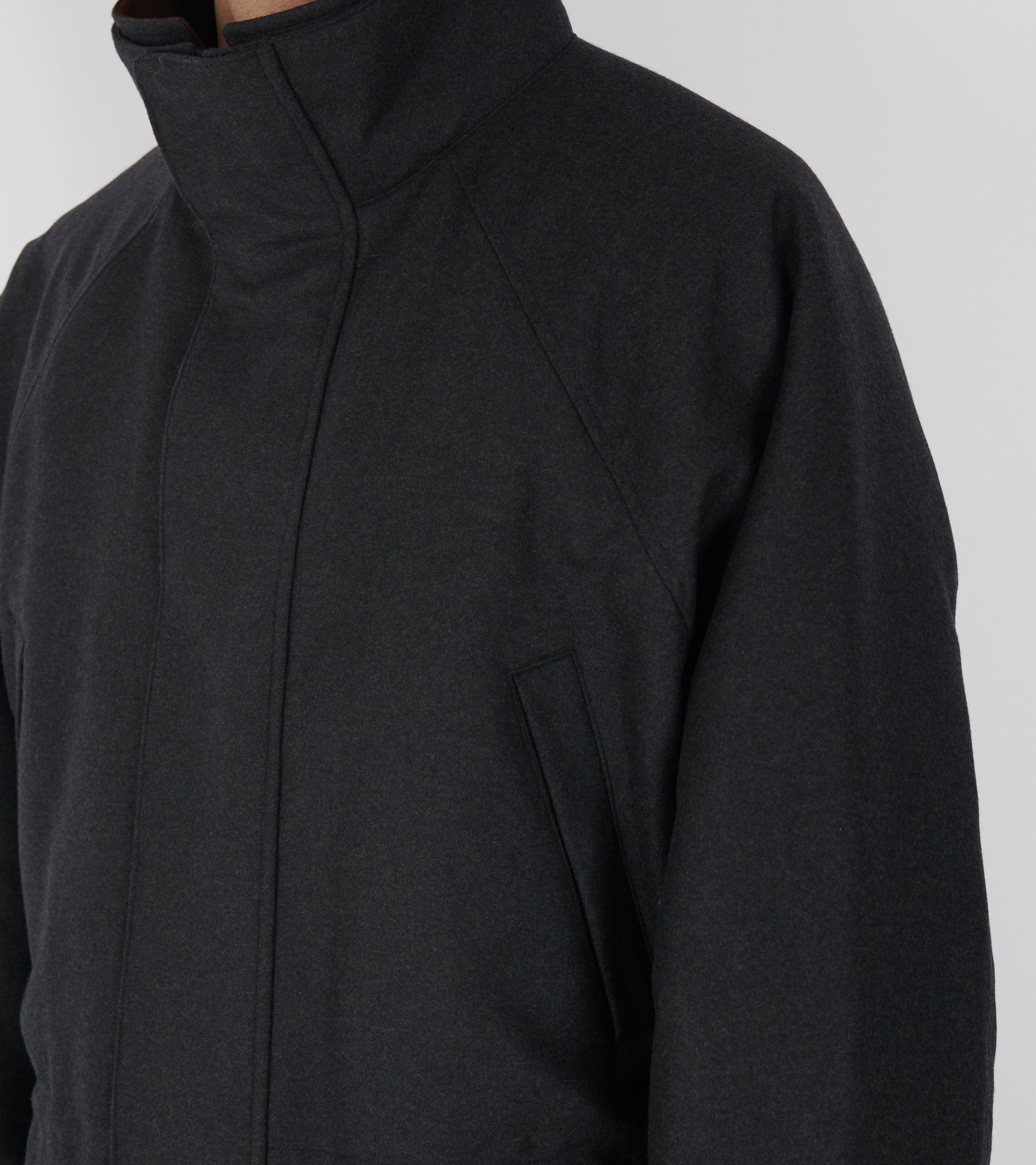 Dark grey coat in a merino wool flannel quality from Auralee. This coat has a high neck, a concealed zip and snap closure and four pockets on the front. The coat is padded and has an internal adjustable elastic at the waist. The collar is lined with brown suede.