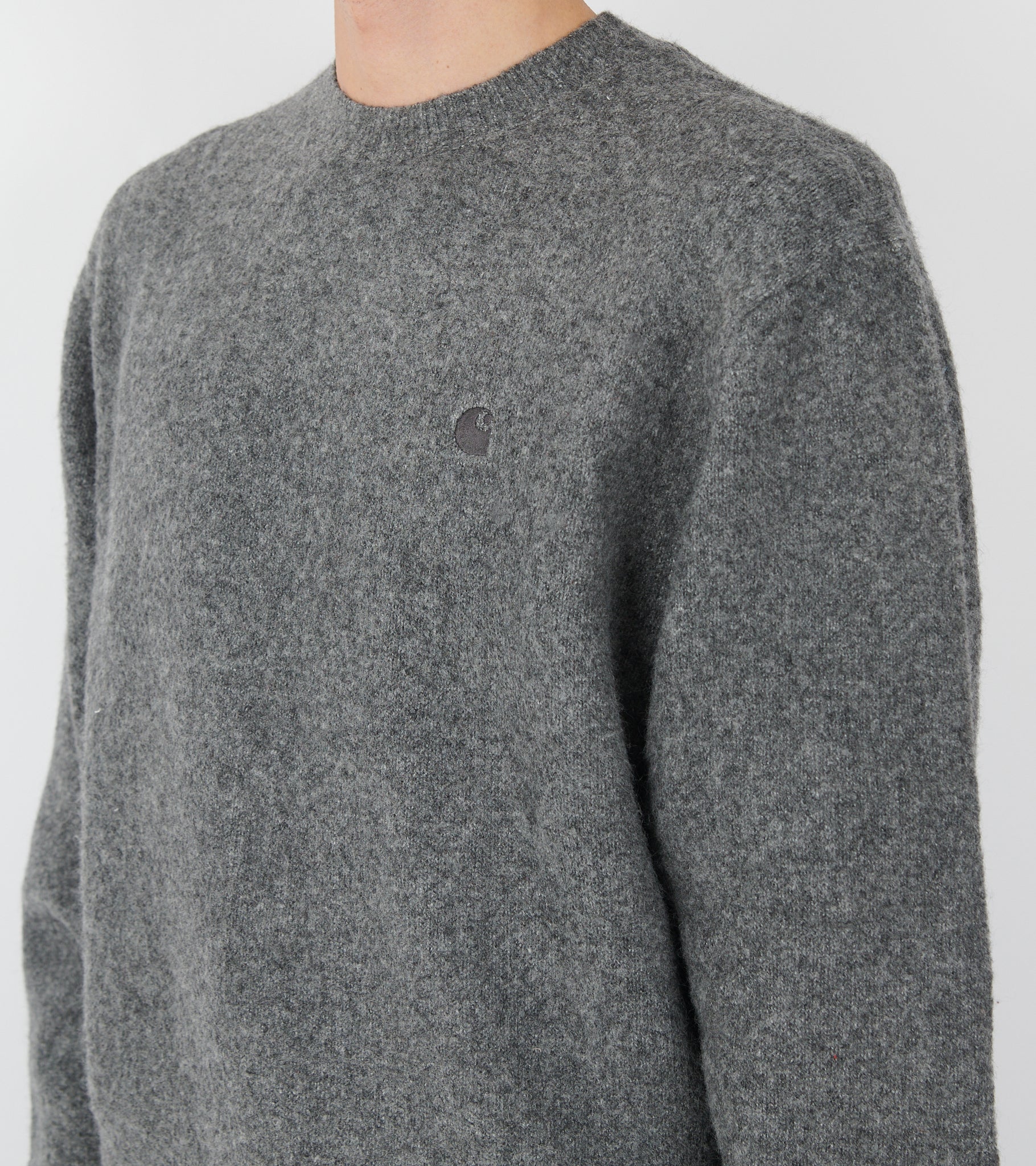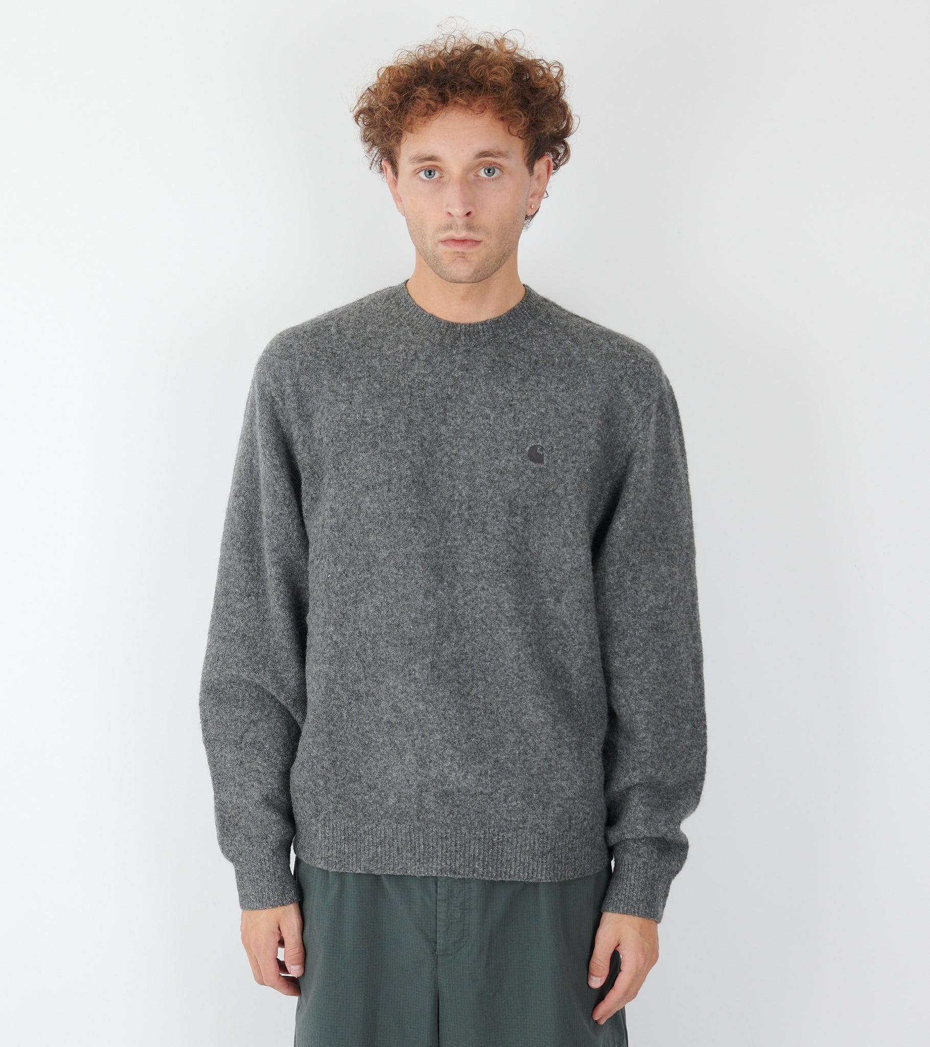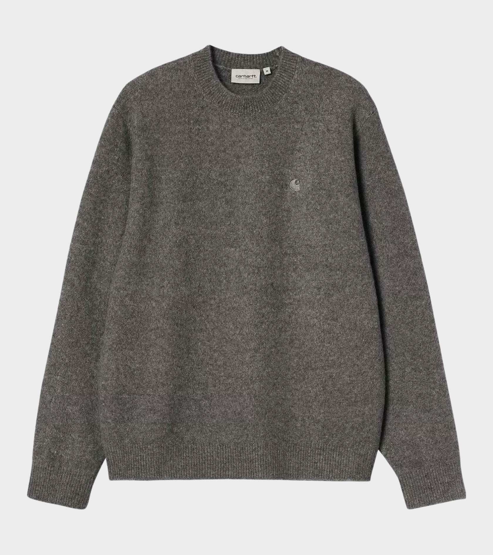 Grey knit from Carhartt WIP. The Curtis Sweater has a round neck and a embroidered logo at the left chest.