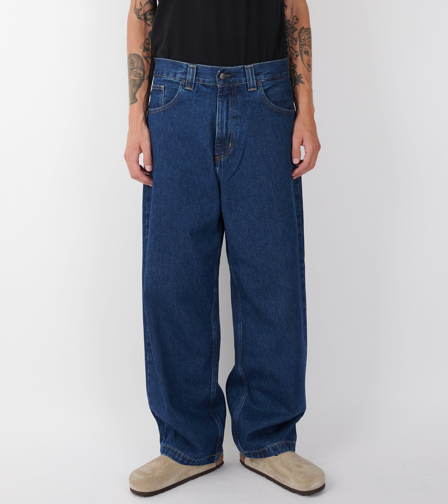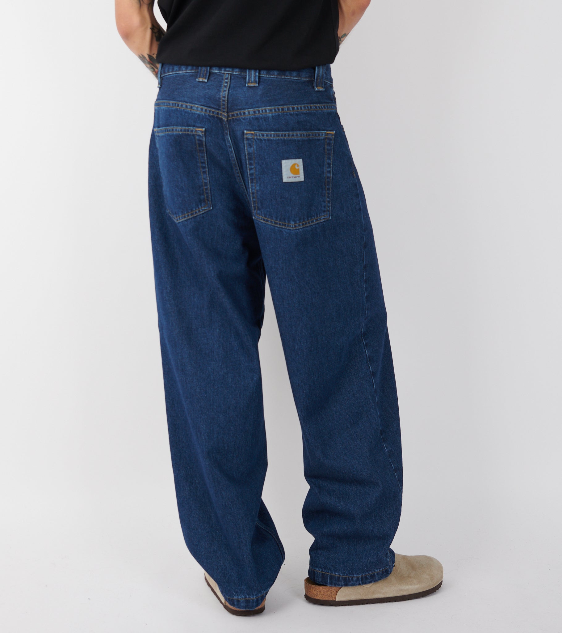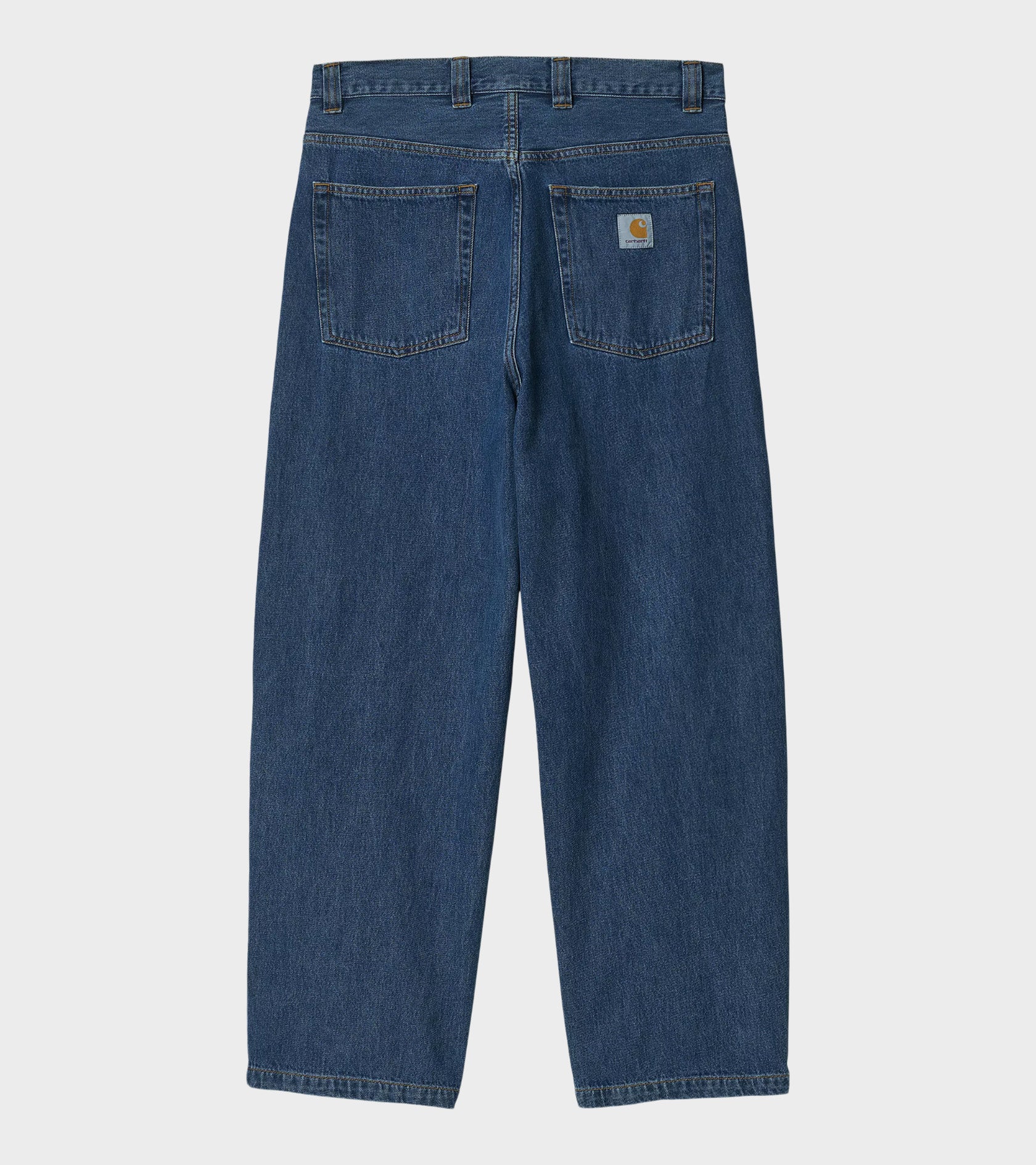 Blue jeans from Carhartt WIP. The Brandon Pant Blue Stone Washed is made from 'Smith' cotton denim. The pants have belt loops, a slant pocket on each side and two back pockets. On the back of one back pocket is the iconic logo. The pants have a relaxed silhouette with wide straight legs.