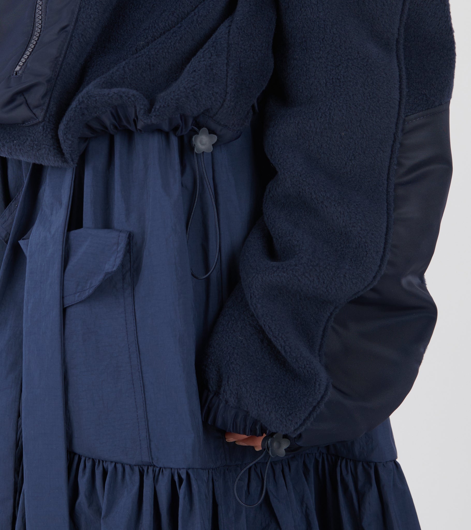 Navy fleece from Cecilie Bahnsen. Bastian Fleece Jacket has a mid-high neck with a half-zip closure, recycled nylon details and a large pocket on the front. The jacket is detailed with a large sewn-on nylon flower, flower buttons and small flowers at the zippers. At the bottom of the jacket is an adjustable elastic cord, so it can be adjusted in width.