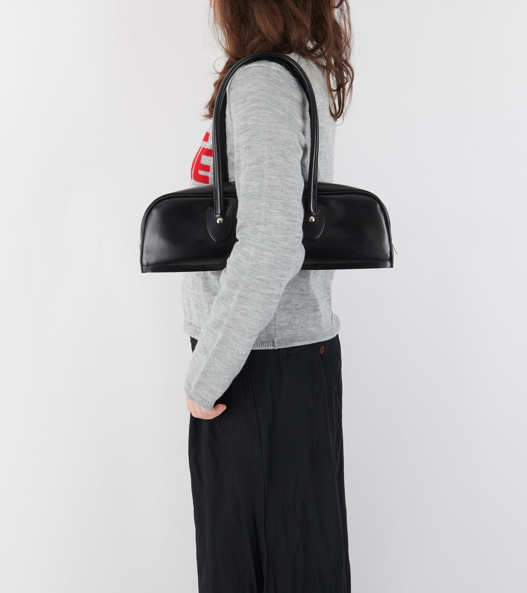 Large black shoulder bag from Comme des Garcons. The bag has a double handle, silver hardware, a zip closure, studs at the bottom, one central compartment and three small interior pockets.