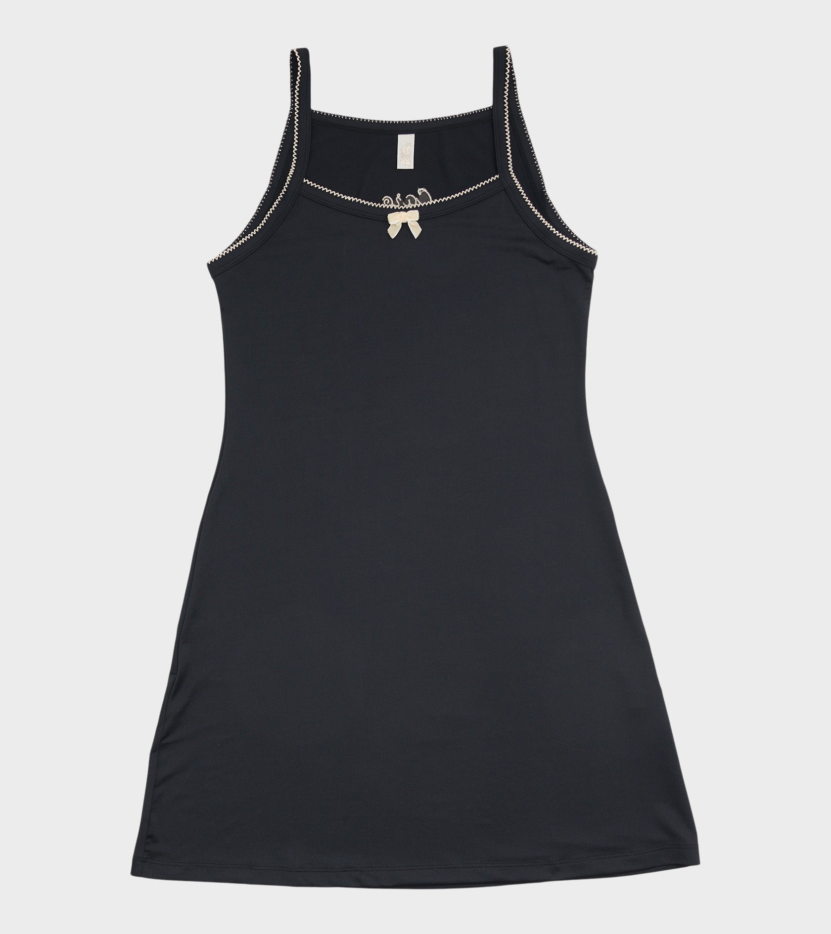 Short black dress from Caro Editions. Caro Slip Dress Black is made of a stretchy polyester quality and has thin straps and white wavy contrast edges. At the top of the front is a small white bow. At the top of the back is 'Caro' embroidered in white.