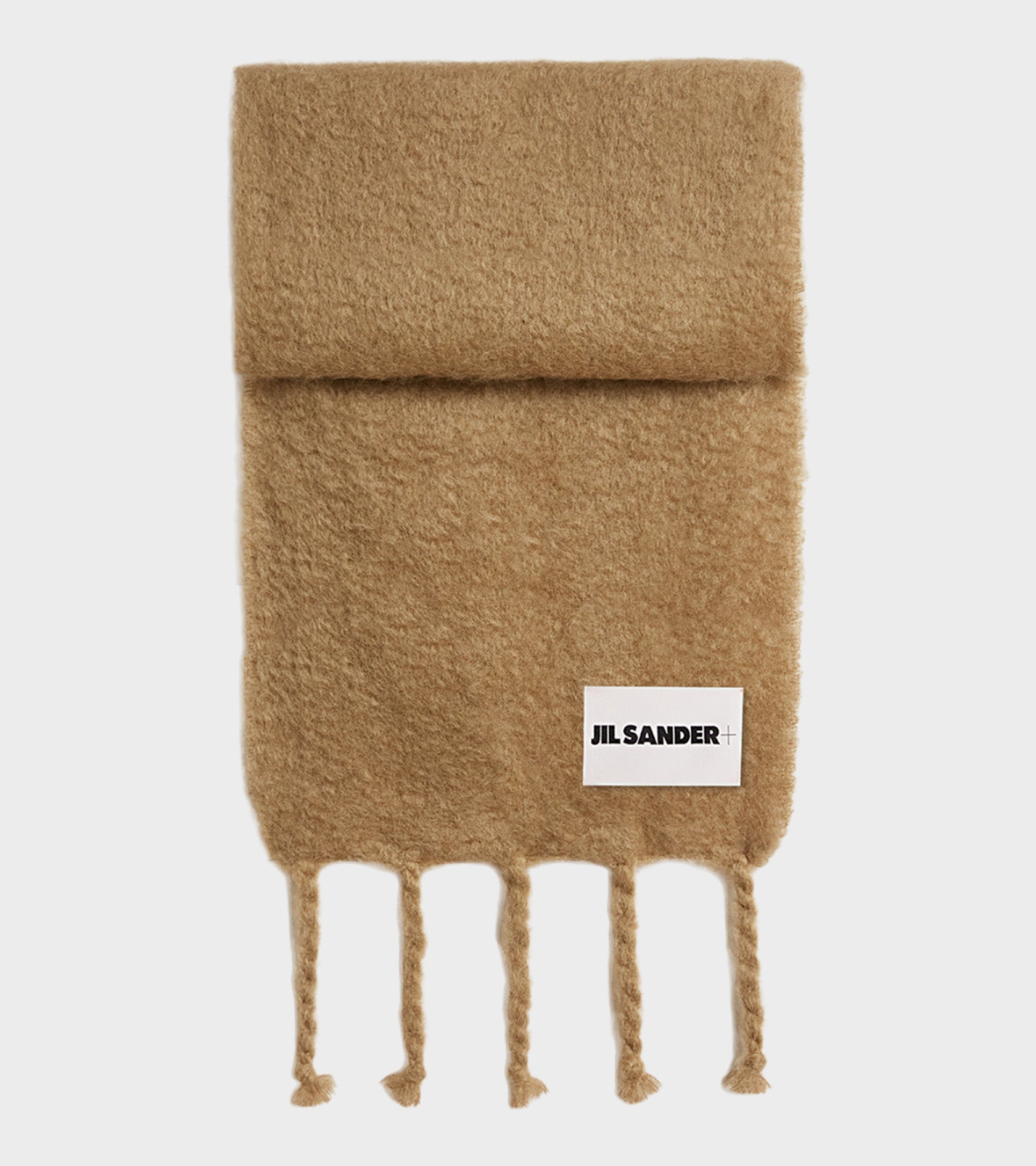 Beige scarf in a mohair wool blend from Jil Sander. The scarf has a white logo tag and fringes at the ends.