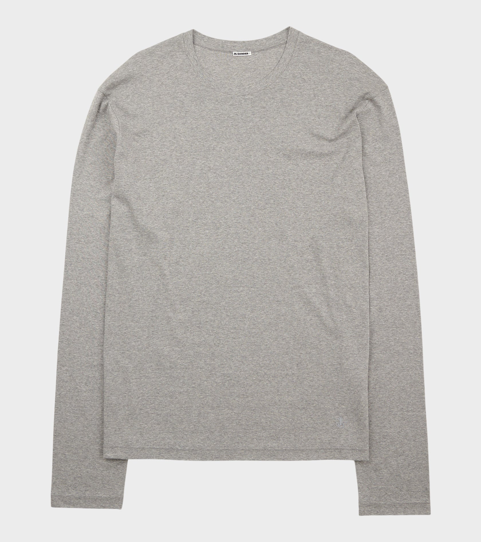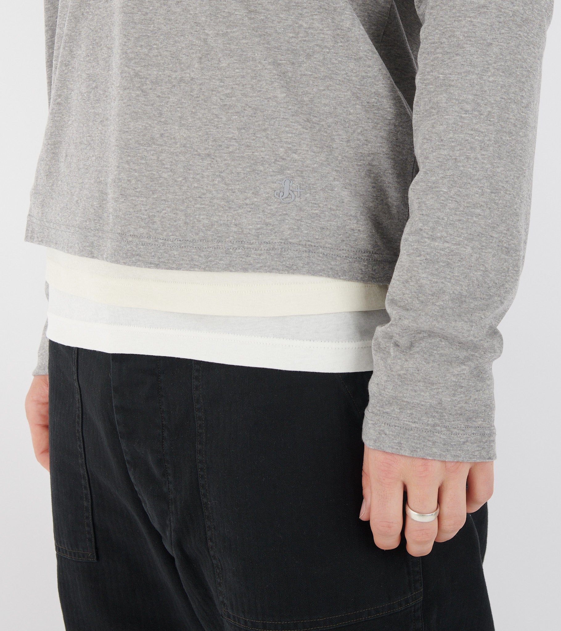 Layered set consisting of a white top as well as an off-white and a grey long-sleeved t-shirt from Jil Sander. The grey long-sleeved one has an embroidered tone-in-tone logo on the lower left side.