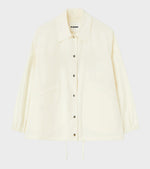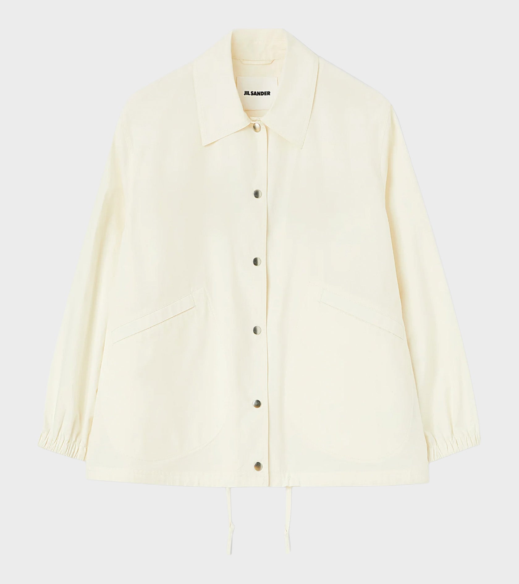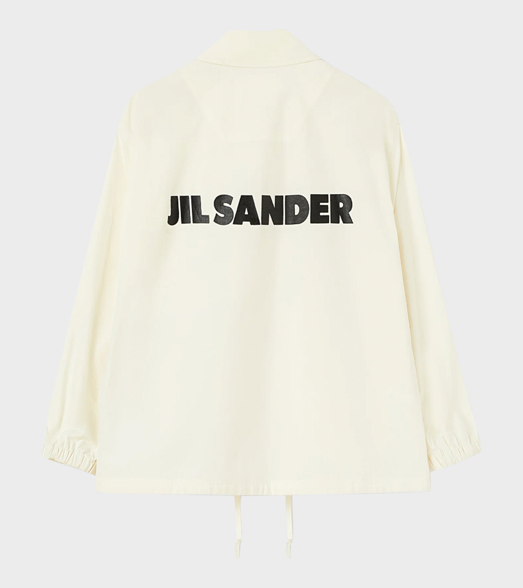 Off-white jacket from Jil Sander. The jacket has a classic collar, a slanted pocket on each side and a button closure with silver snaps. On the back is a large black logo. The jacket has an internal adjustable drawstring at the bottom.