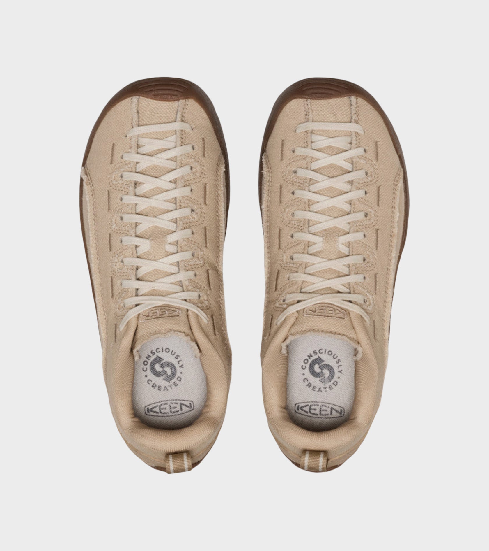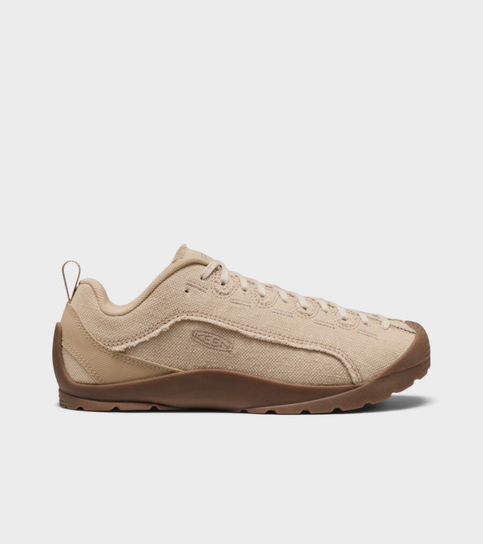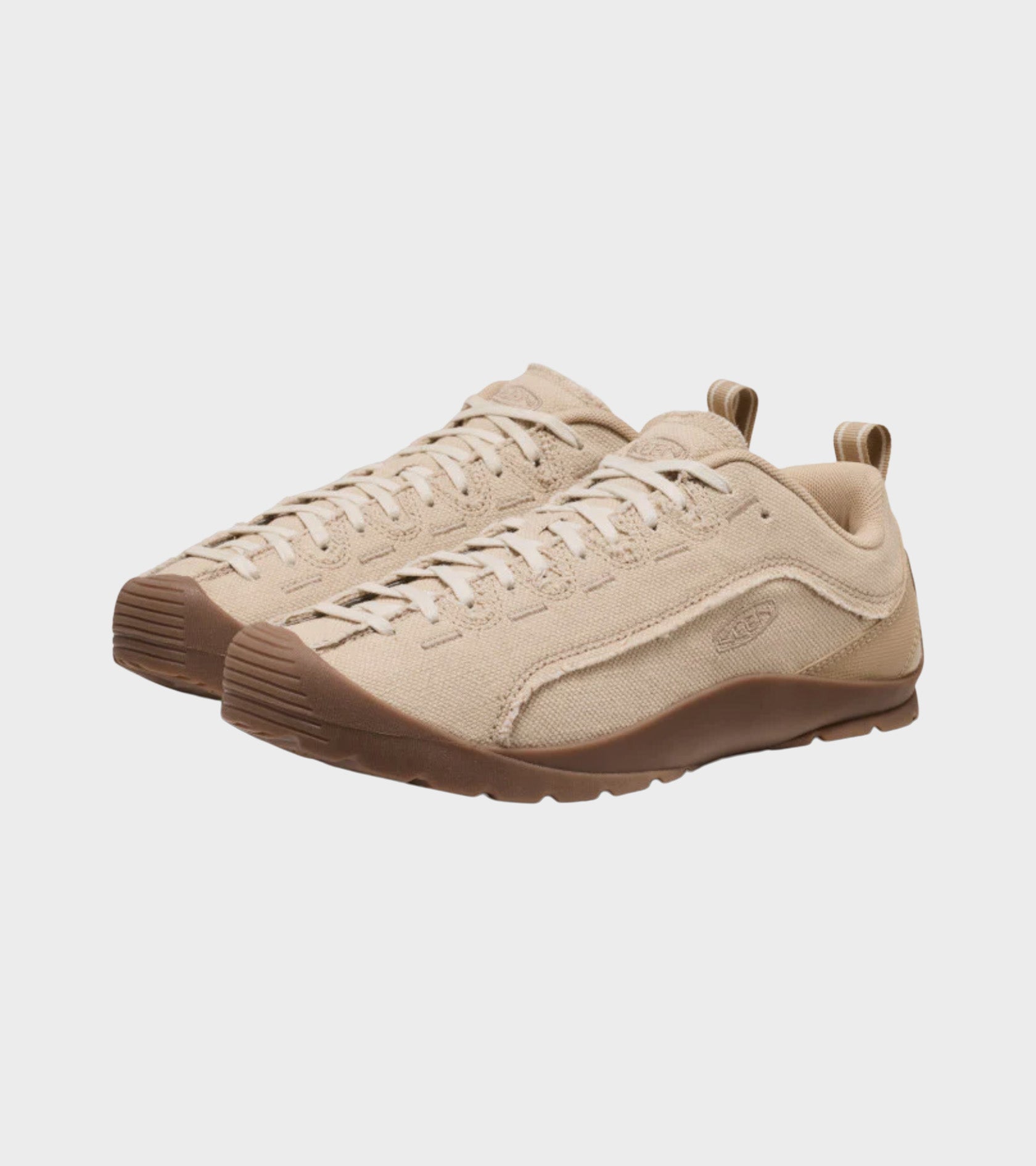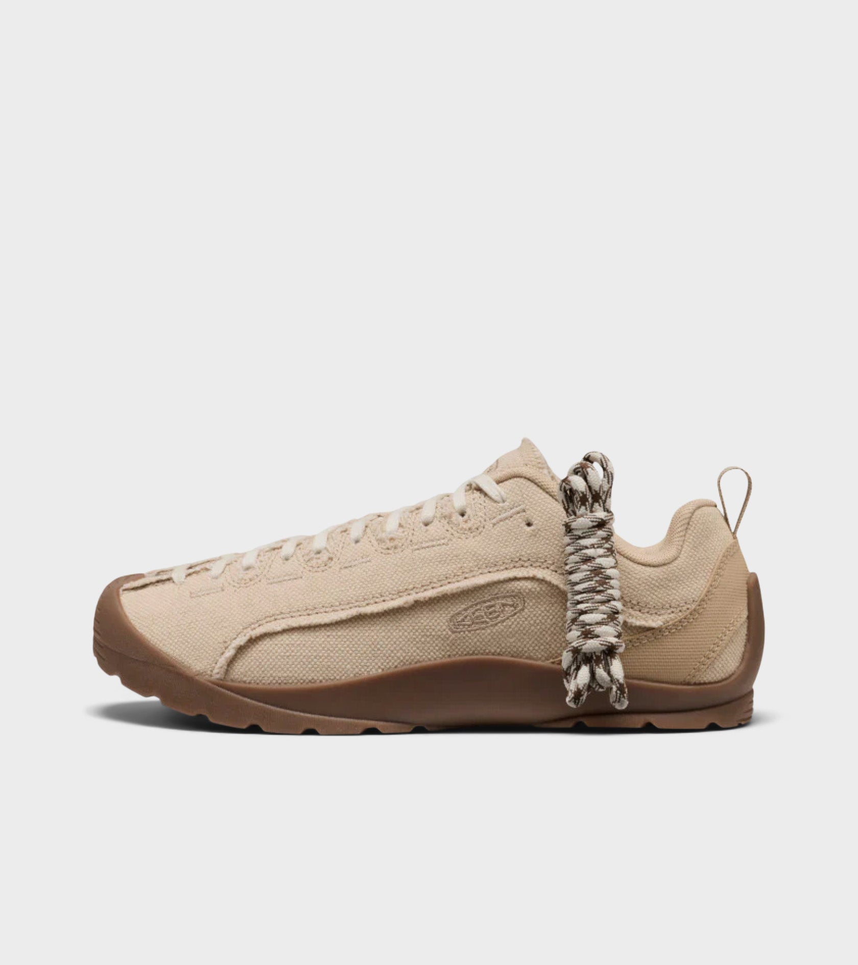 Climbing-inspired sneakers in light beige canvas from Keen. The Jasper has a cork and latex footbed that molds to the shape of your foot. It has laces that go all the way to the toe and a plain rubber outsole. On the side and tongue is a discreet embroidered logo.