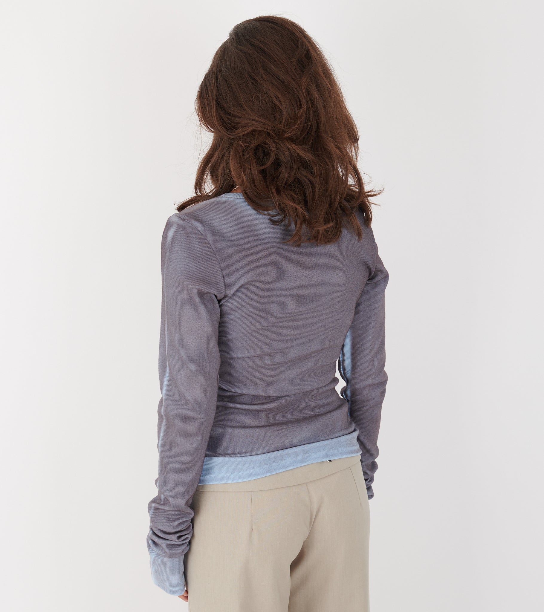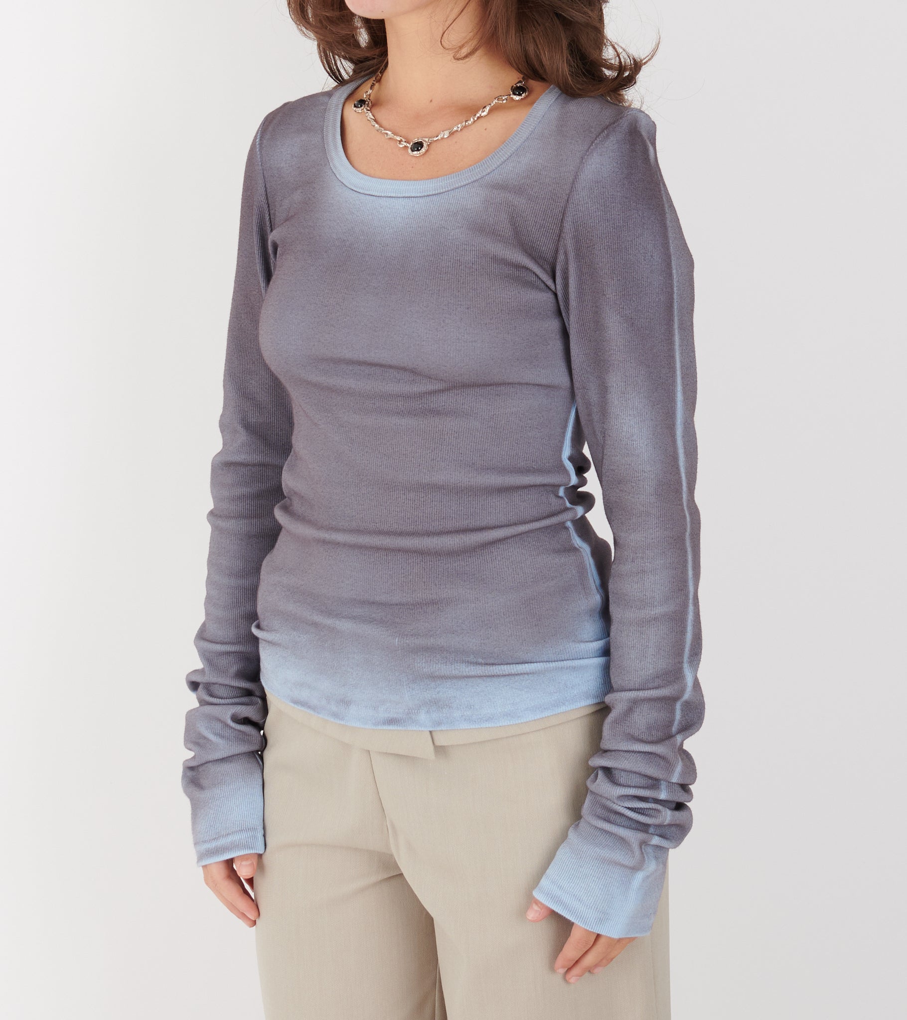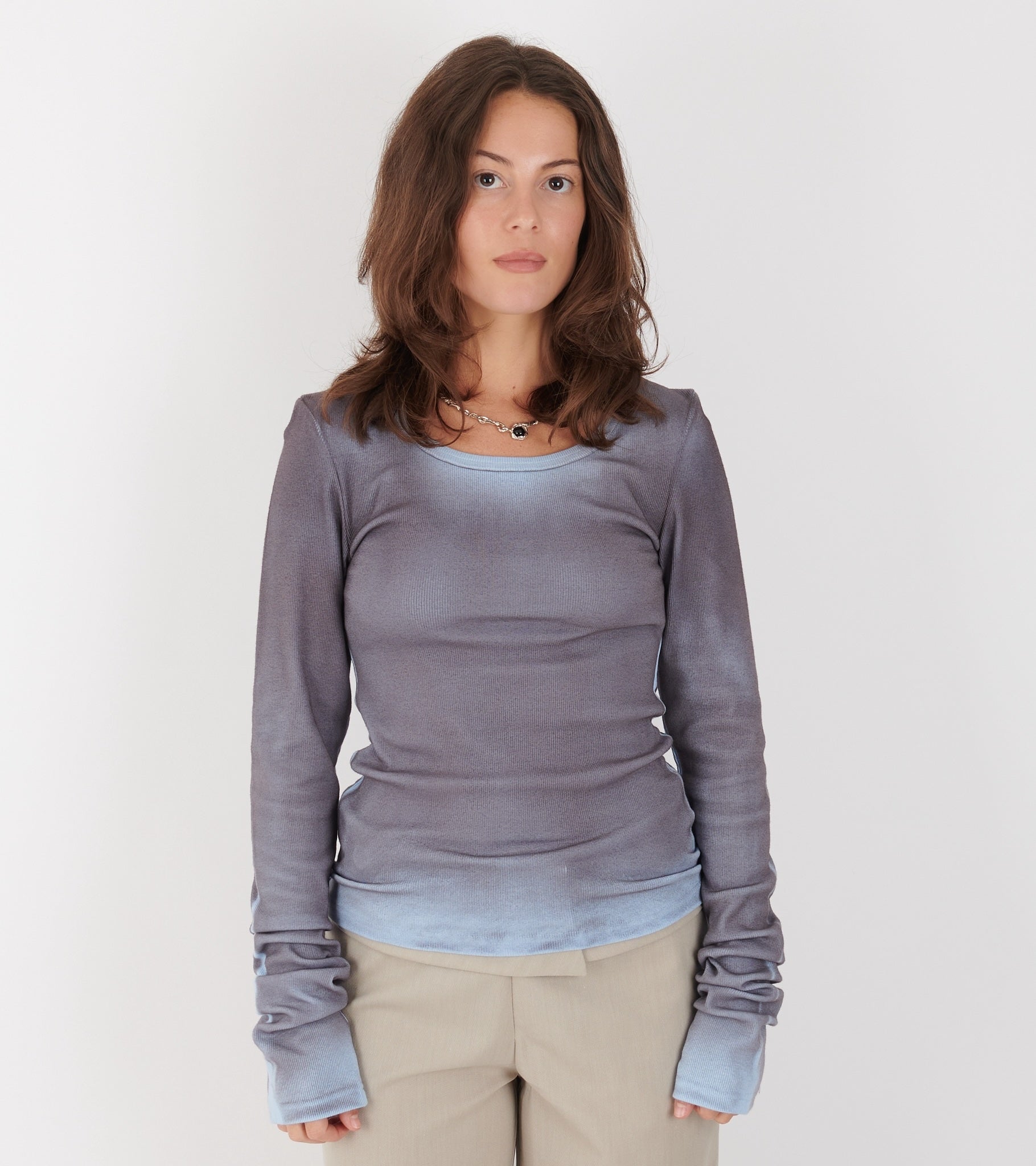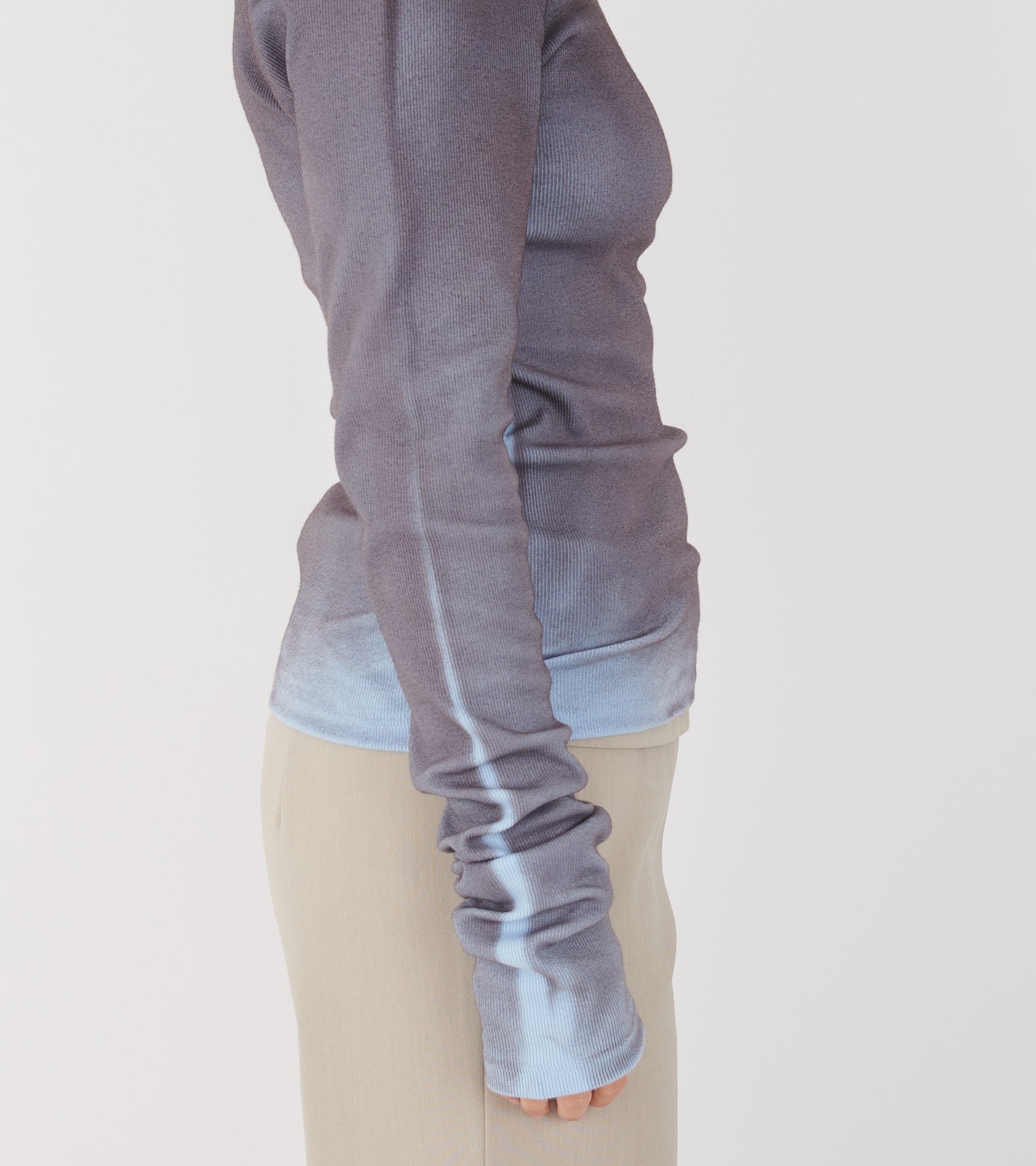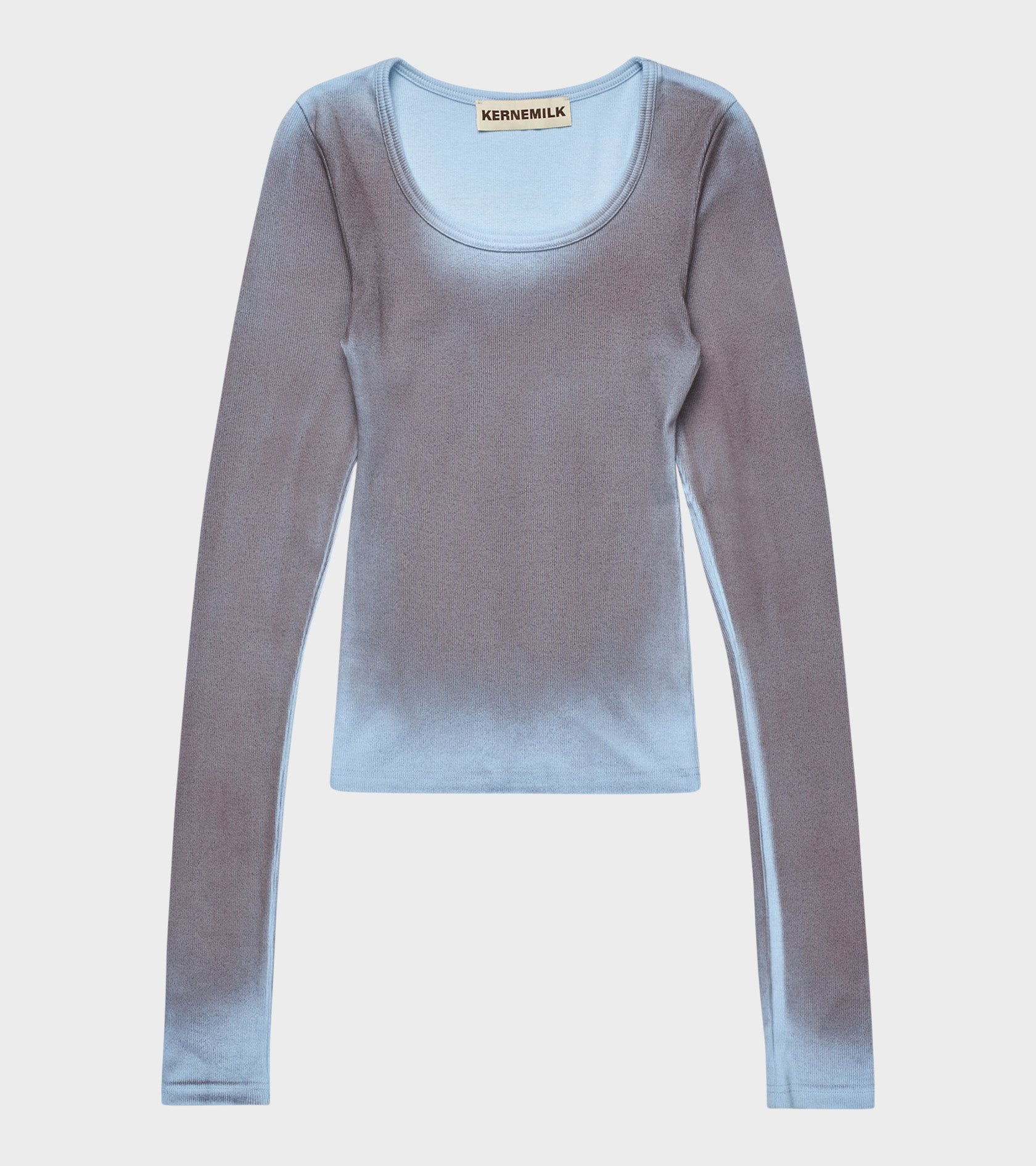 Java Blouse from Kernemilk. The blouse has a round neckline and extra long sleeves. It is made in a stretchy organic cotton rib.