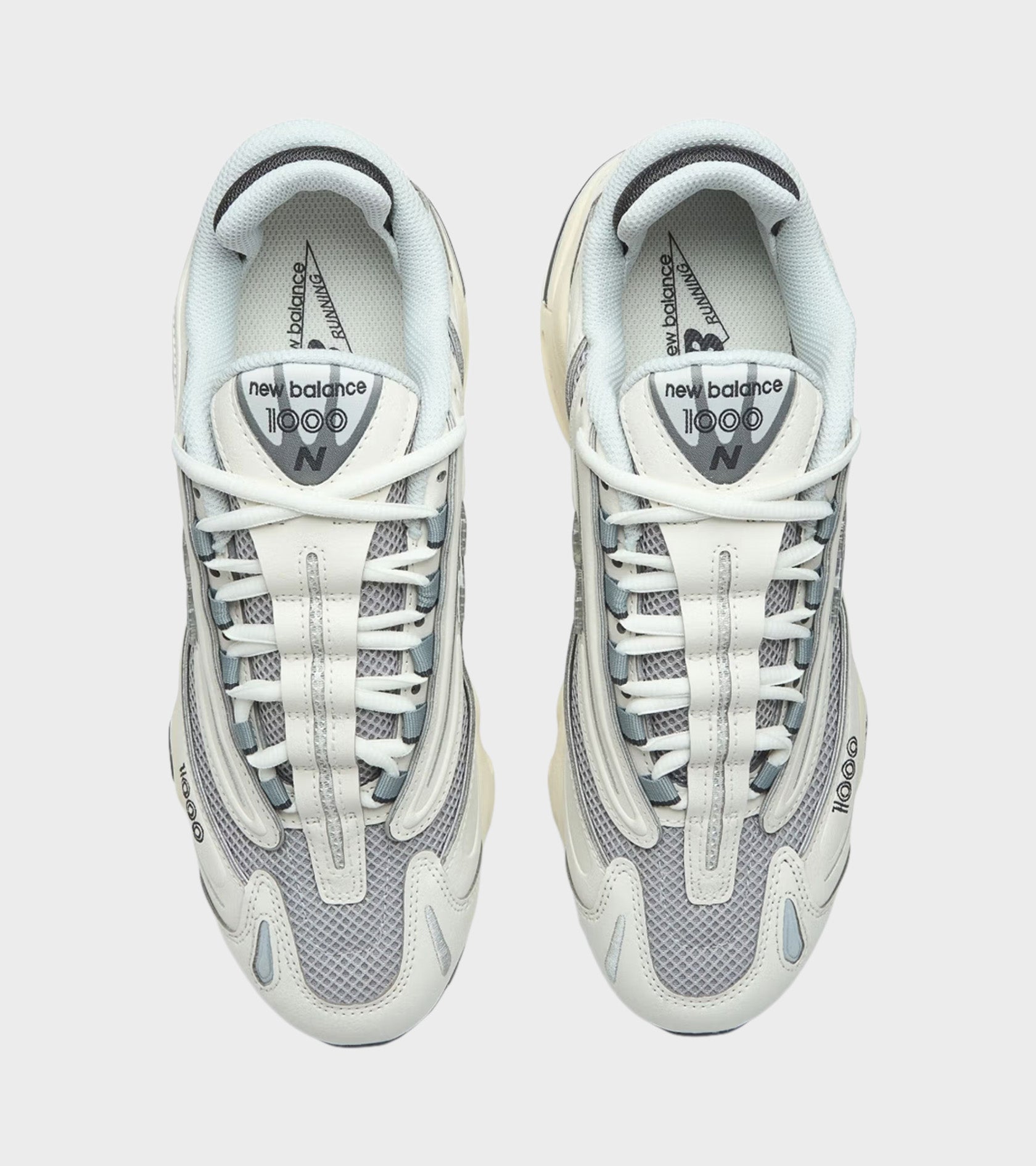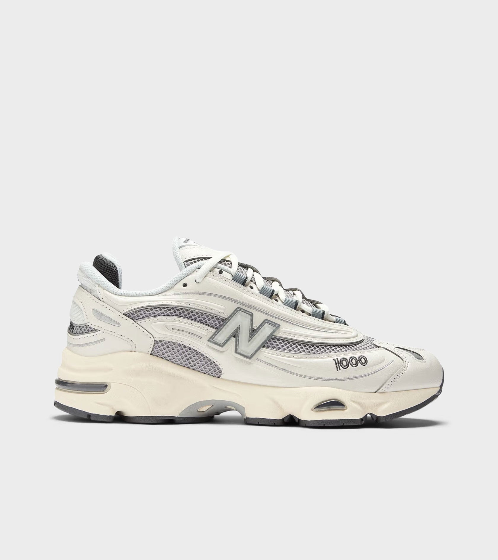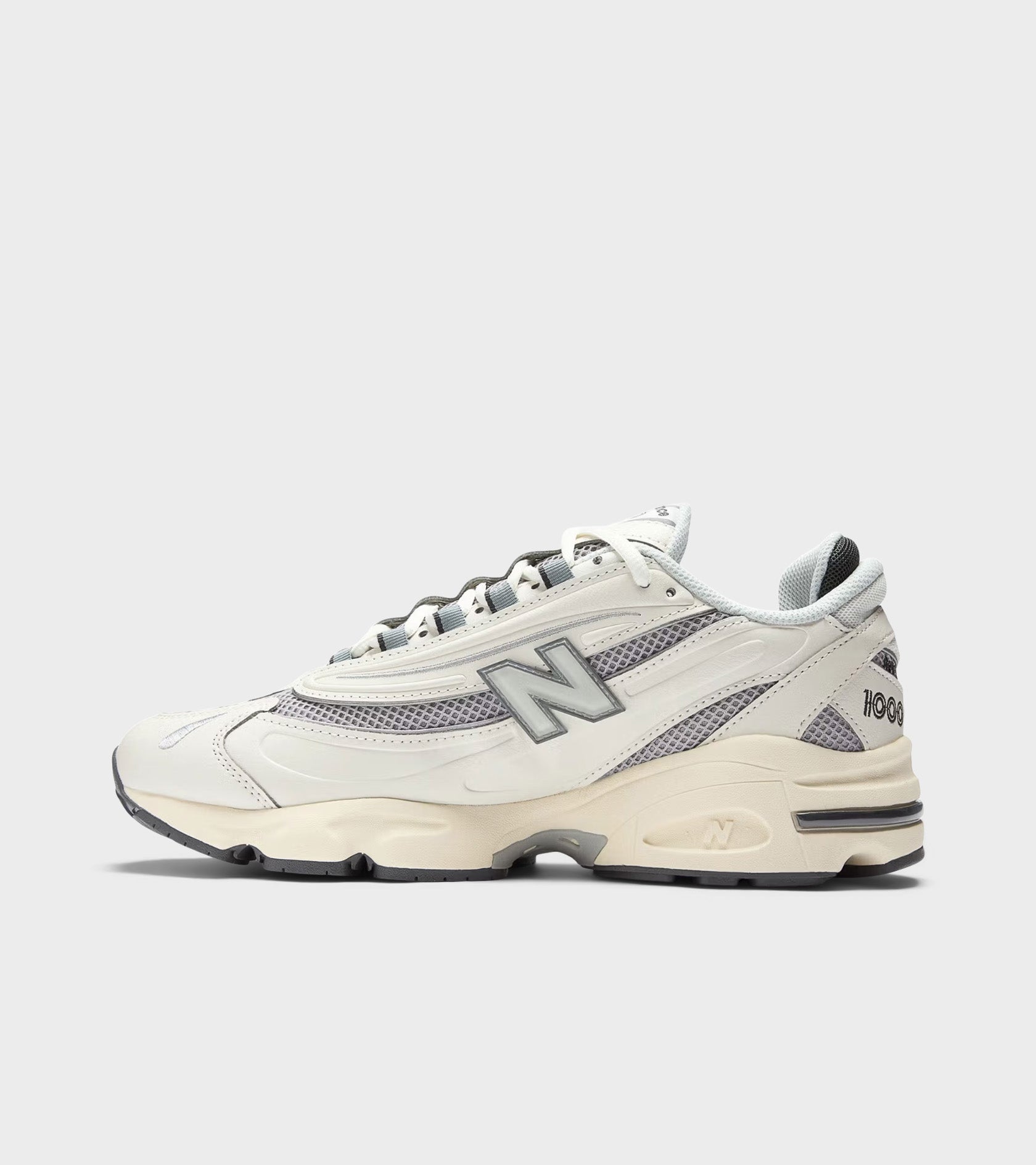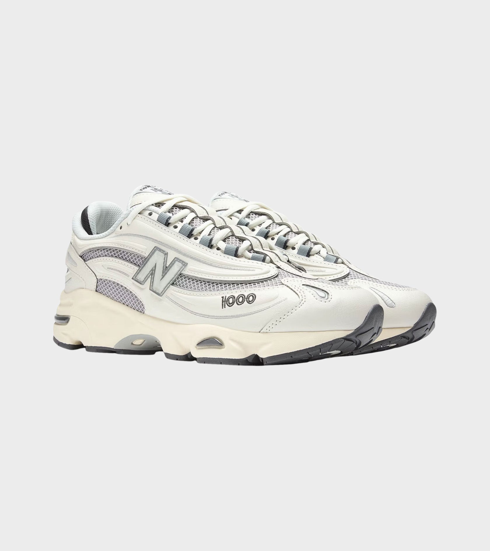 M1000MEW from New Balance in a white version with grey details. These sneakers have a leather and mesh upper.