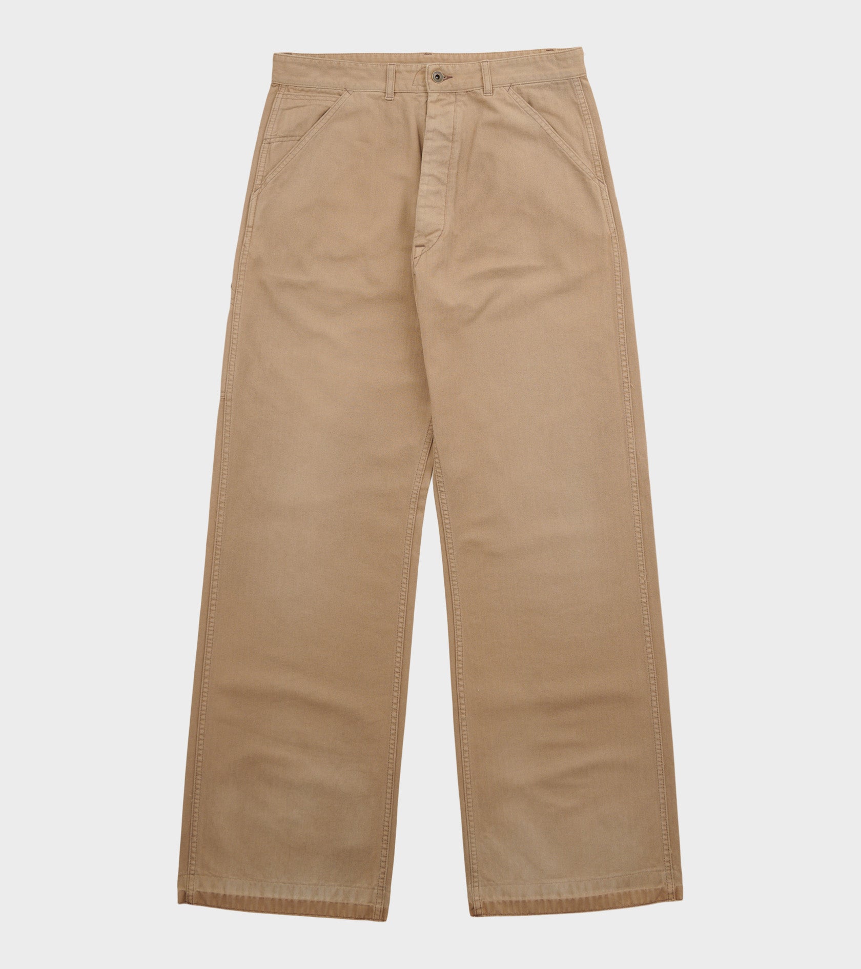 Beige pants in striped cotton canvas from Maison Margiela. The pants have a classic 5-pocket design, belt loops and wide straight legs. At the bottom is a 'ragged turn-up effect'. At the top back is the iconic 'Four Stitchings'.