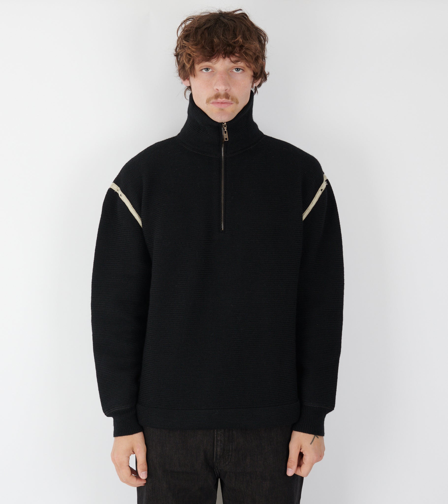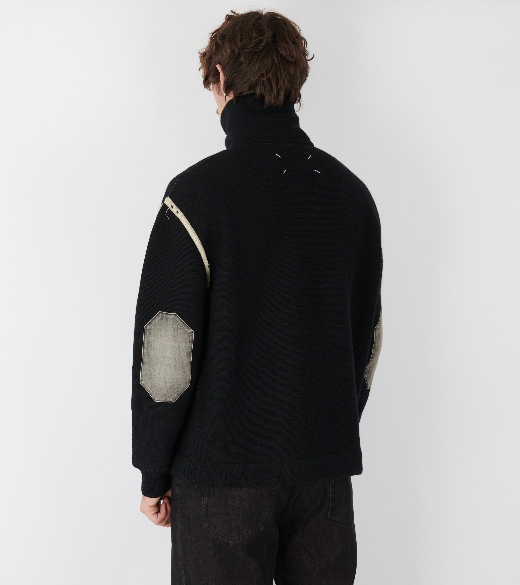 Black reversible knit in heavy virgin wool from Maison Margiela. This knit has a crew neck, a half-zip closure and distressed off-white contrast edges at the sleeves. At the elbows is patch details. At the top back is the iconic 'Four Stitchings'.