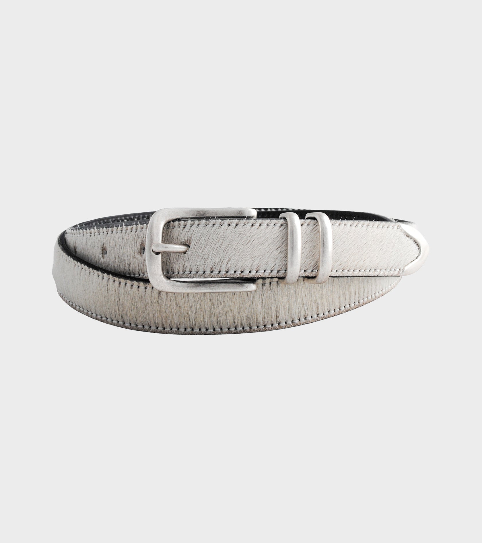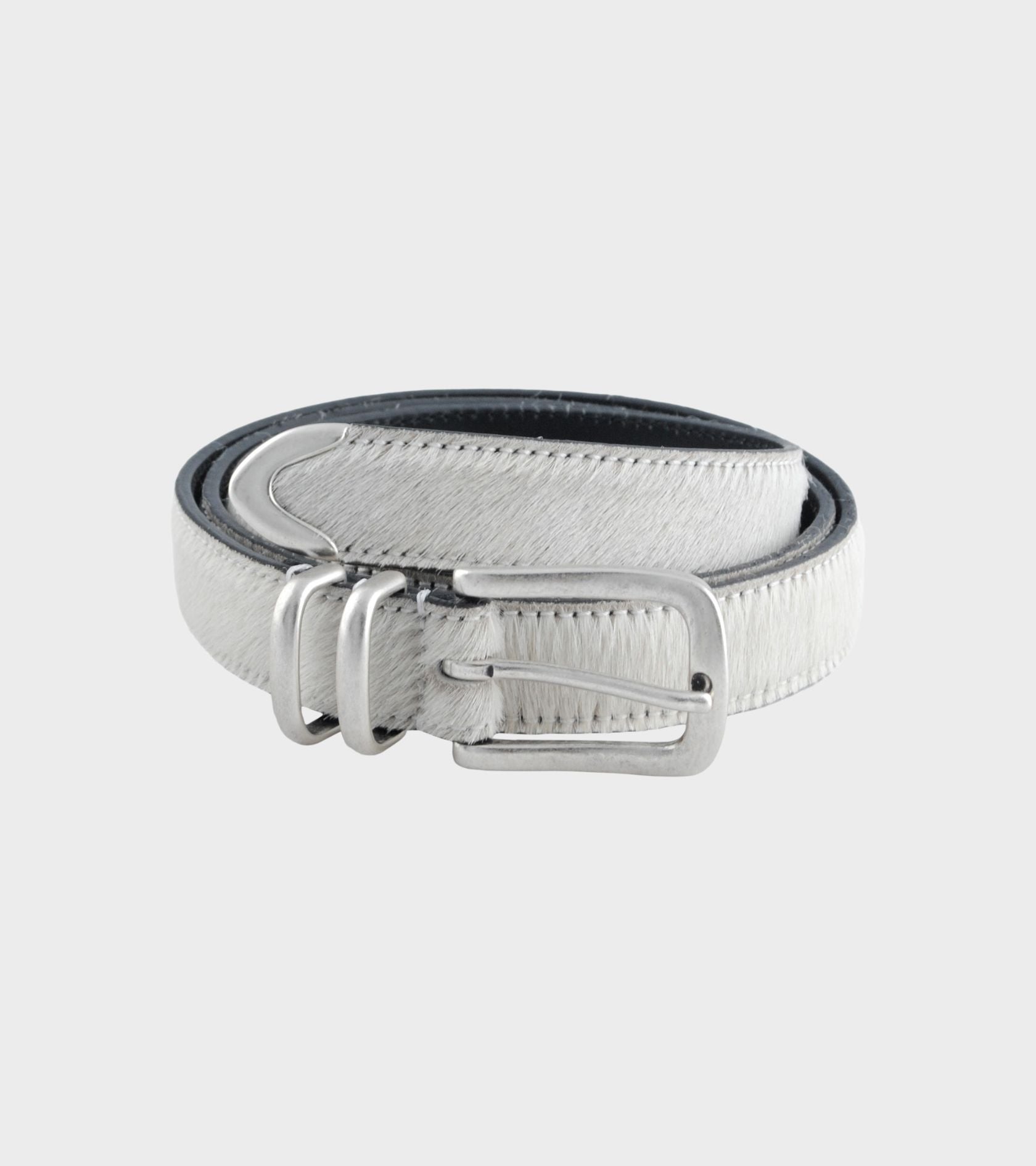 White/off-white pony belt with silver hardware from Molebo. The belt is made on Funen by passionate belt makers. Molebo only uses luxury raw materials from the finest Italian hardware suppliers and all leather is gold and silver certified by the Leather Working Group.