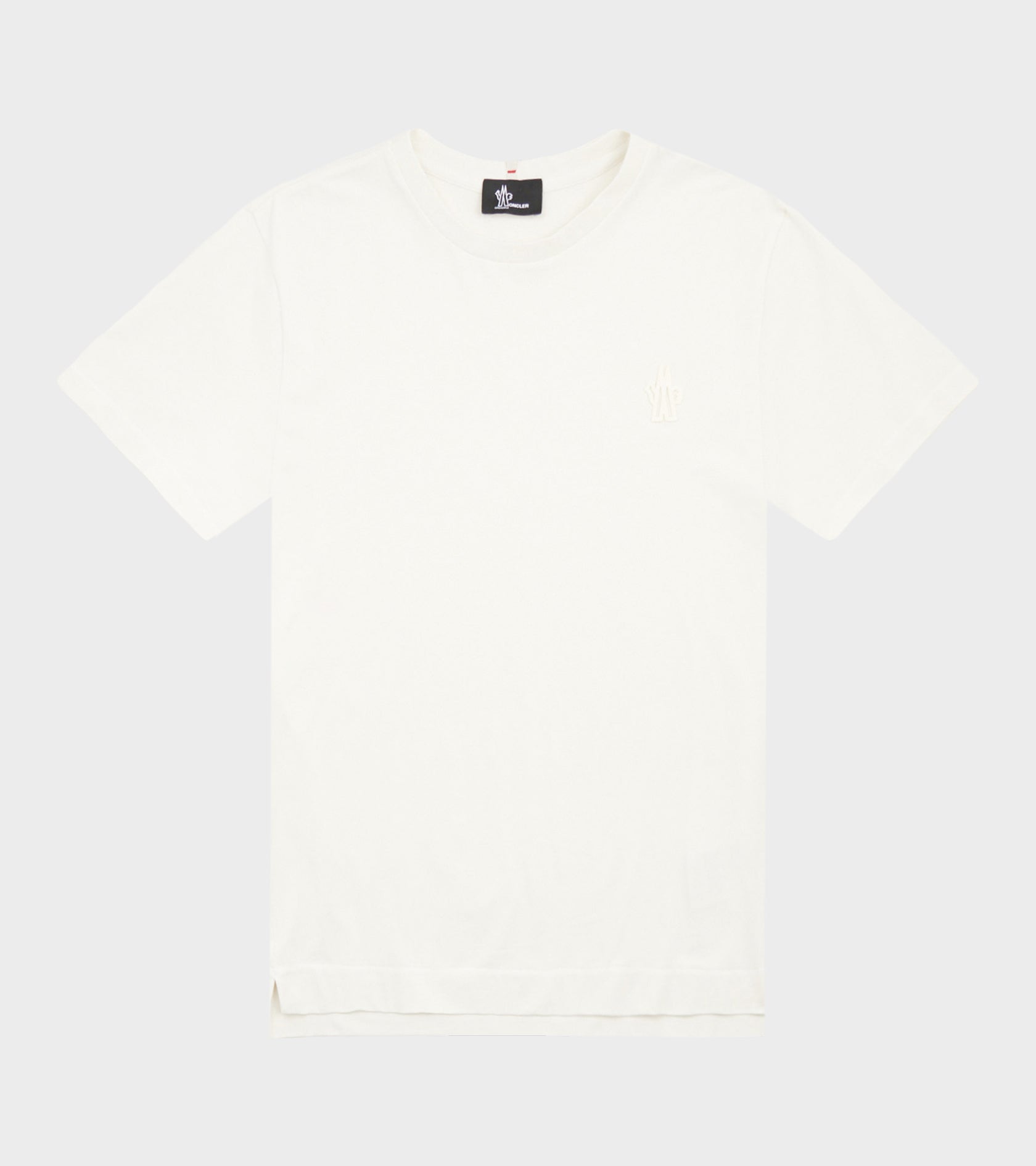 White t-shirt from Moncler Grenoble. The t-shirt has a logo on the left chest and a small slit on each side. At the bottom of the left side and at the top of the back is a small logotag.