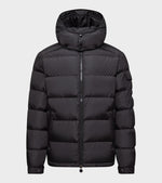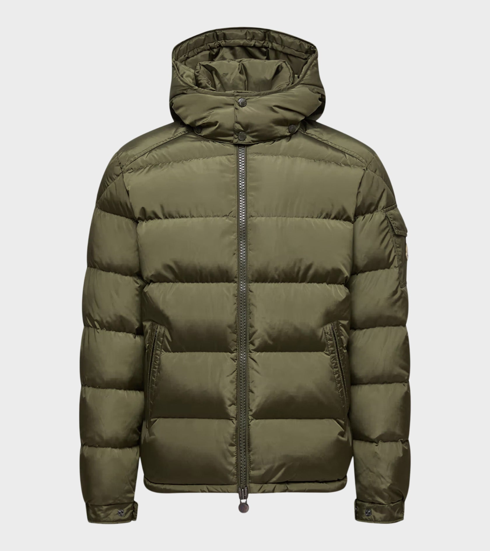 Olive green down jacket from Moncler. Maya Matte Down Jacket Olive Green is made of nylon and is padded with soft down and feathers. The jacket has a removable hood, a two-way zip closure, a zip pocket on each side and a pocket on the left sleeve - on the pocket is the iconic logo in felt.