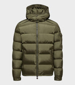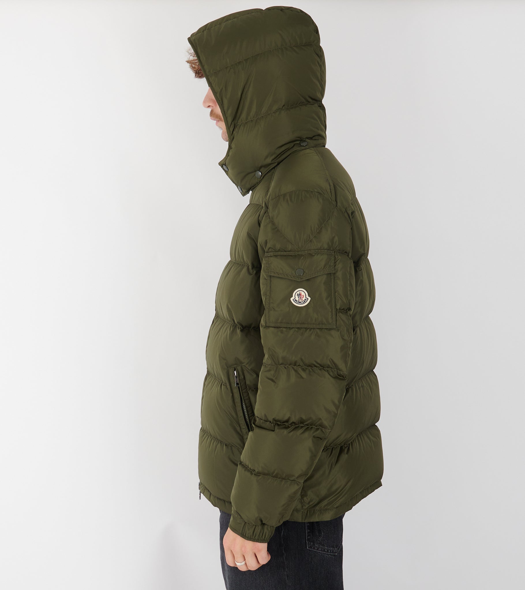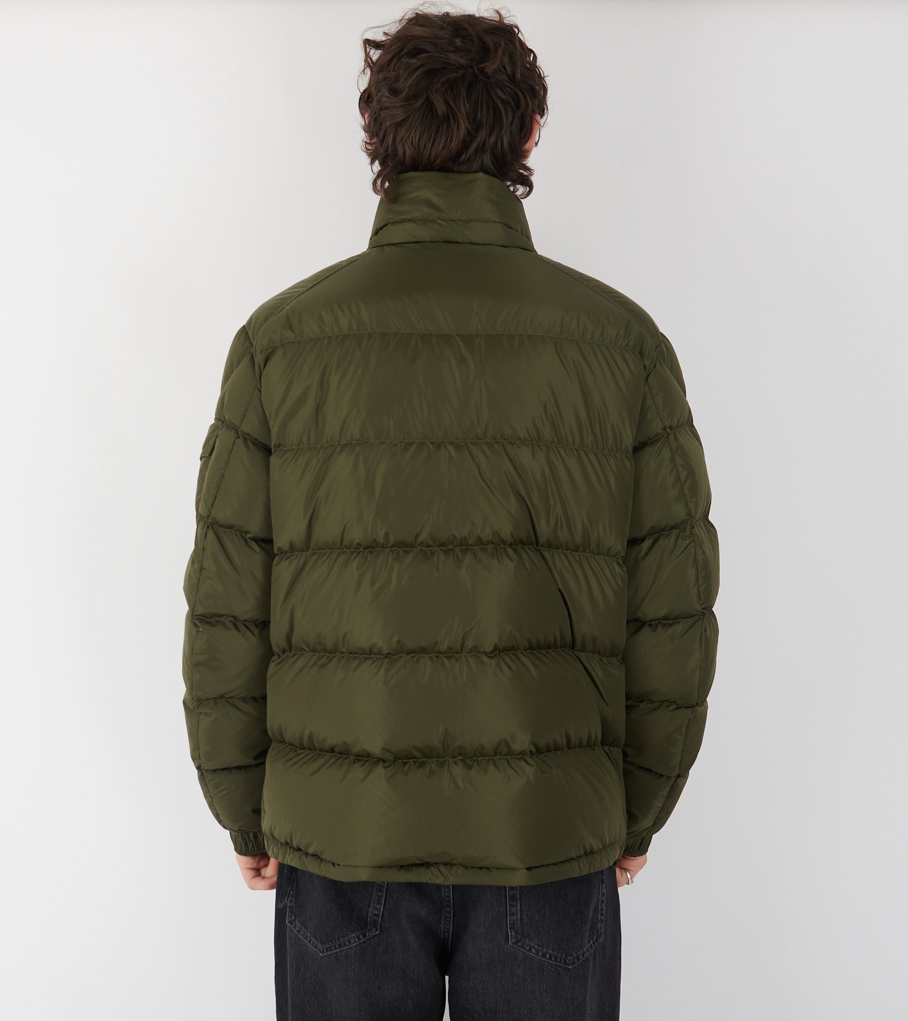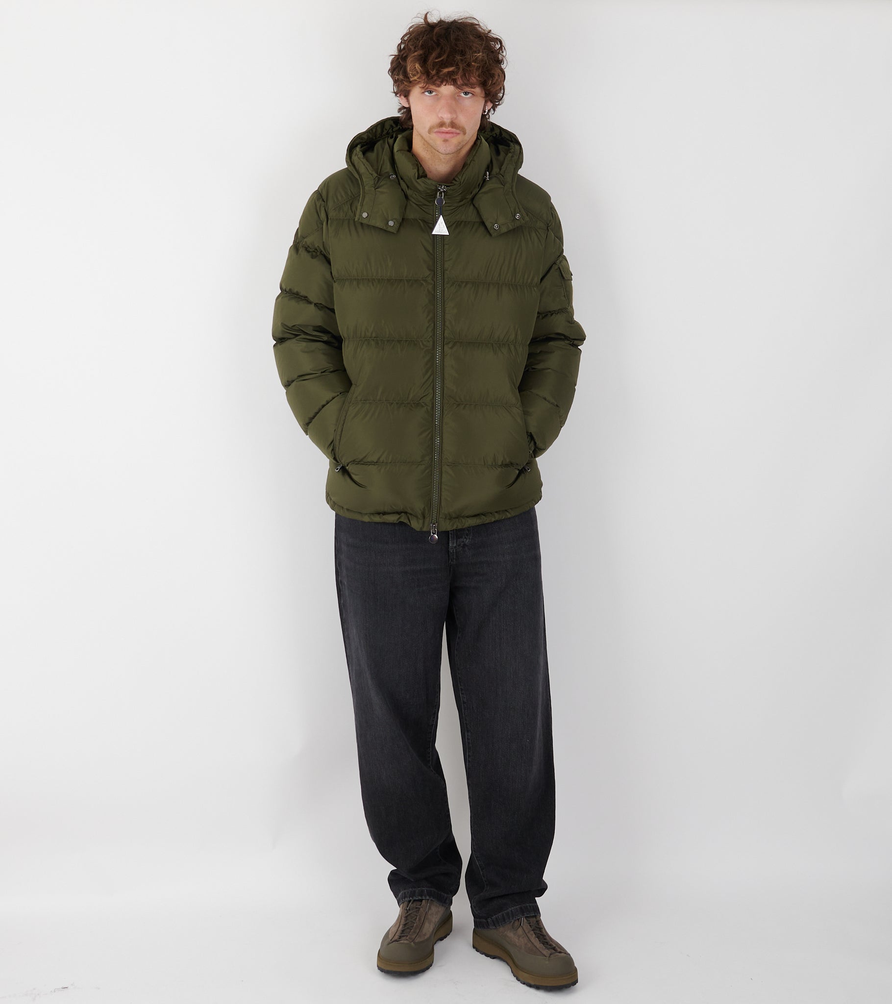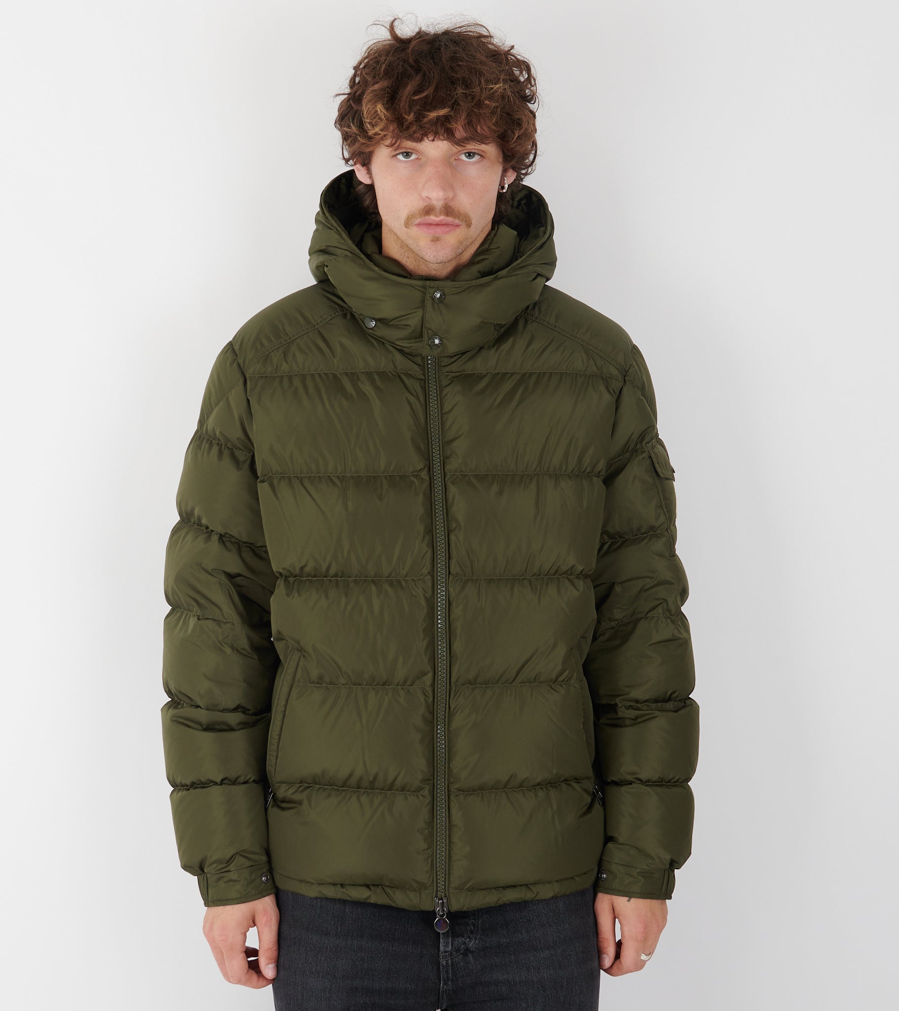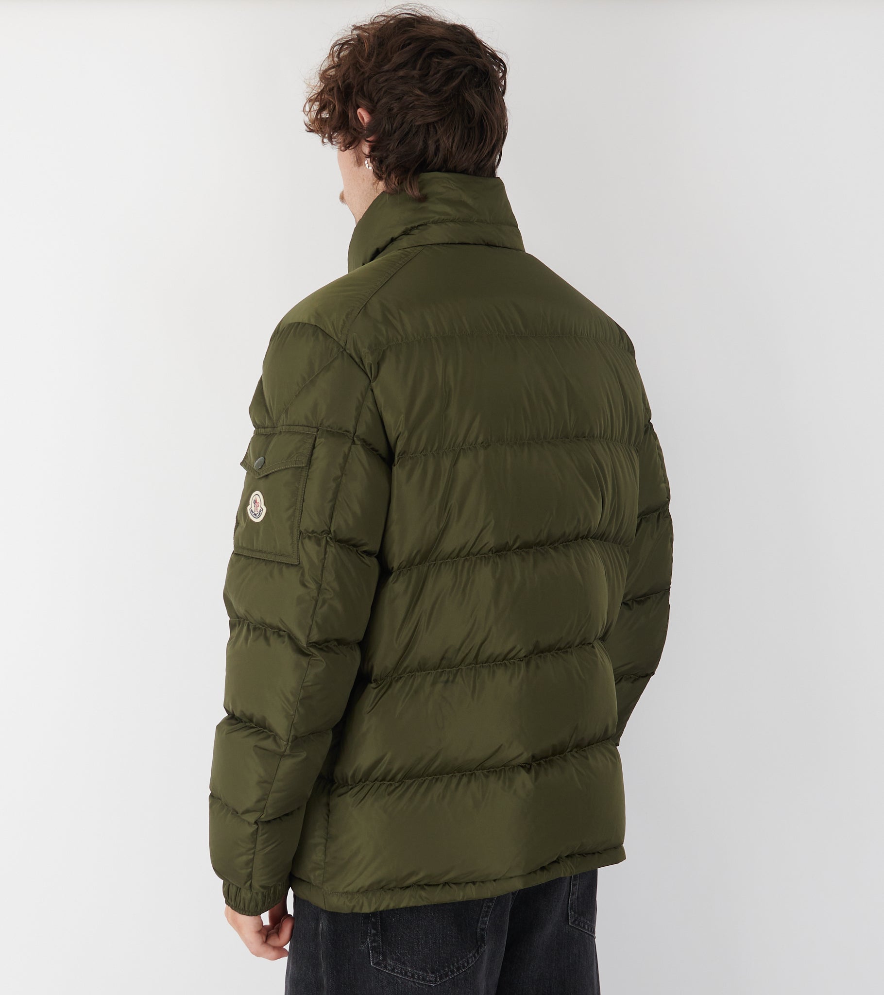 Olive green down jacket from Moncler.